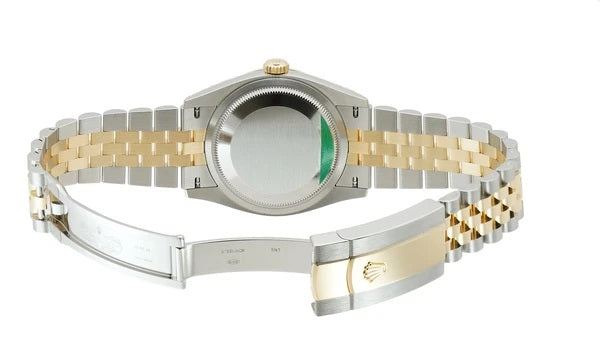 The case is stainless steel with brushed lugs and polished sides. The bezel is 18k yellow gold set with 52 original Rolex factory diamonds. The crown is also 18k yellow gold and screws down into the watch to keep it water-resistant up to 100 meters (330 feet). The caseback screws down as well and is solid stainless steel.