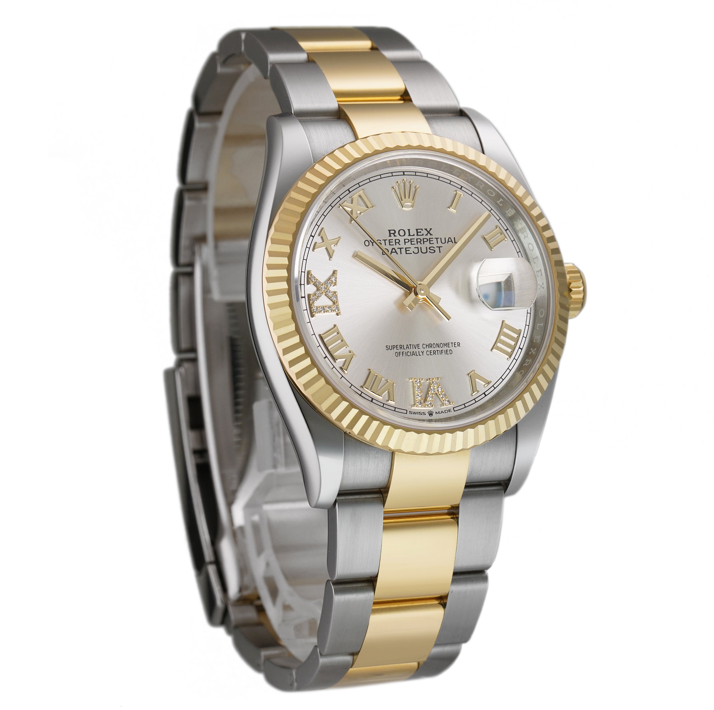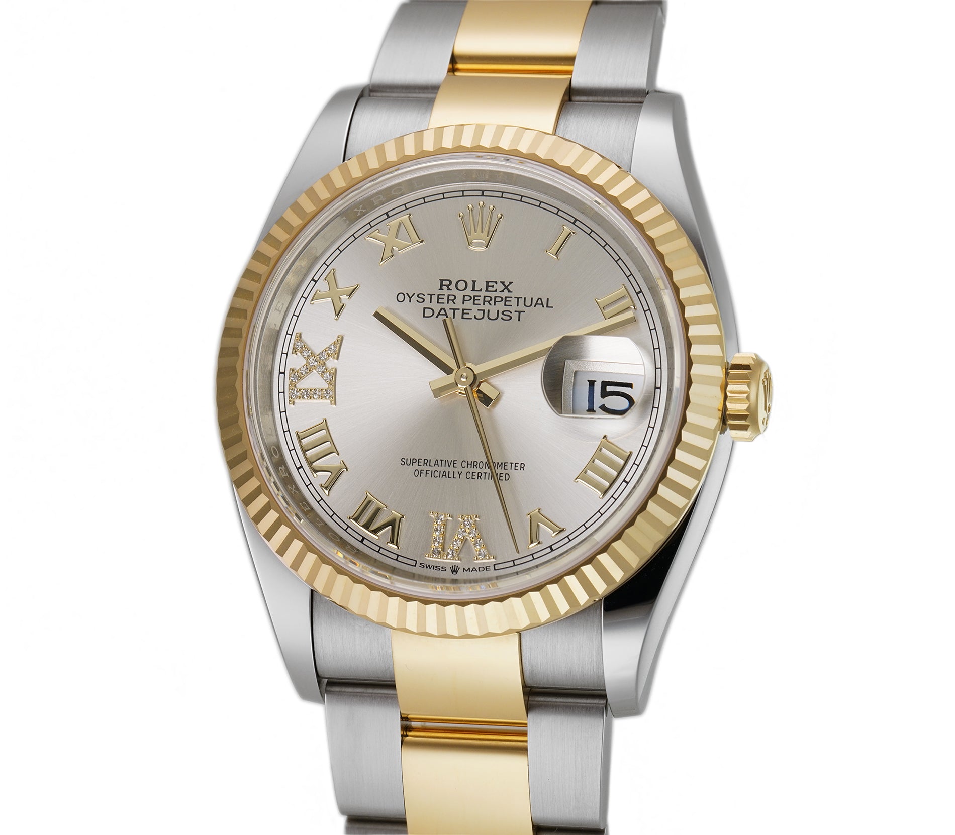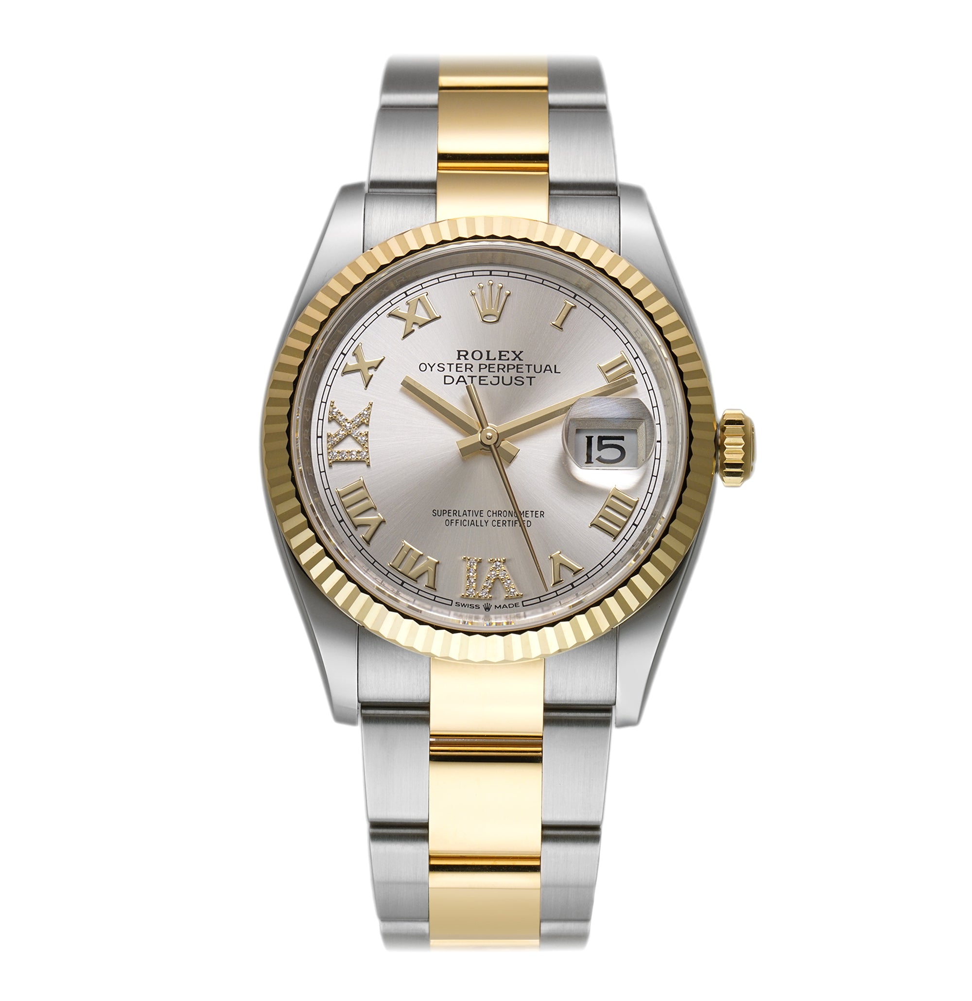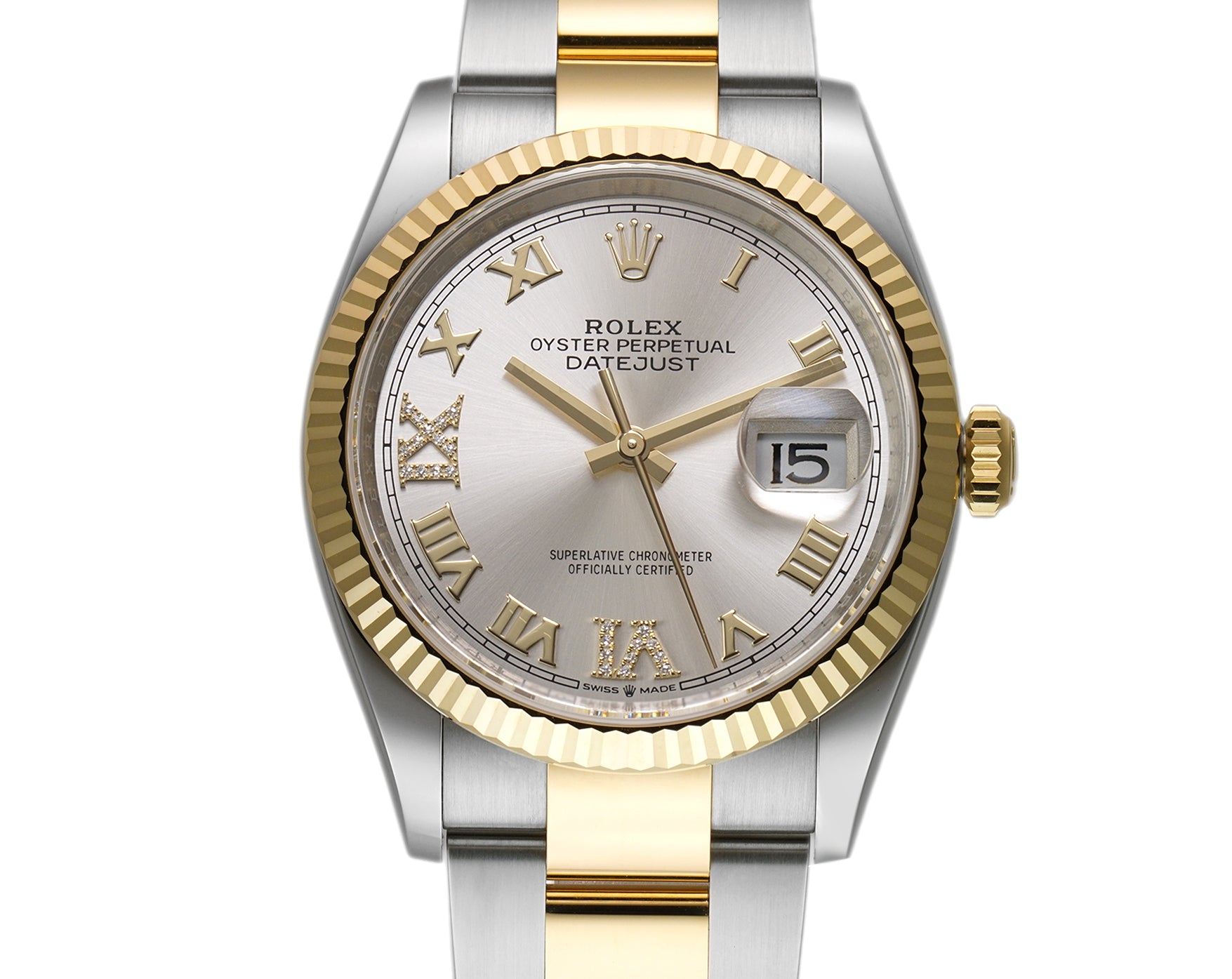36mm Steel & Yellow Gold Fluted Bezel Silver Roman Diamond VI & IX Dial Oyster Bracelet