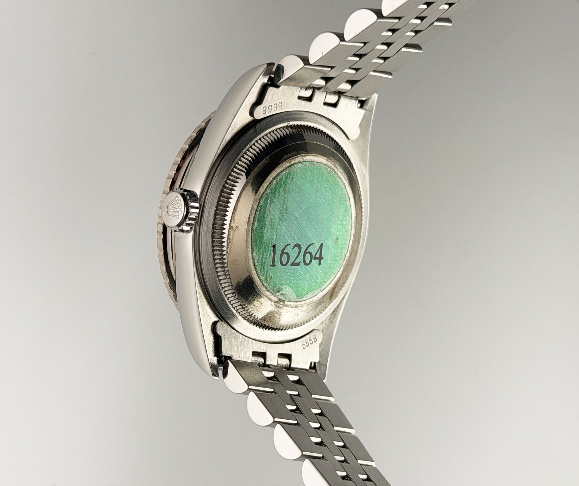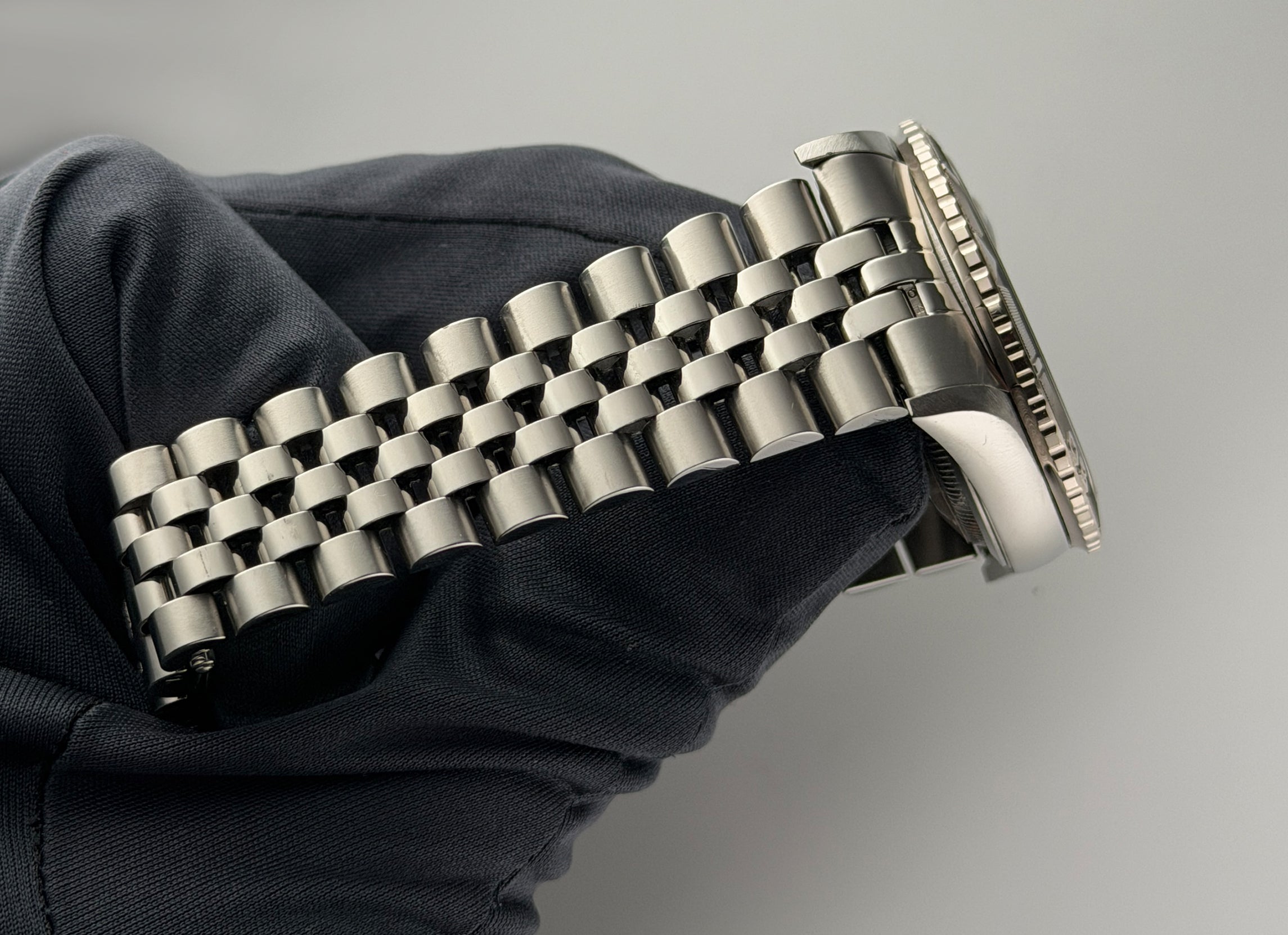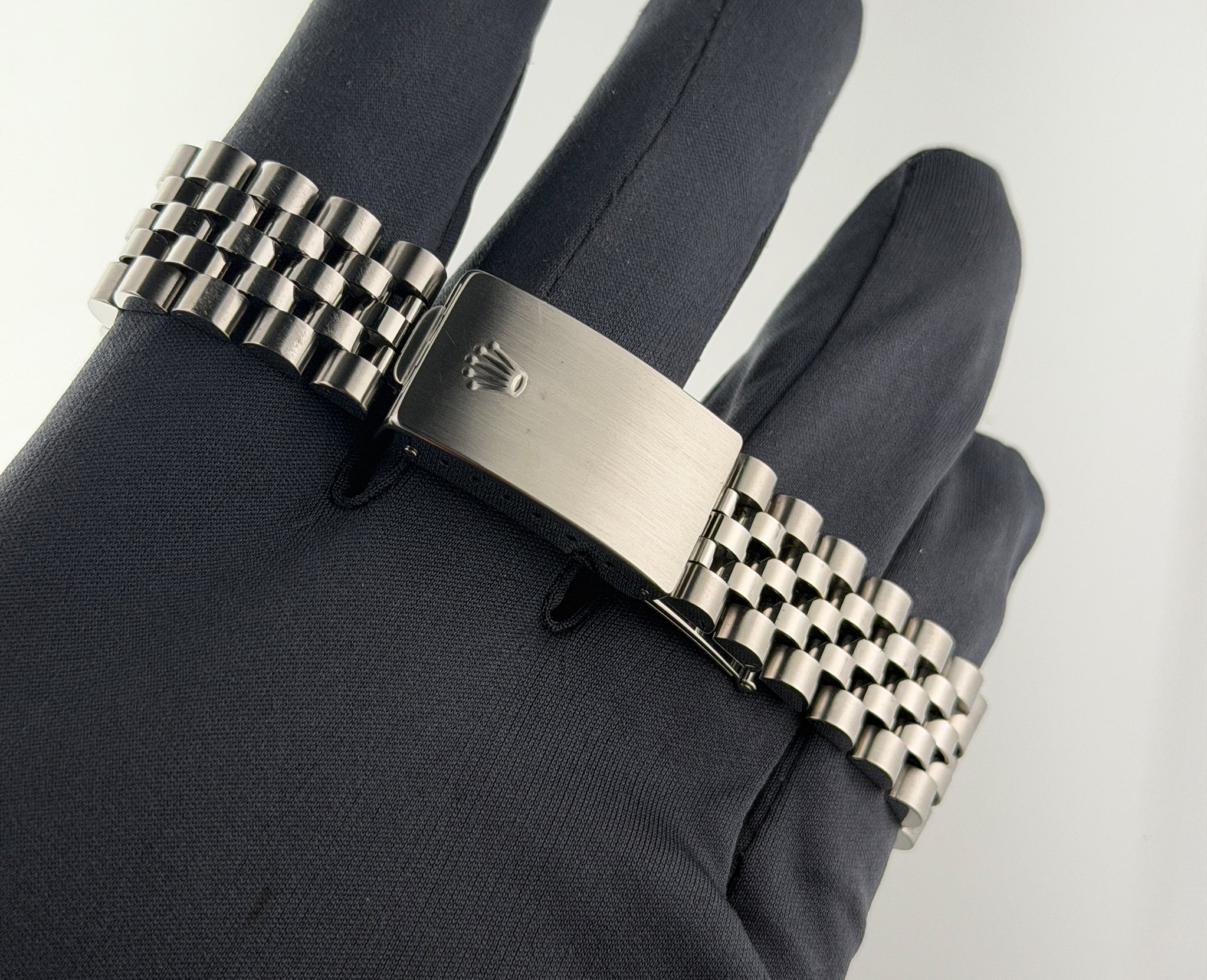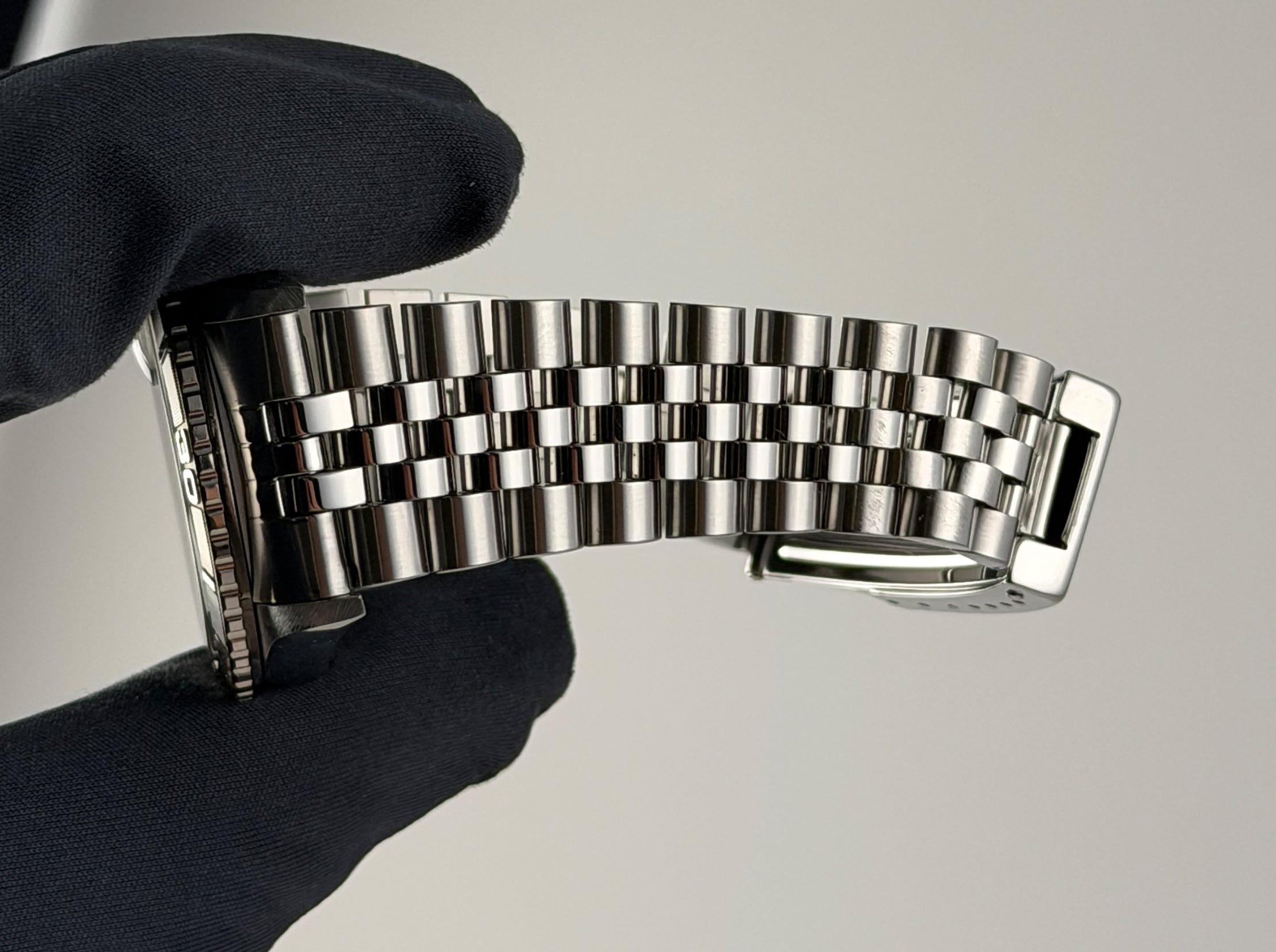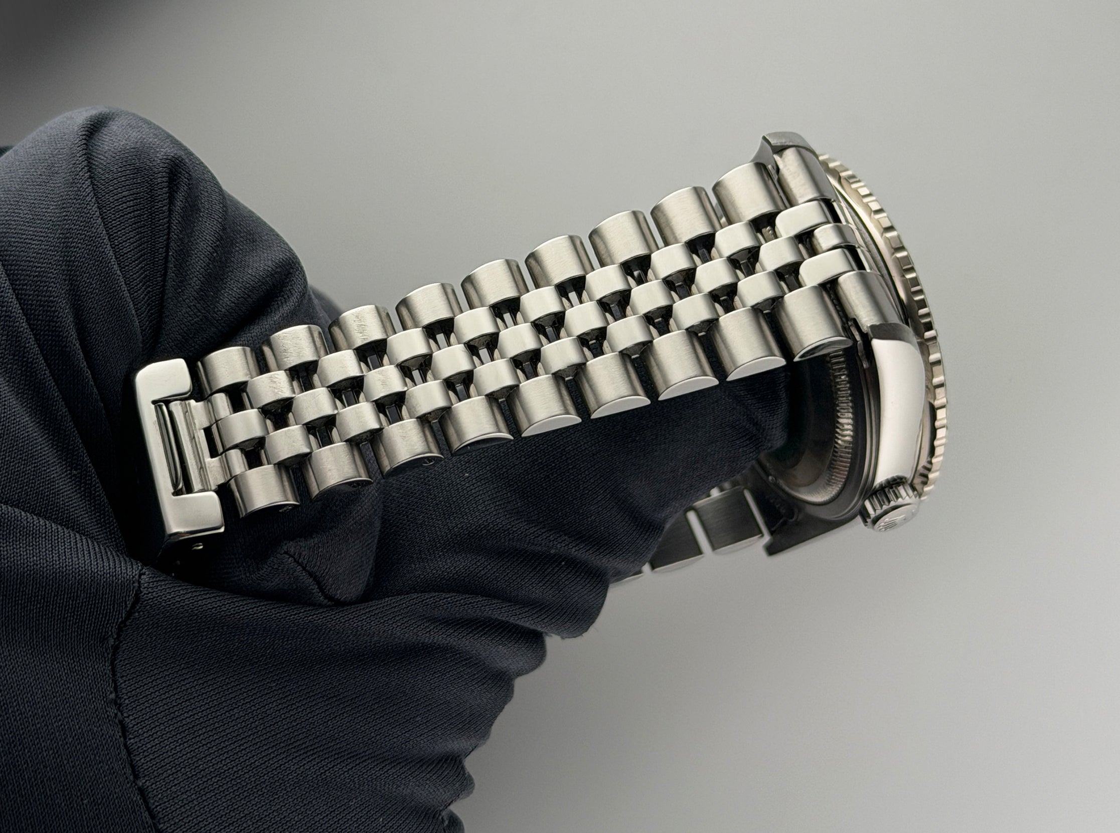 The case is made of stainless steel with satin finished lugs and mirror finished sides. The bezel mounted atop is 18k white gold and features an engine turned finish with a 60-minute counter scale. It is paired with a Rolex jubilee bracelet in stainless steel, also displaying a combination of satin and mirror finishes. The bracelet fits up to an approximate 7.5 inch wrist.