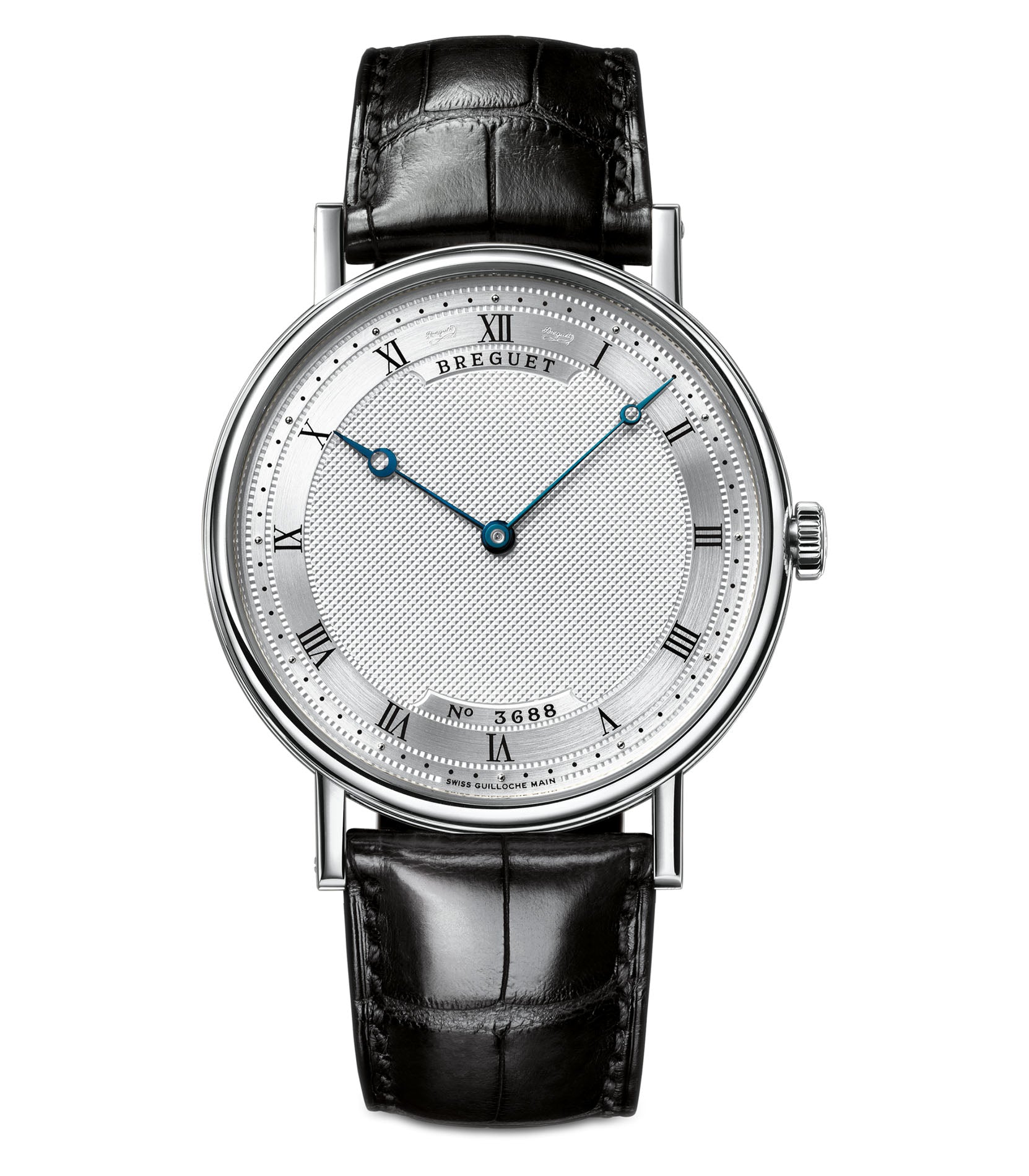 Functions are shown on a silver guilloche dial with blue hands and roman hour markers. These functions include hours and minutes.