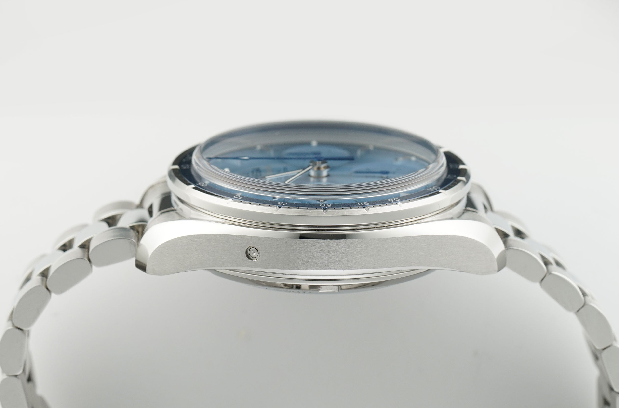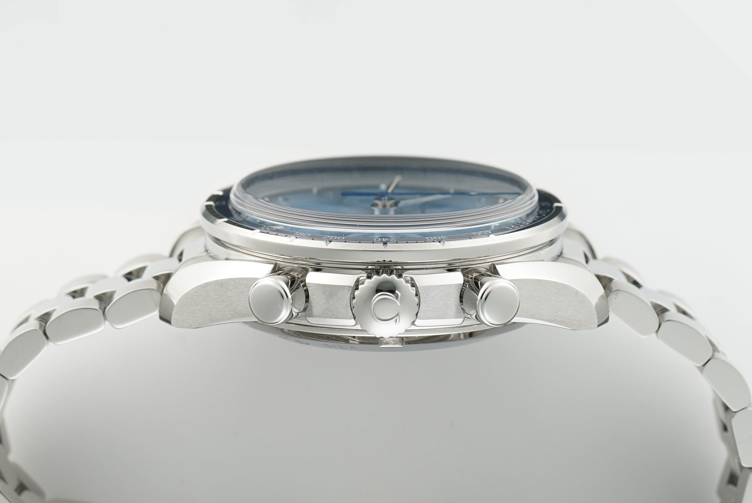Functions are displayed on a light blue dial that is accompanied by luminescent filled hands and index hour markers with luminous dots above. Those functions include hours, minutes, sub-seconds, date and a 3 register chronograph.