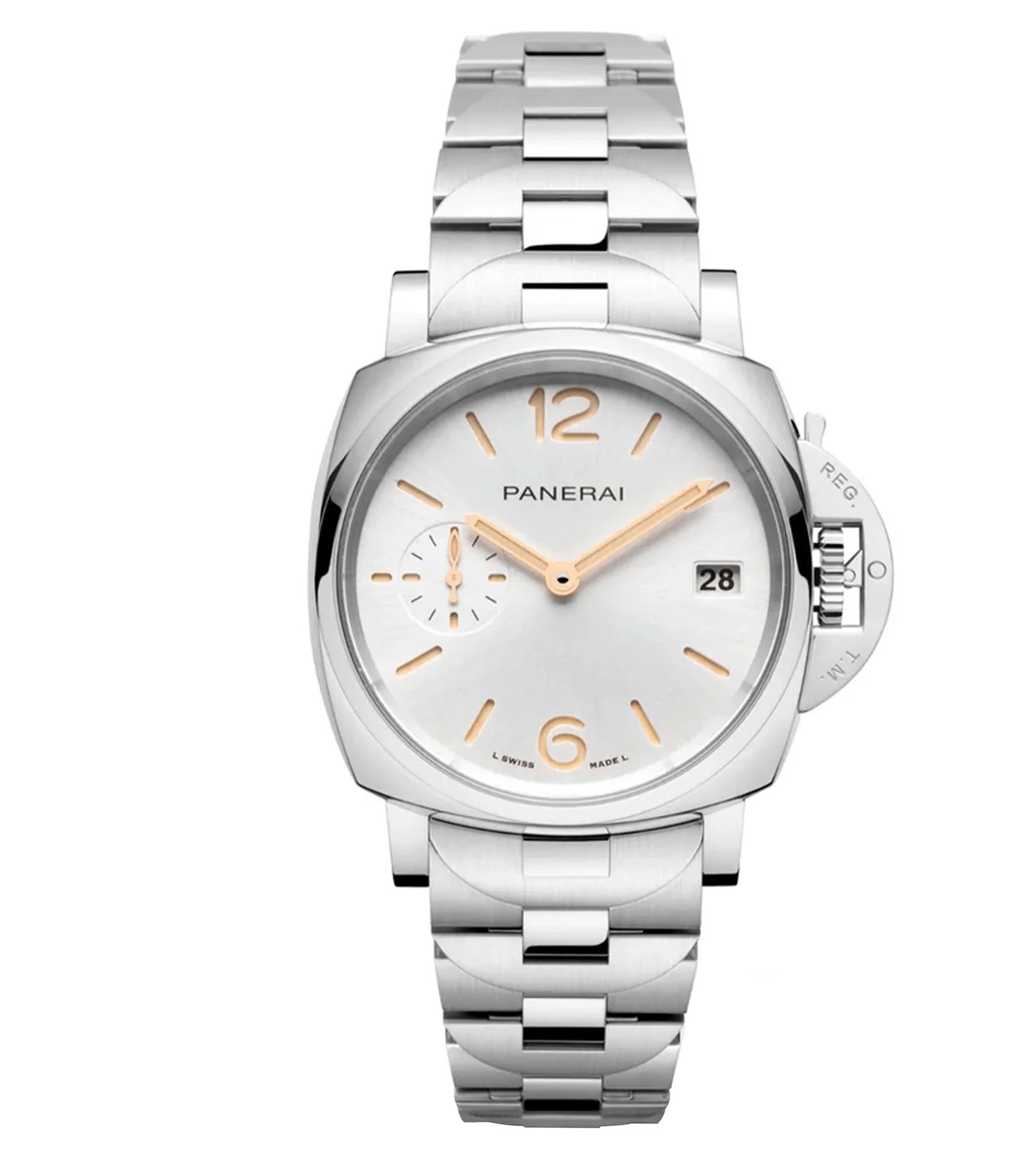 Functions are shown on a white sun-brushed dial with luminous hands and hour markers. These functions include hours, minutes, sub-seconds, and date.