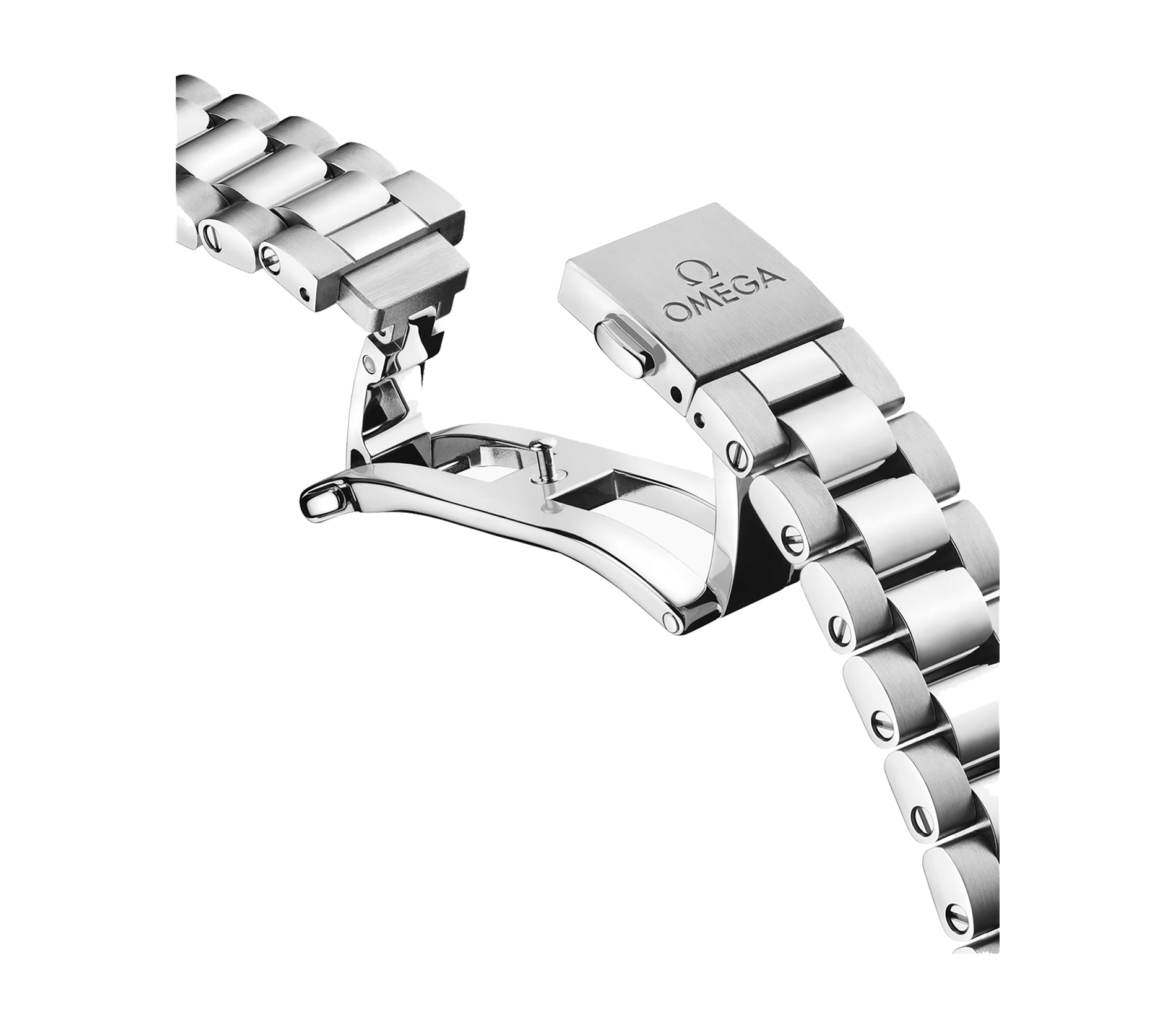 Case is made of combination of mirror and satin finish stainless steel, the crown is mirror finish with a wave-edged design featured on the case back. Mounted atop the case is a mirror finish stainless steel bezel. Paired with the watch is a combination of mirror and satin finish stainless steel bracelet with a stainless steel butterfly clasp.