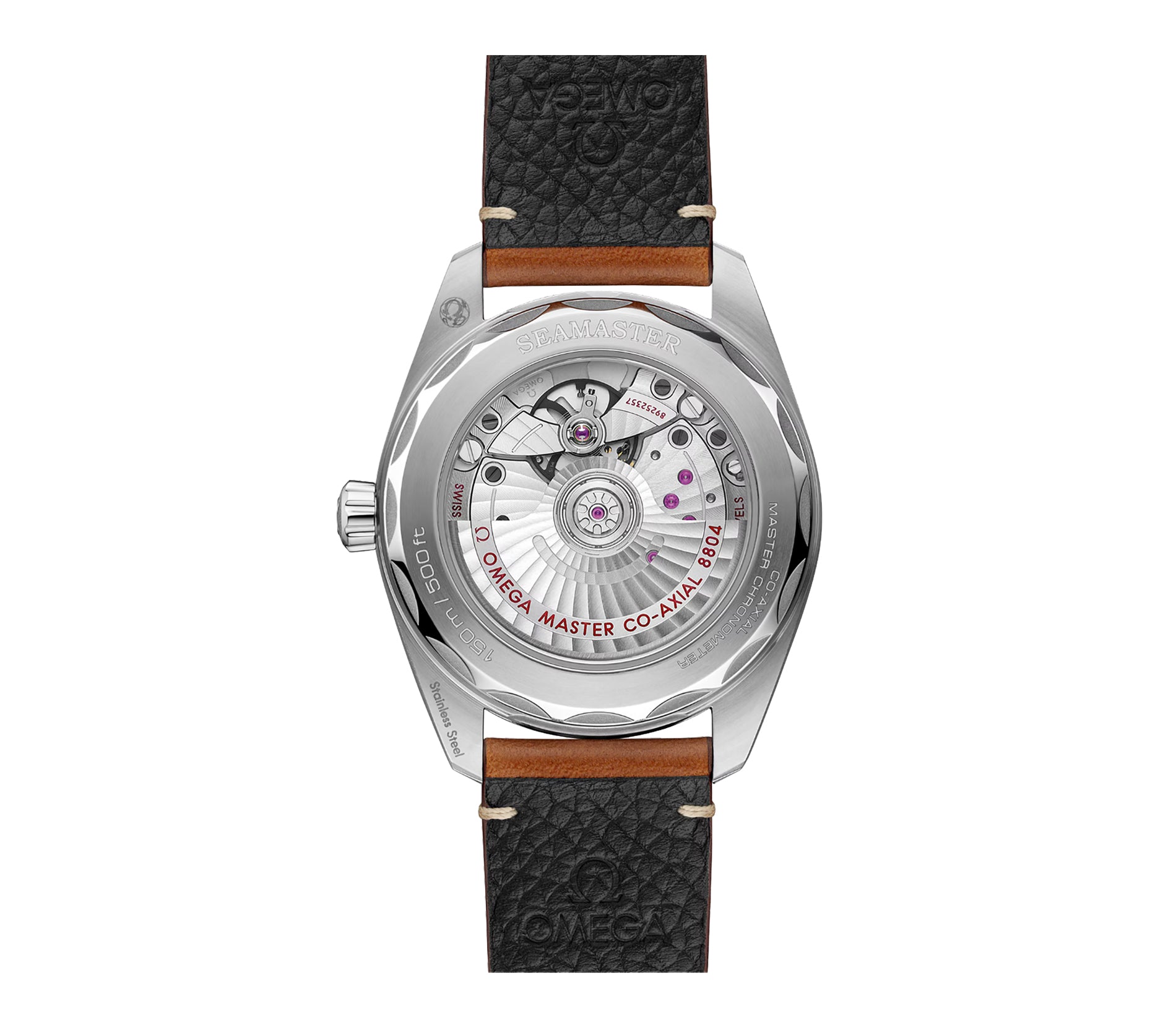 Case is made of combination of mirror and satin finish stainless steel, the crown is mirror finish with a wave-edged design featured on the case back. Mounted atop the case is a mirror finish stainless steel bezel. Paired with the watch is a brown leather strap with a stainless steel folding clasp.