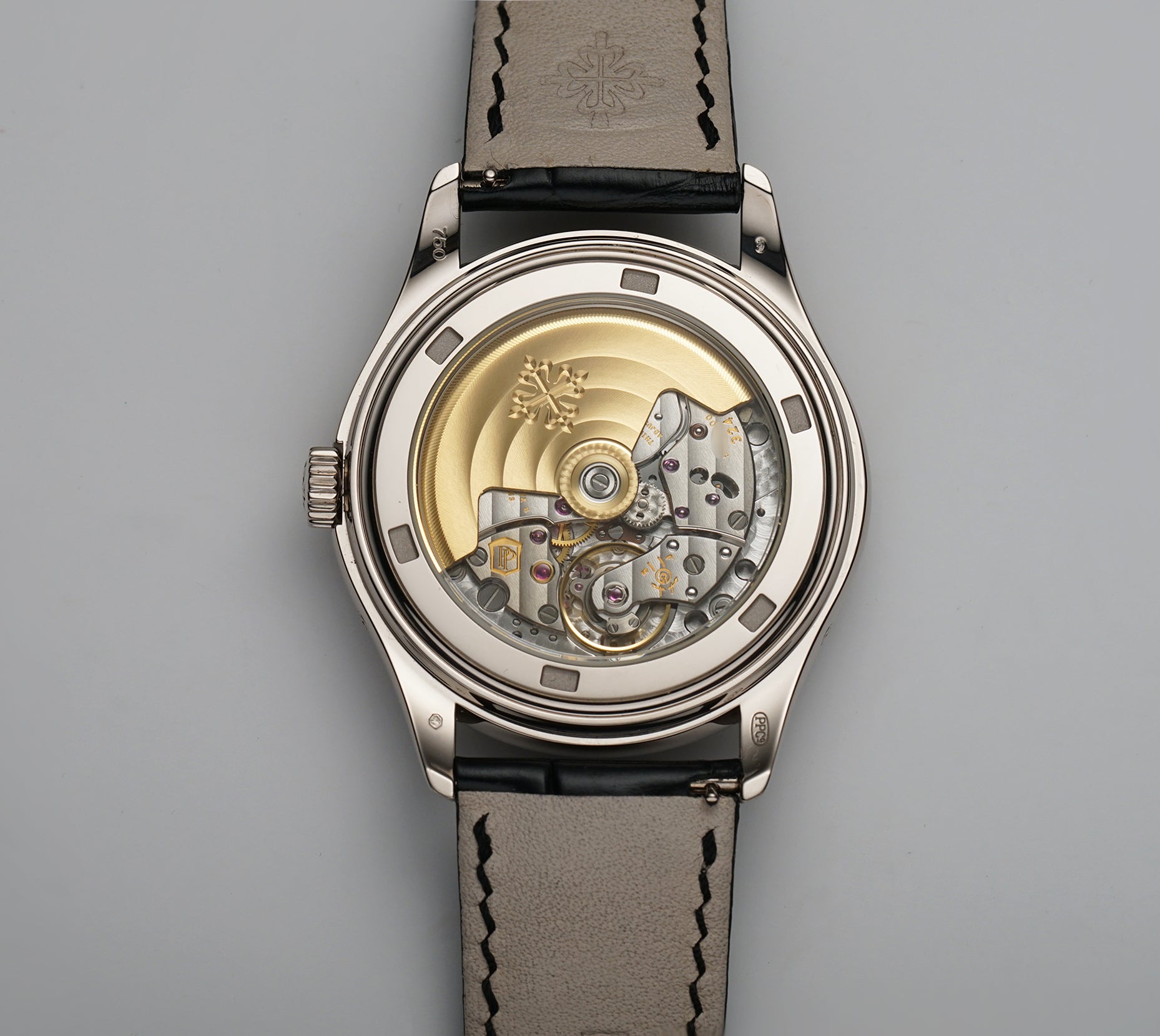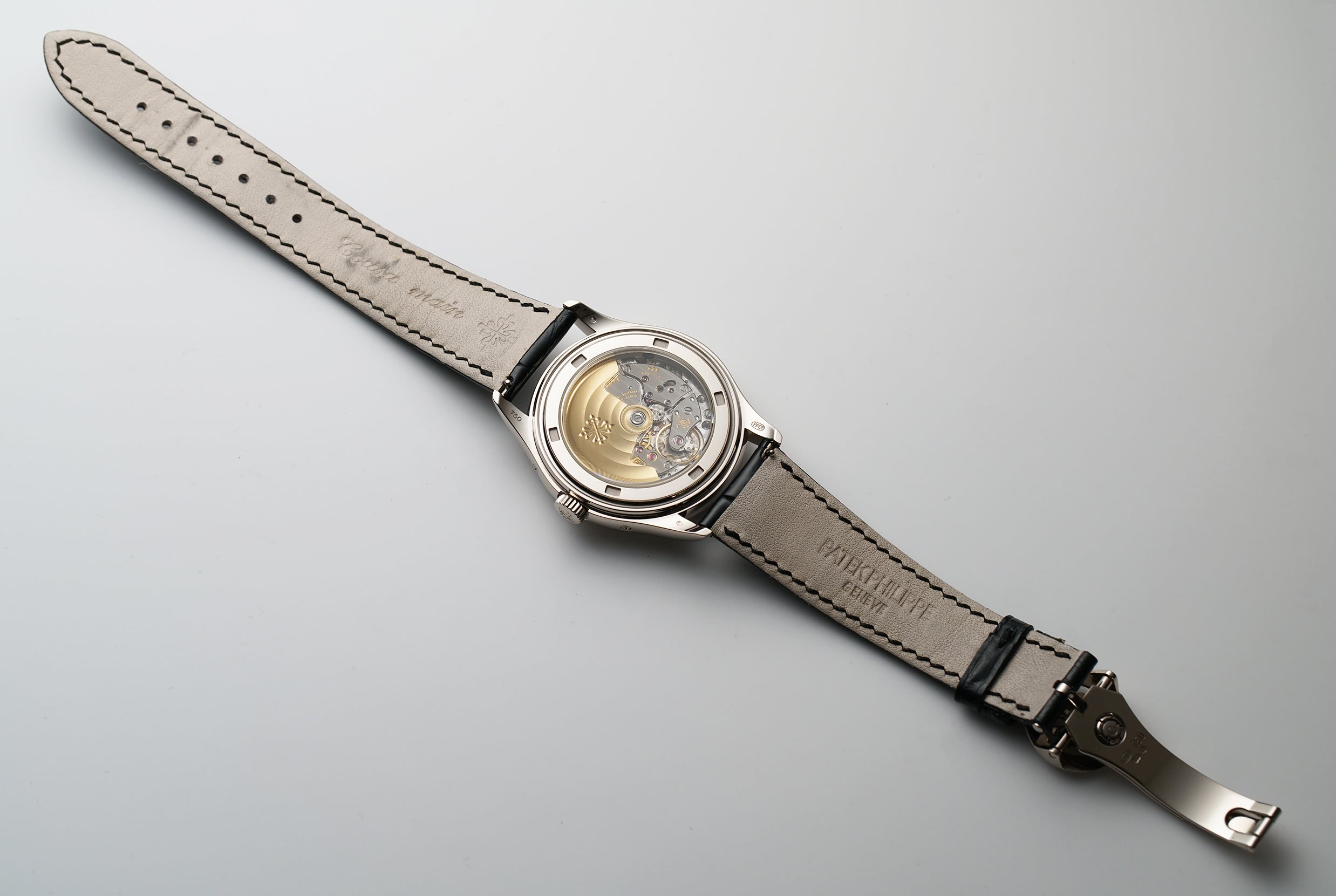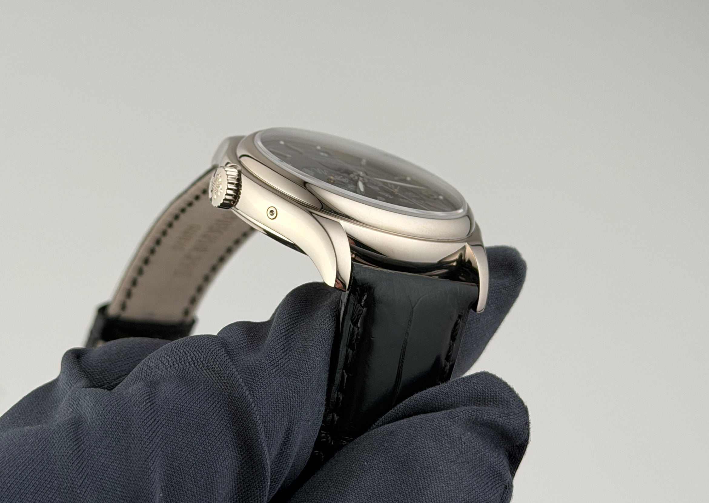 The case is of a mirror-finished 18k white gold, as is the bezel mounted atop. It is paired with a black leather Patek Philippe strap, which is in a 8/10 condition, and that is accompanied by an 18k white gold Patek Philippe deployment buckle.