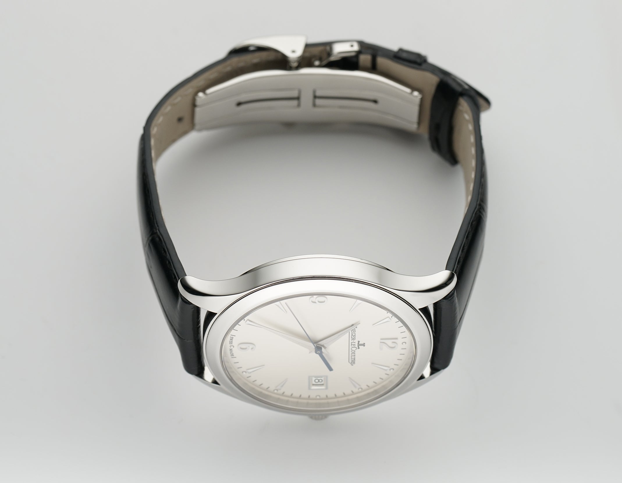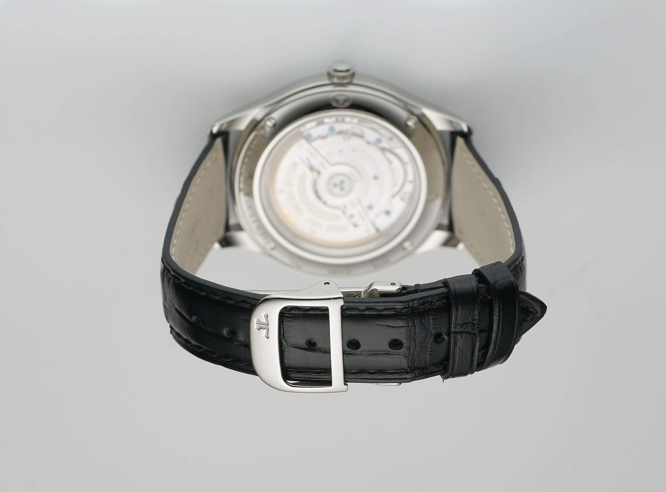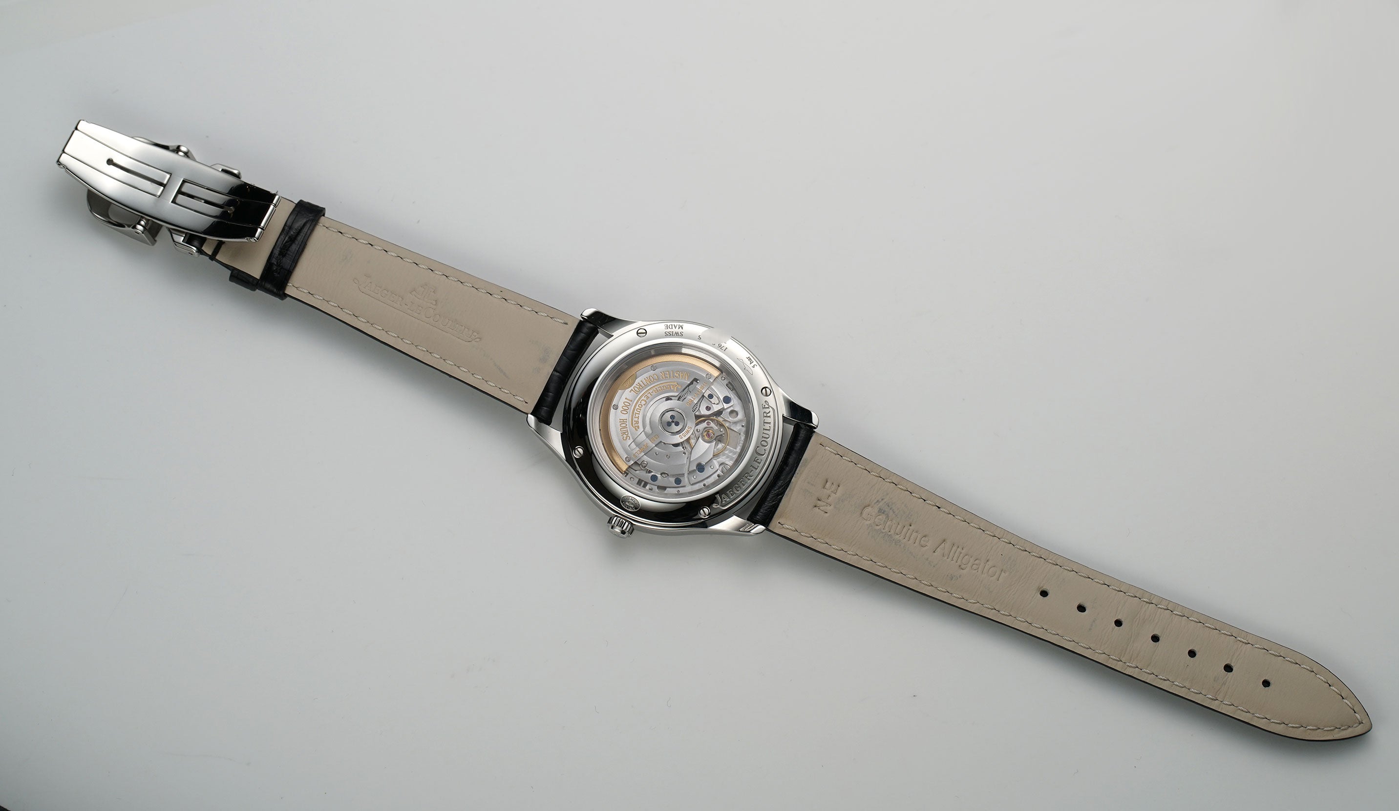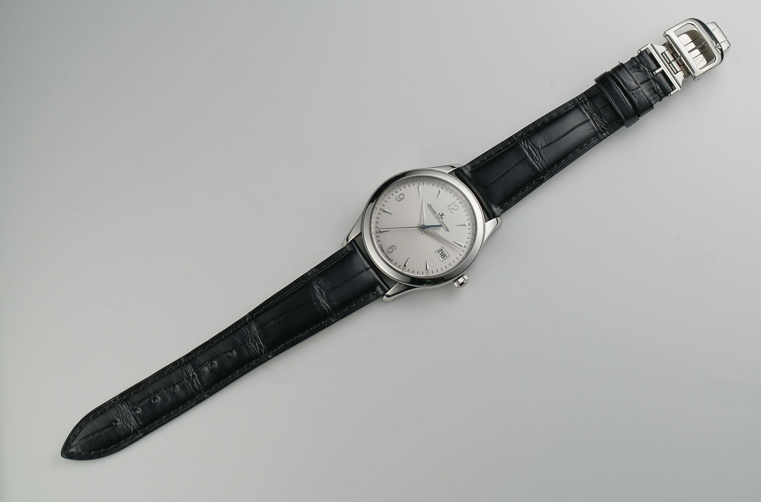The case is of a mirror-finished stainless steel, as is the bezel mounted atop. It is currently mounted on a JLC black leather strap (unworn condition) and that is paired with JLC stainless steel double-folding butterfly deployment clasp.