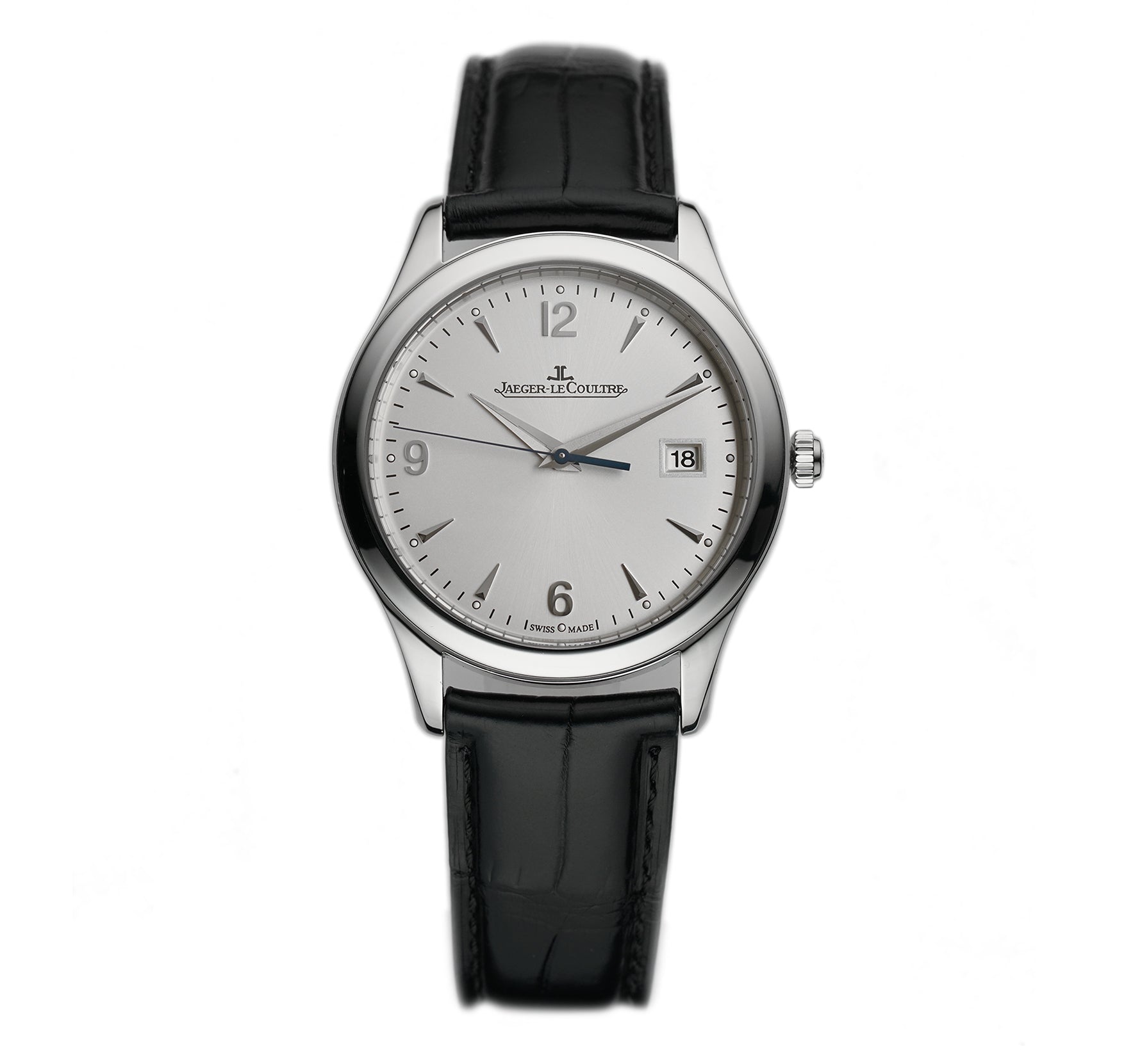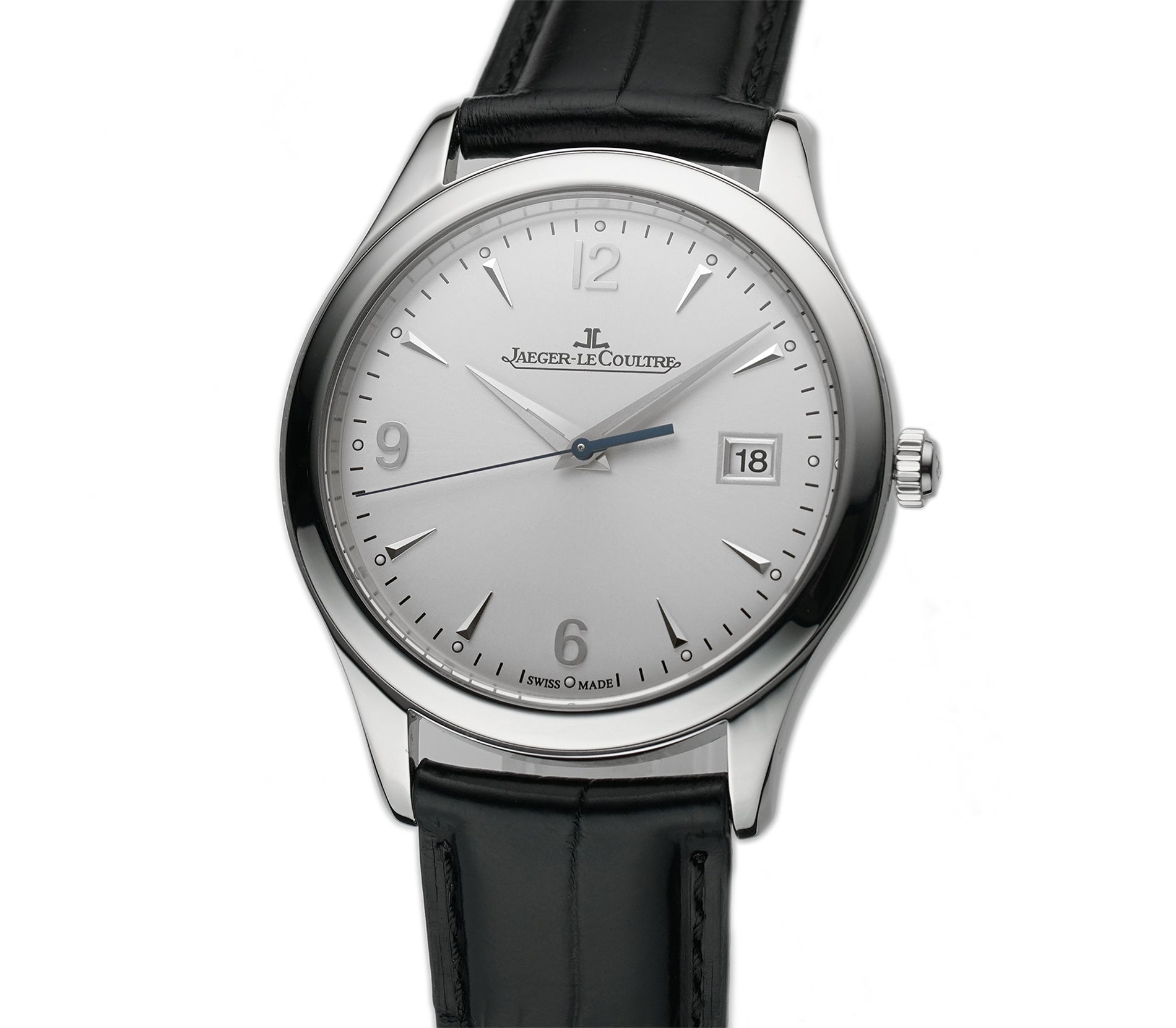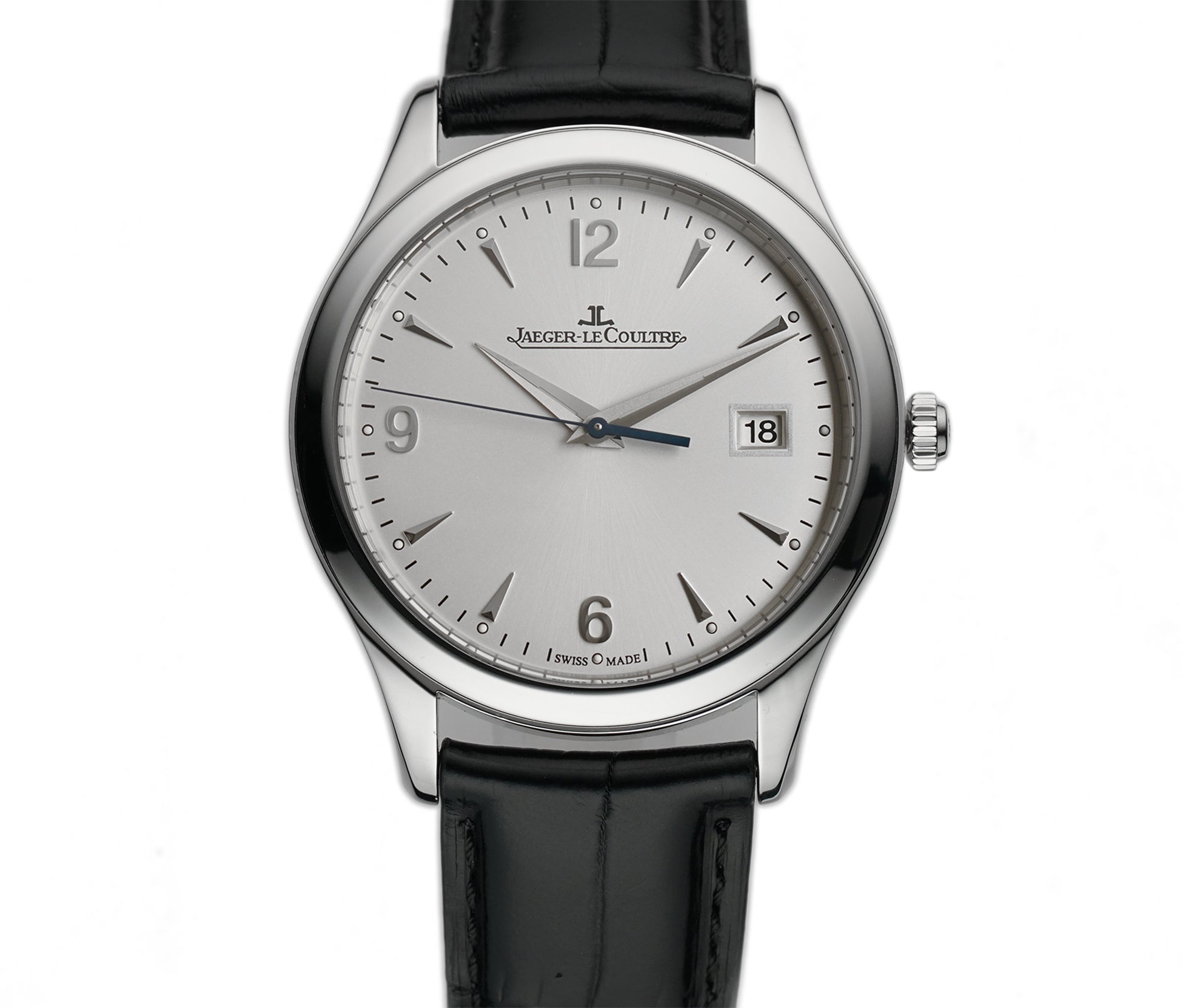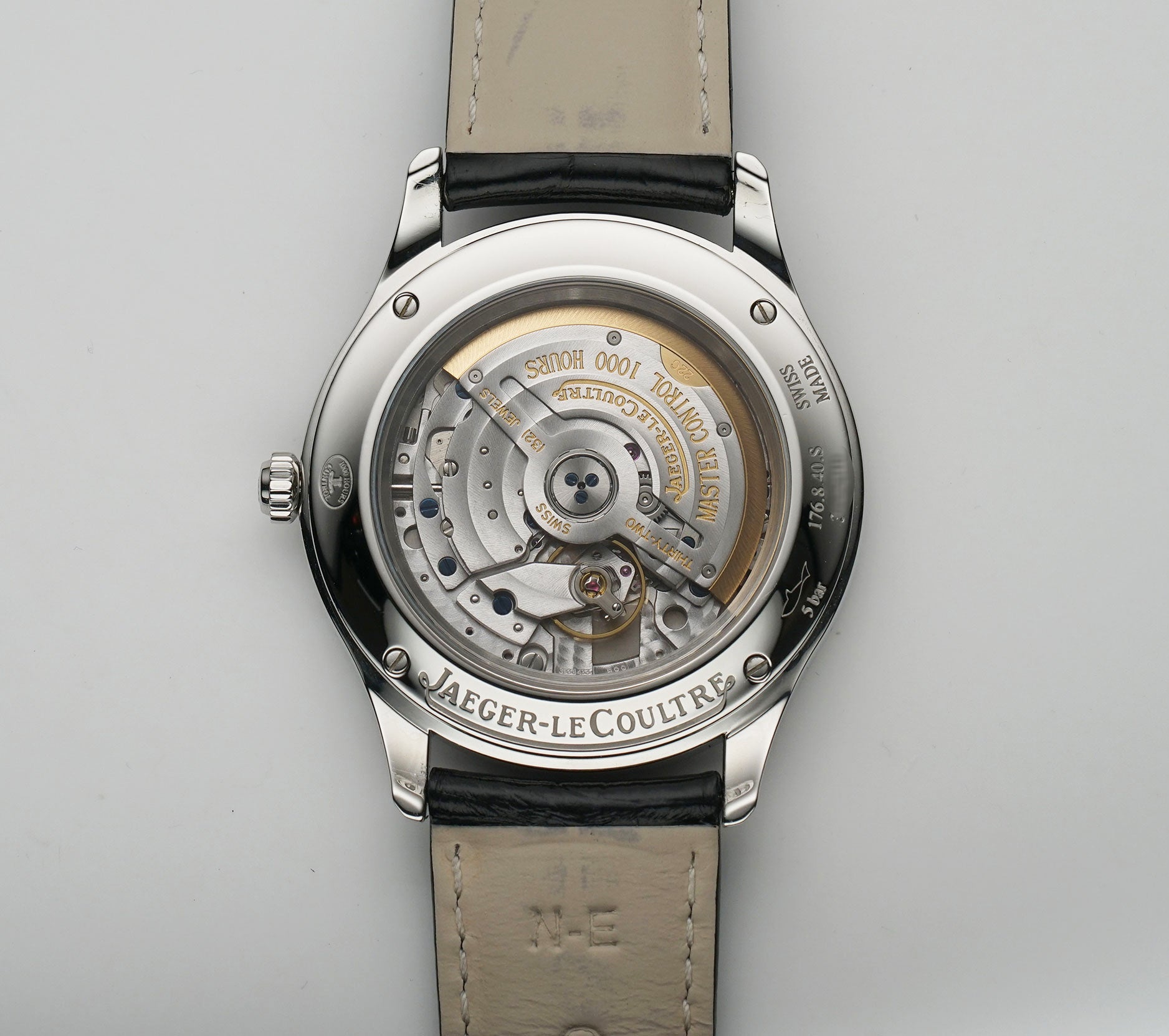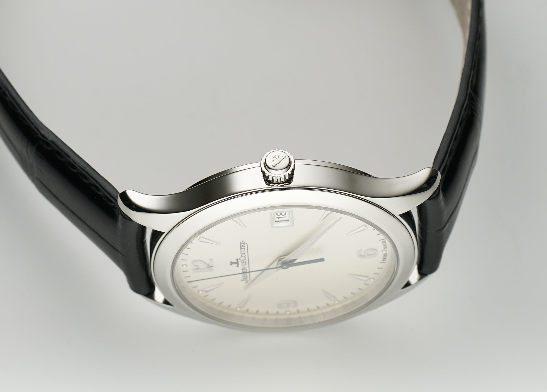 The case is of a mirror-finished stainless steel, as is the bezel mounted atop. It is currently mounted on a JLC black leather strap (unworn condition) and that is paired with JLC stainless steel double-folding butterfly deployment clasp.