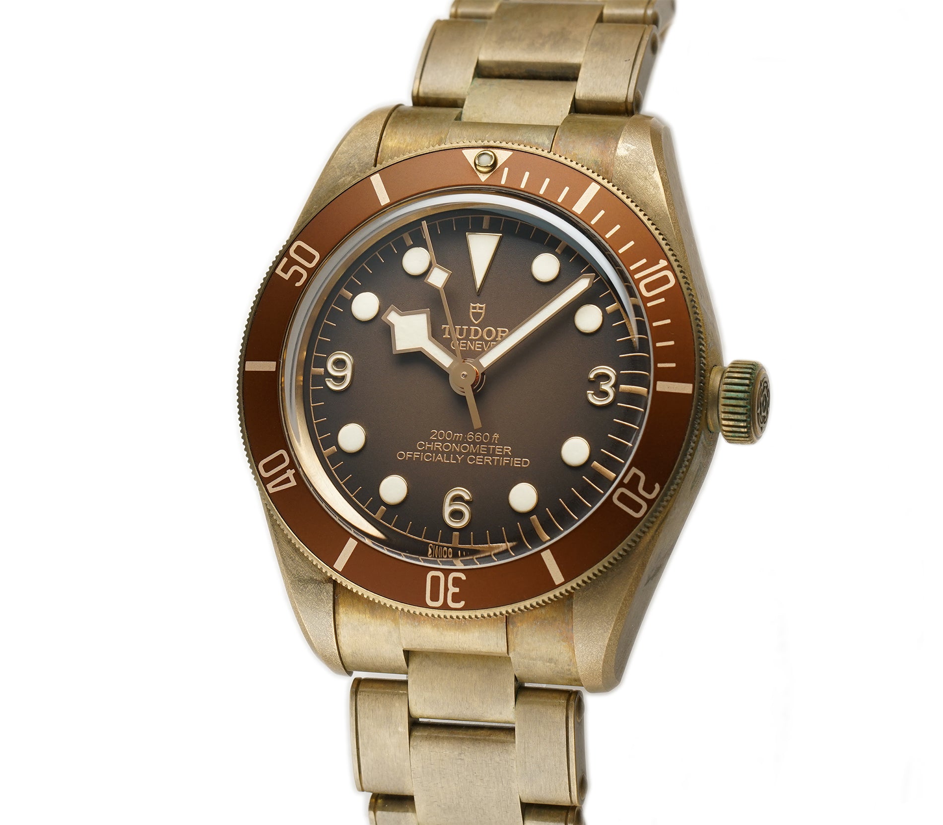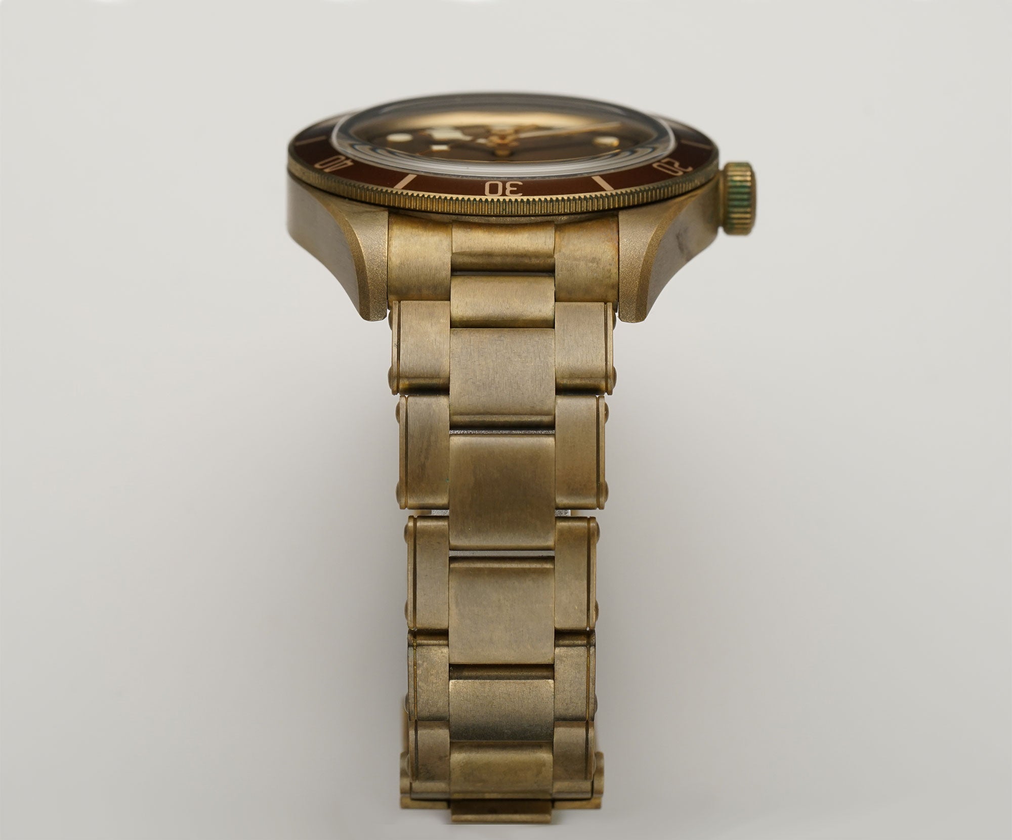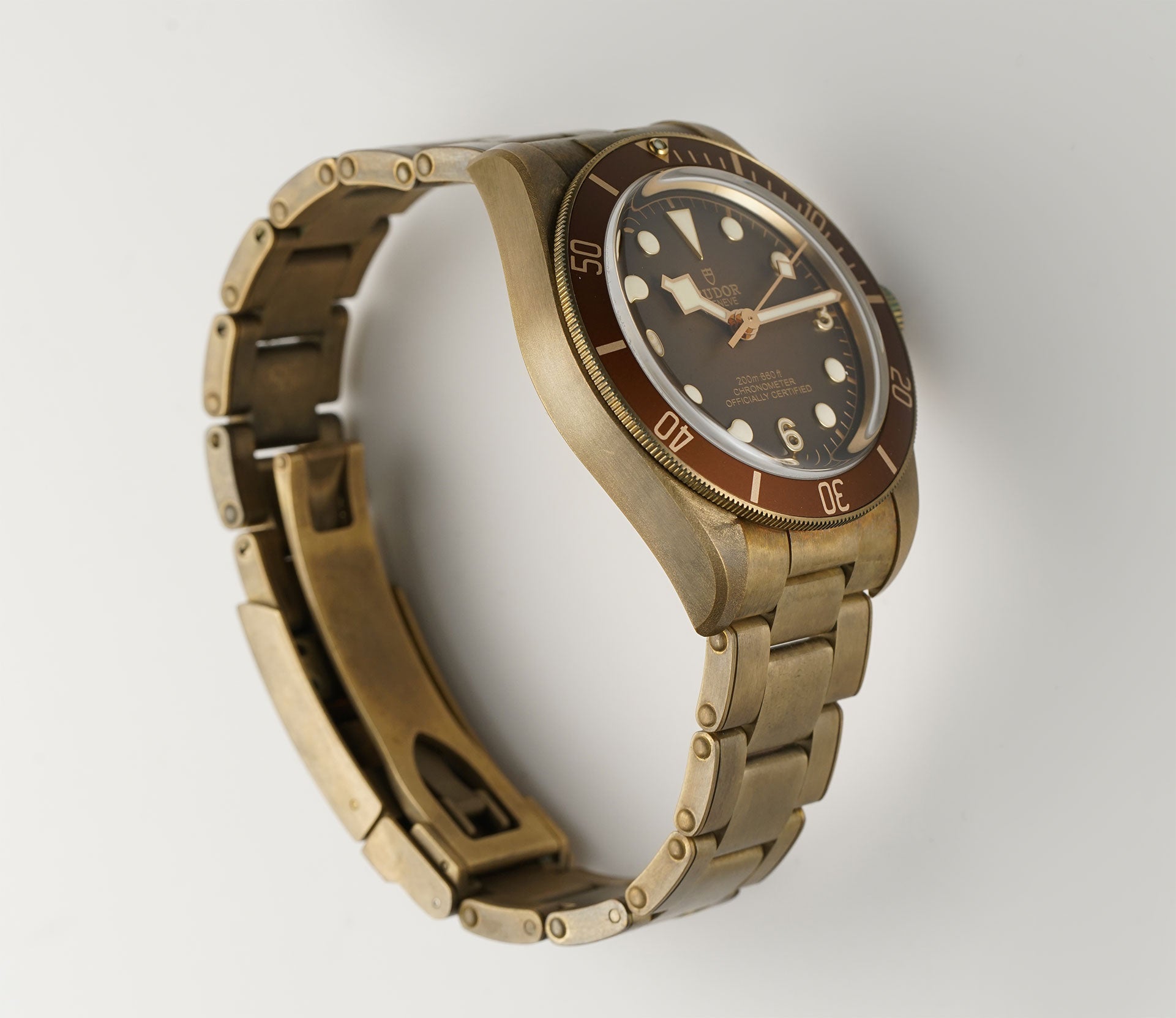 The case is made of a satin-finished bronze and it is equipped with a unidirectional brown diver's bezel. The bracelet is also of a satin-finished bronze and actually features Tudor's new clasp that allows for rapid adjustment of 5 positions (similar to Rolex and their glide-lock clasps).