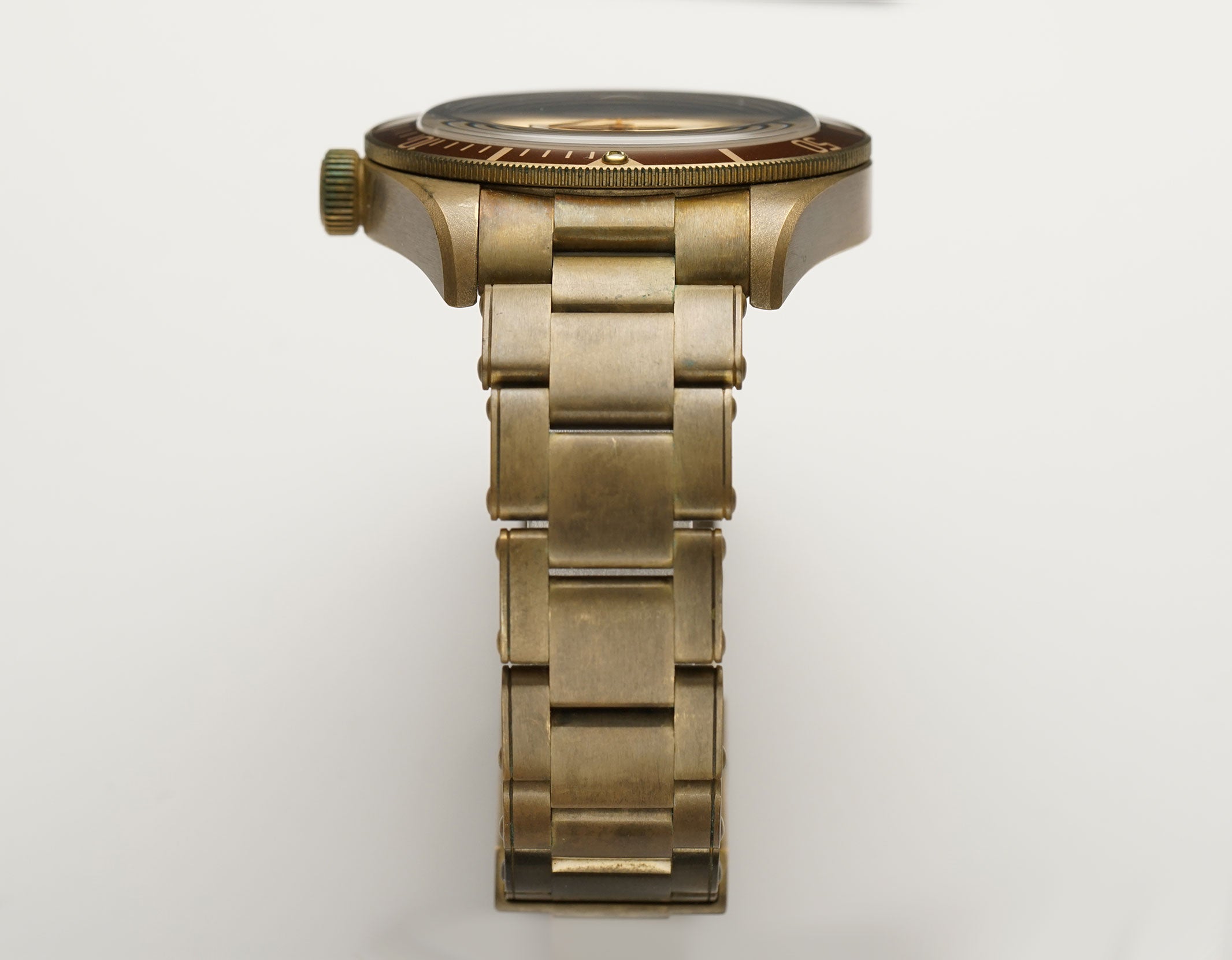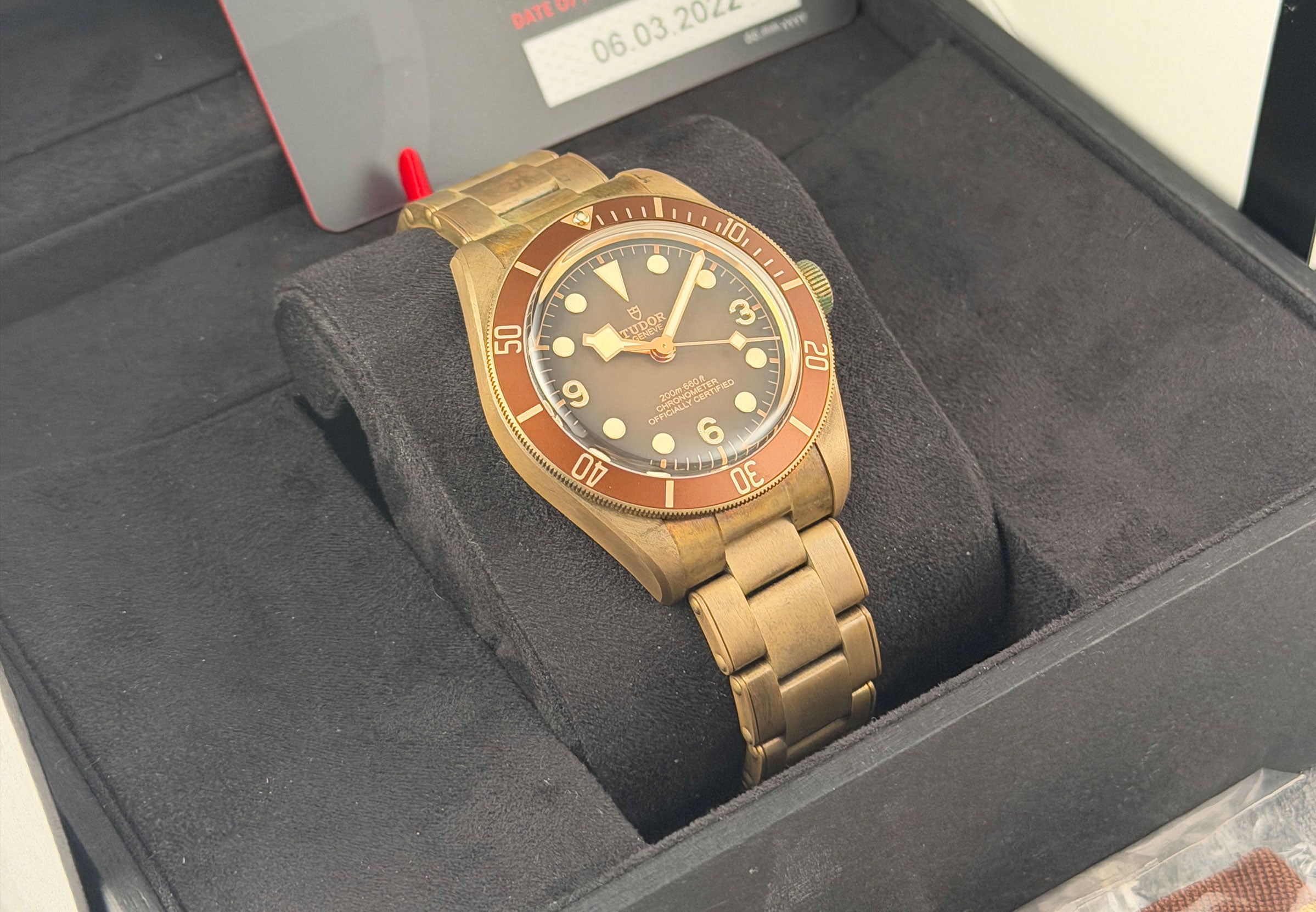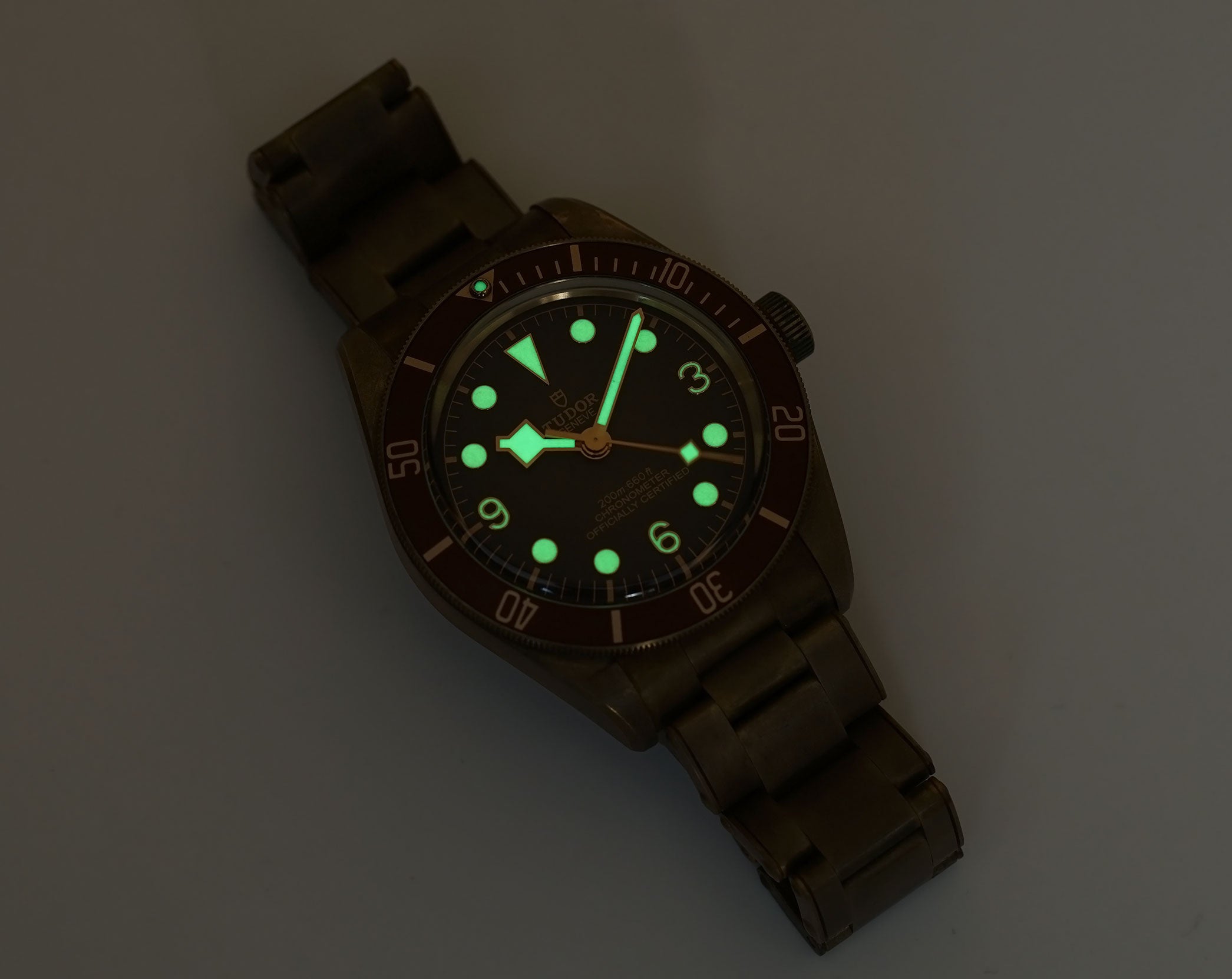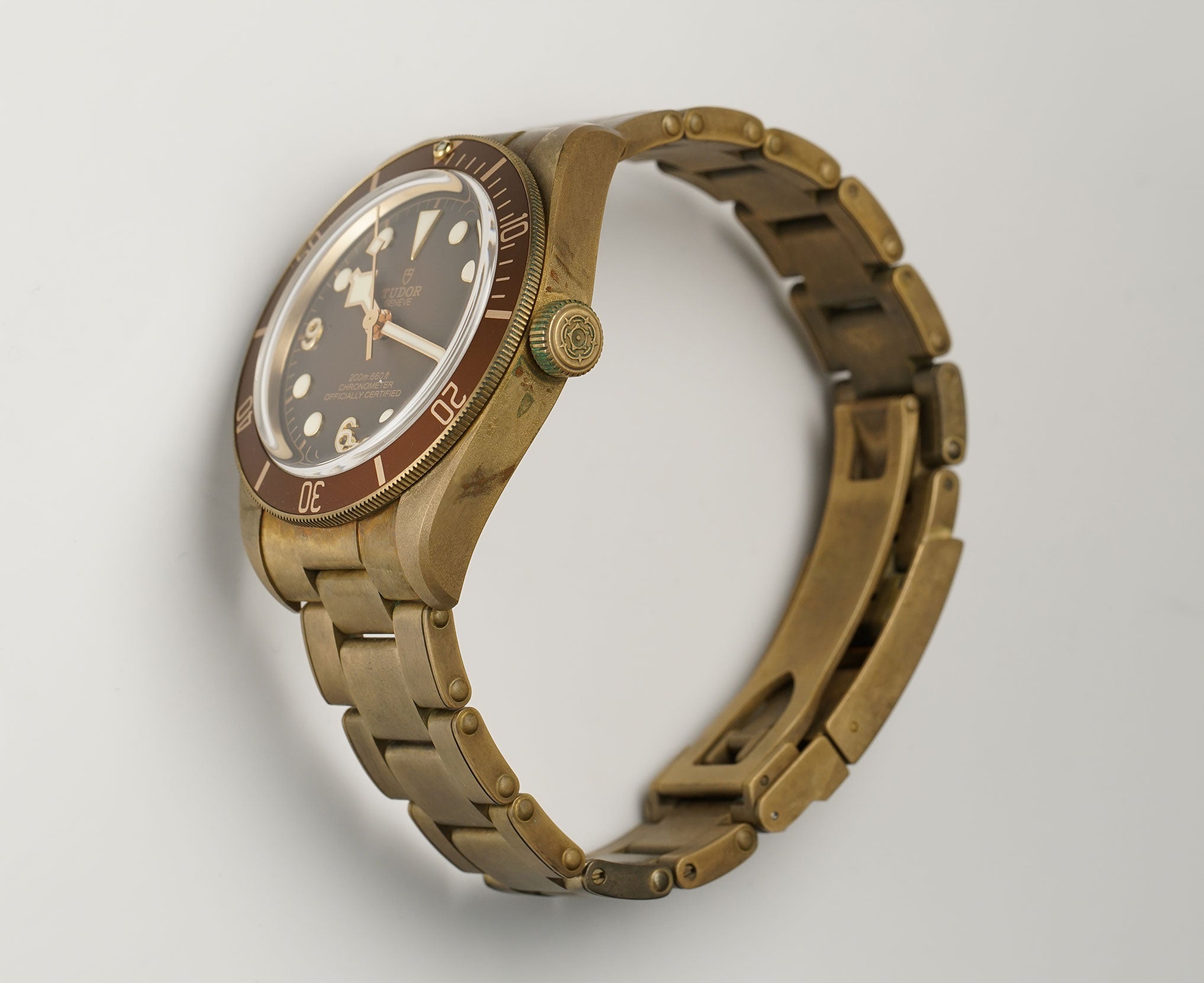 The case is made of a satin-finished bronze and it is equipped with a unidirectional brown diver's bezel. The bracelet is also of a satin-finished bronze and actually features Tudor's new clasp that allows for rapid adjustment of 5 positions (similar to Rolex and their glide-lock clasps).
