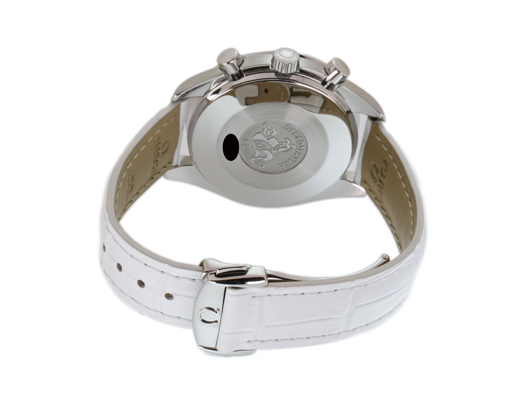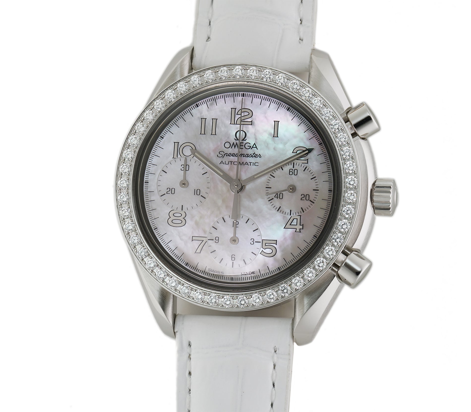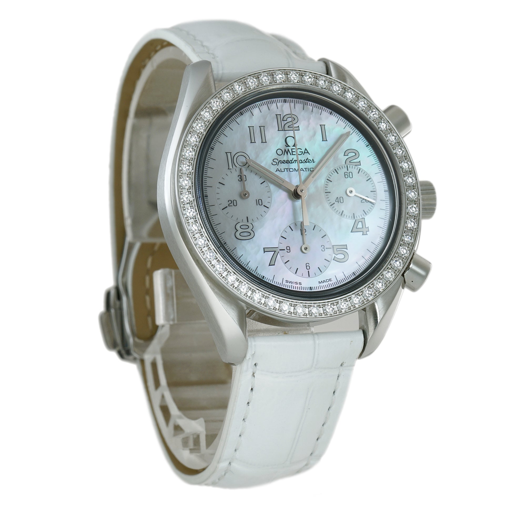 The case is comprised of stainless steel displaying a combination of satin and mirror-like finishes. Mounted atop the case is a stainless steel bezel that features an Omega factory set single-row of diamonds. Securing the watch onto the wrist is an unworn Omega white leather strap that is paired with an Omega stainless steel deployment buckle.