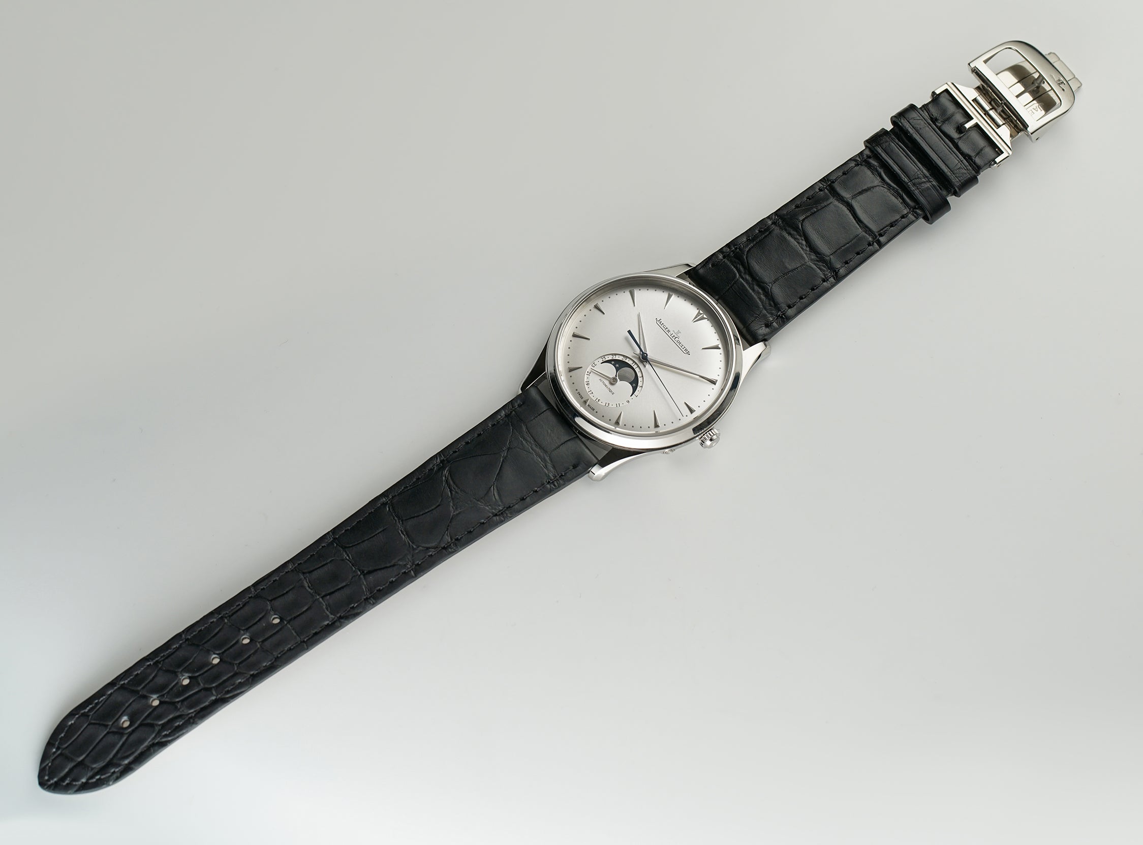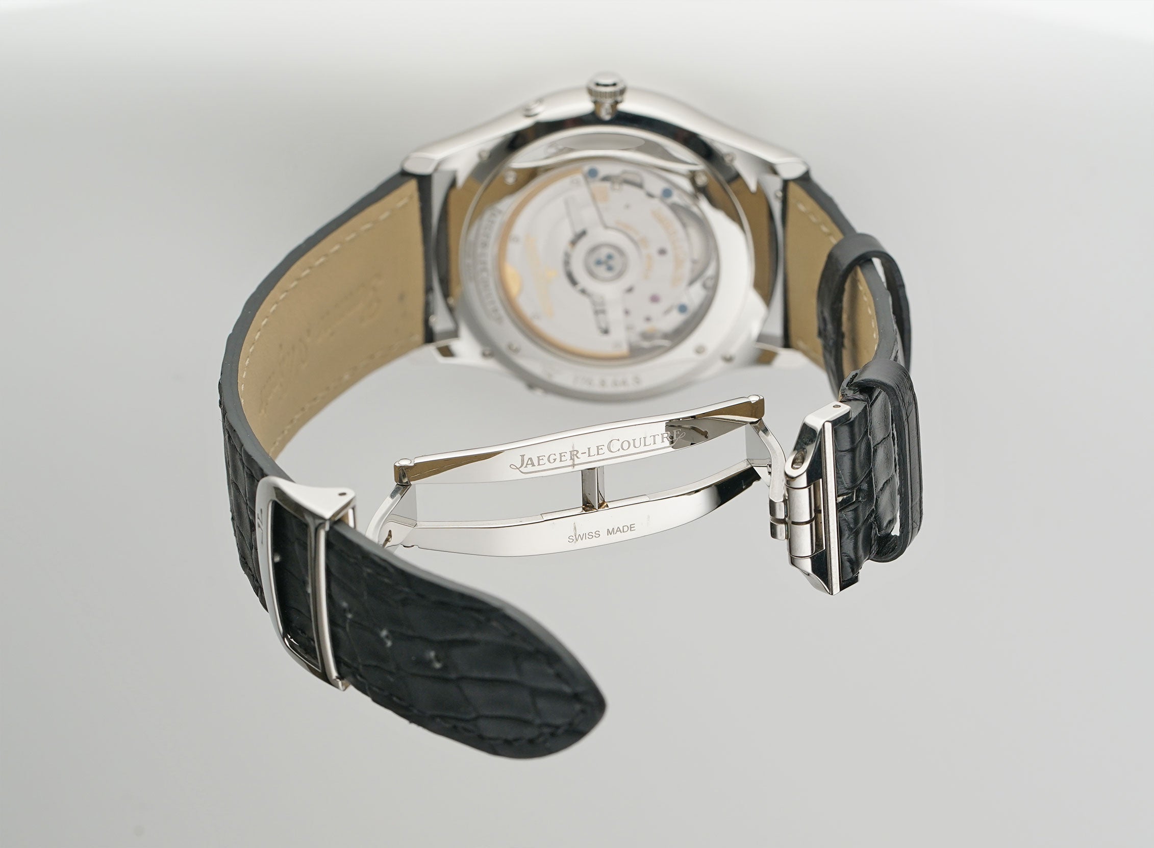The case, bezel and case back are all made of a mirror-finished stainless steel. It is paired with a new unworn black leather Jean Rousseau (high-quality Paris-made) strap and a stainless steel JLC double folding clasp.