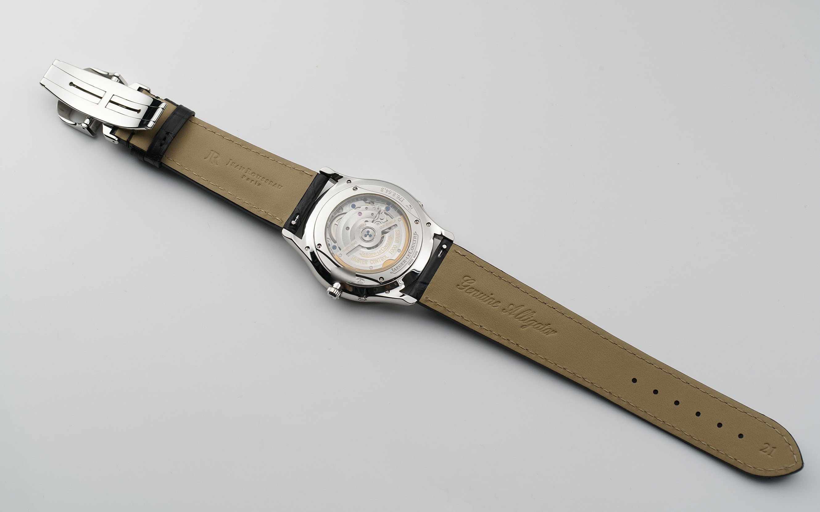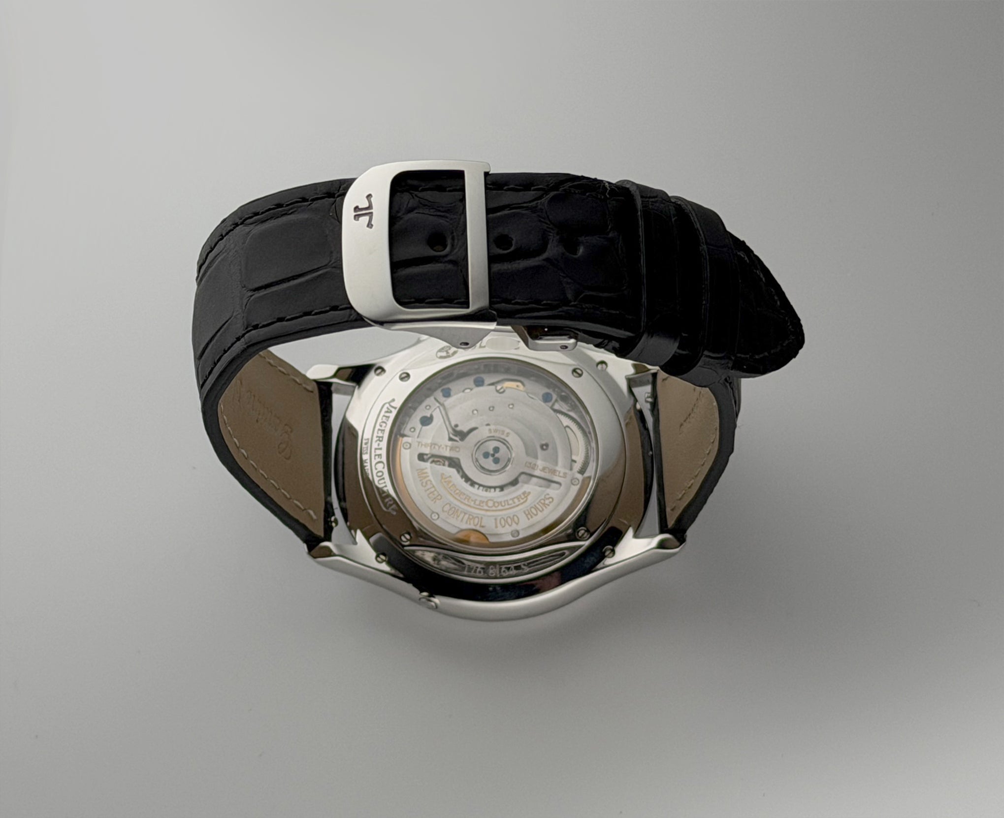 The case, bezel and case back are all made of a mirror-finished stainless steel. It is paired with a new unworn black leather John Rousseau (high-quality Paris-made) strap and a stainless steel JLC double folding clasp.