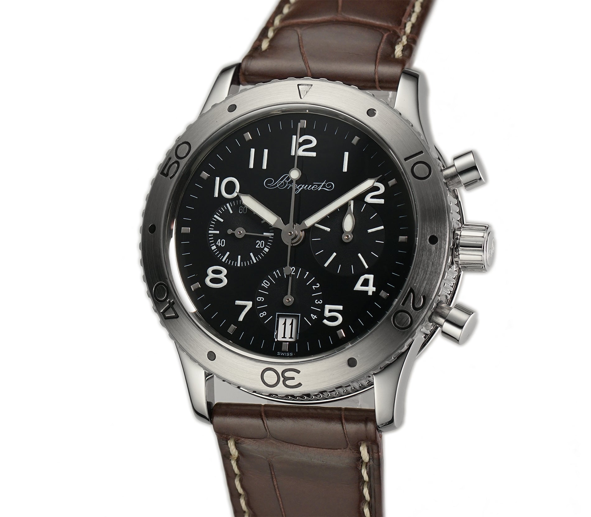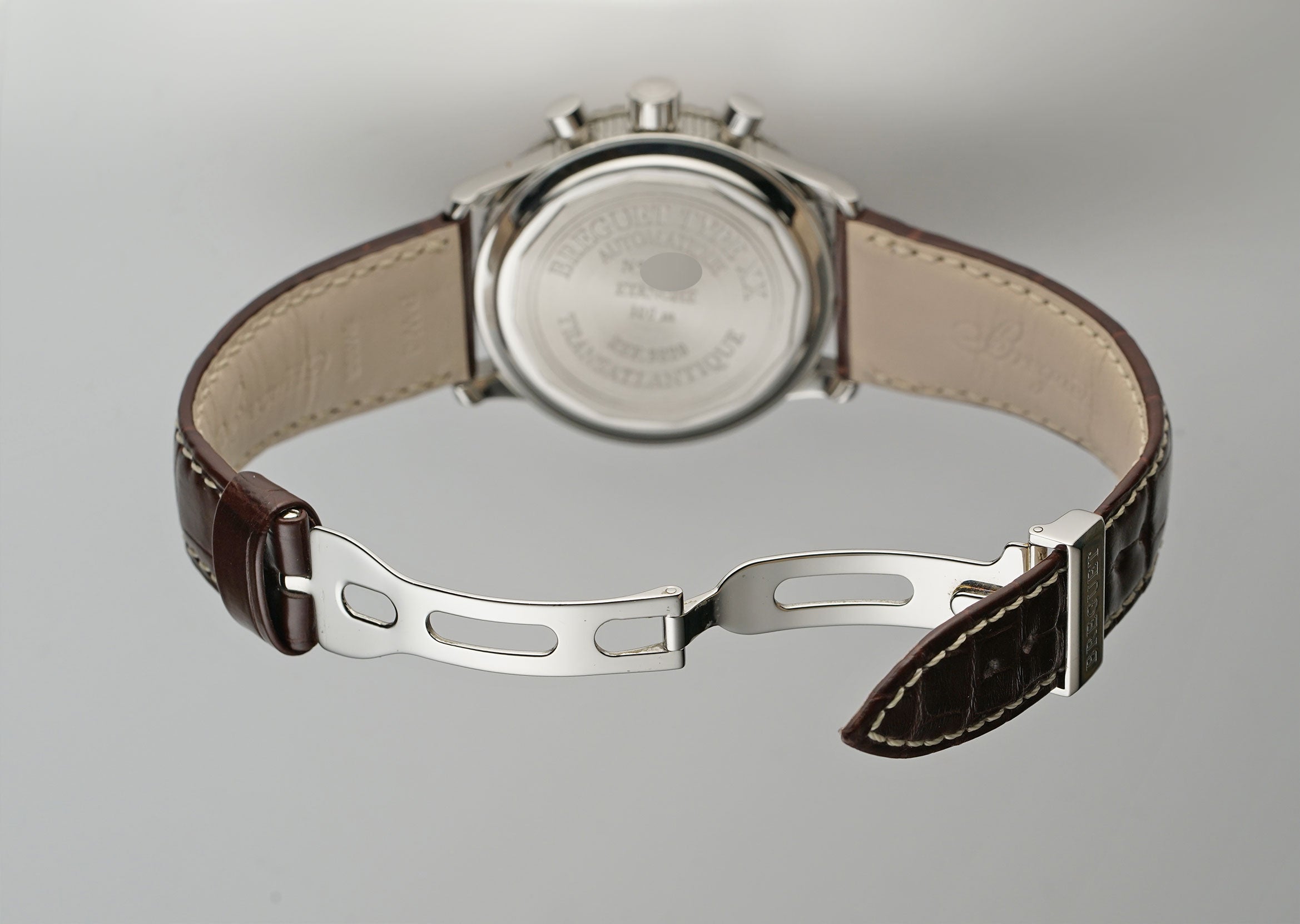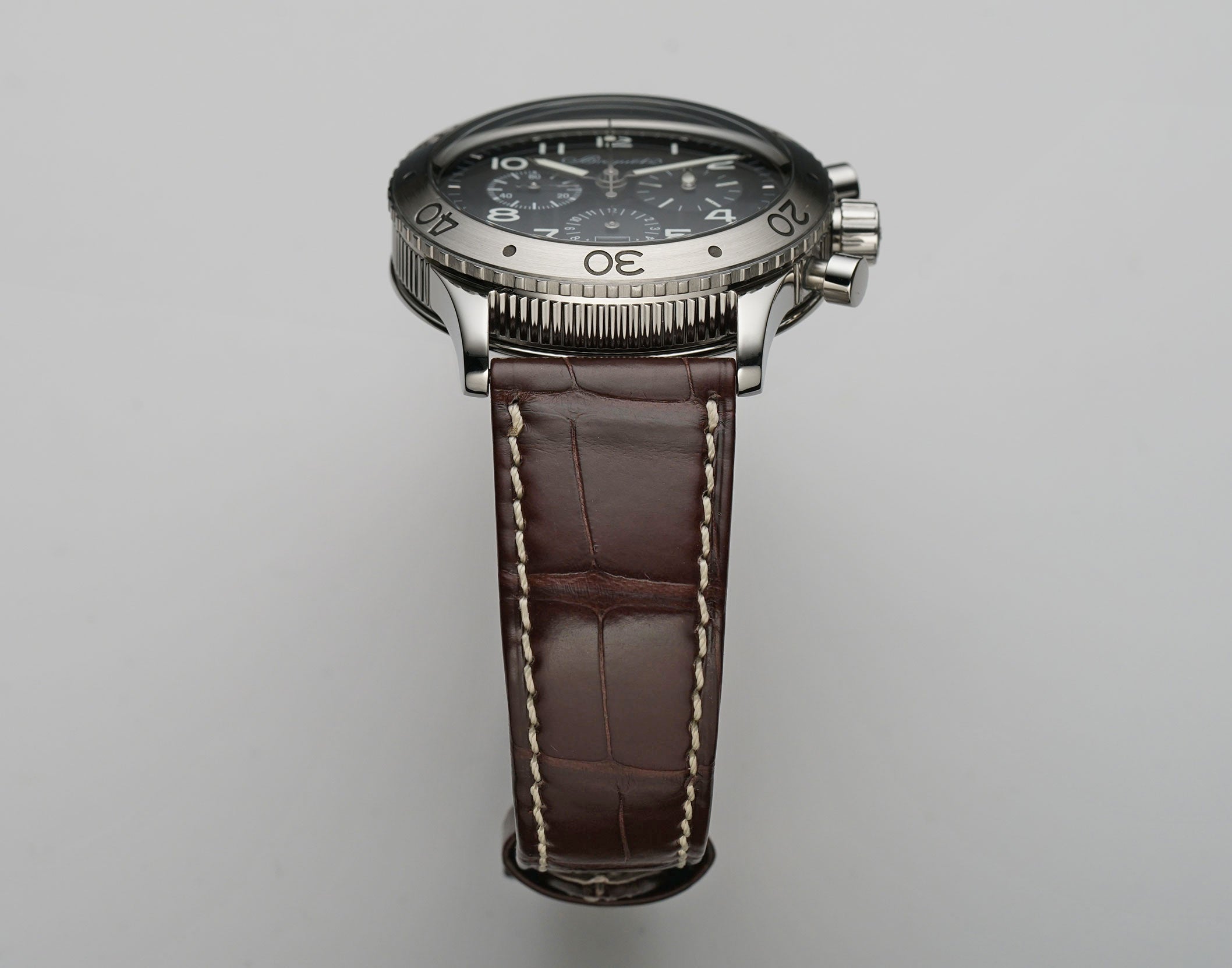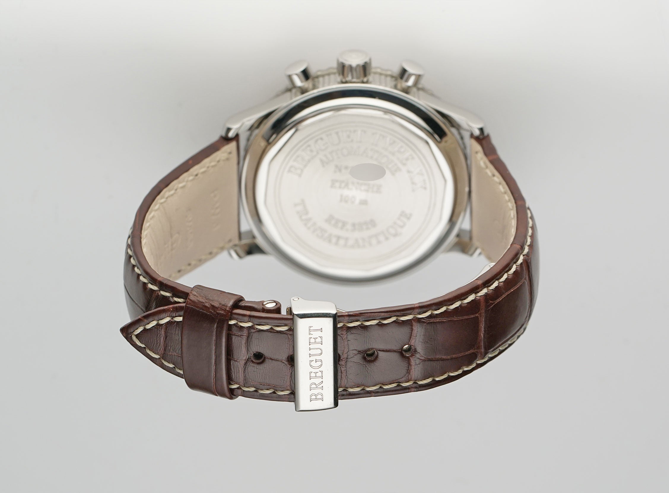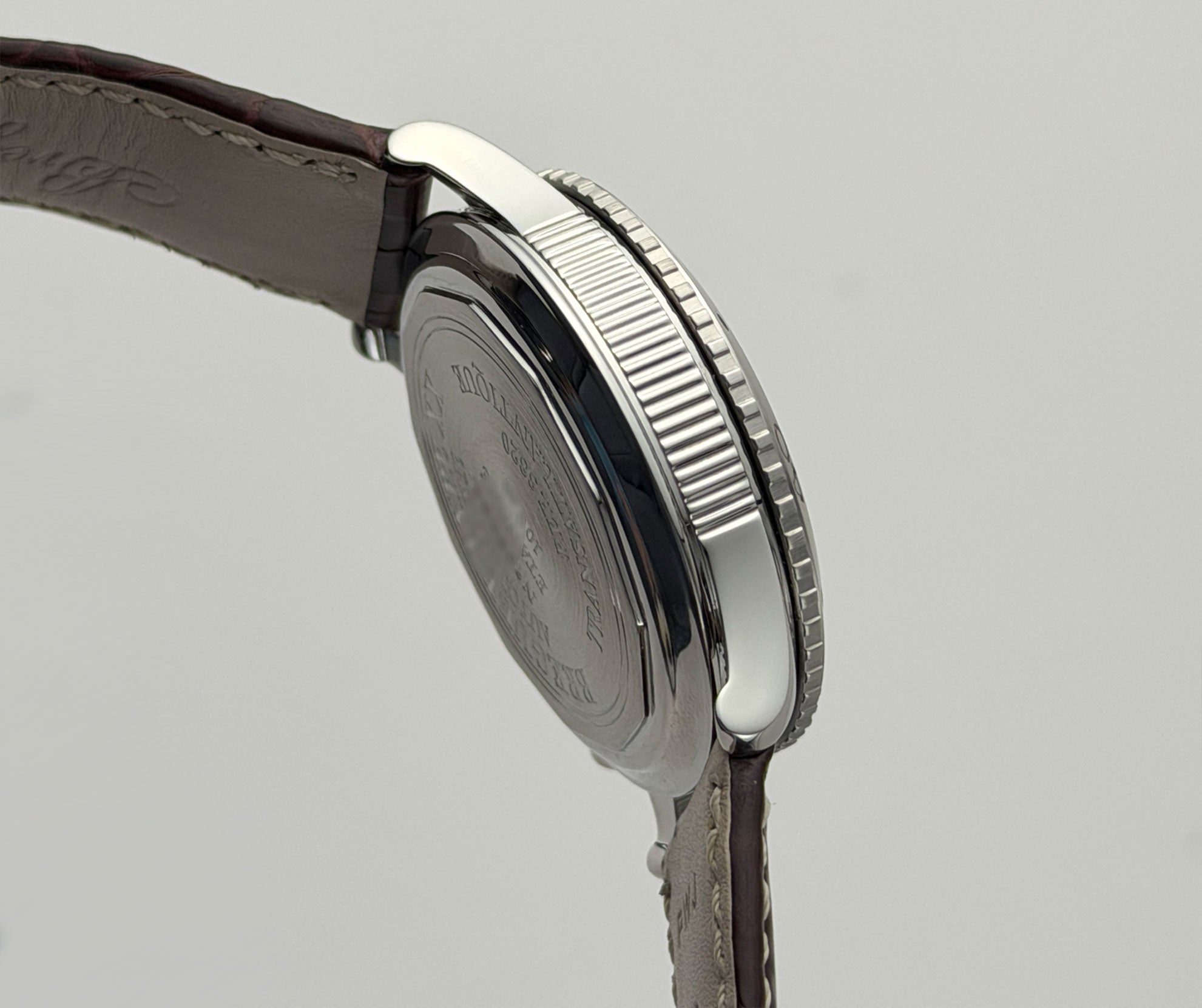 The case is made of stainless steel with mirror-finished lugs, a coin-edged sides and a spun-finished case back. The 60-minute scaled steel bezel mounted atop shows a satin finish (luminous plot is missing at 12 o'clock). It is currently mounted on an unworn brown leather Breguet strap that is paired with a stainless steel Breguet deployment clasp.