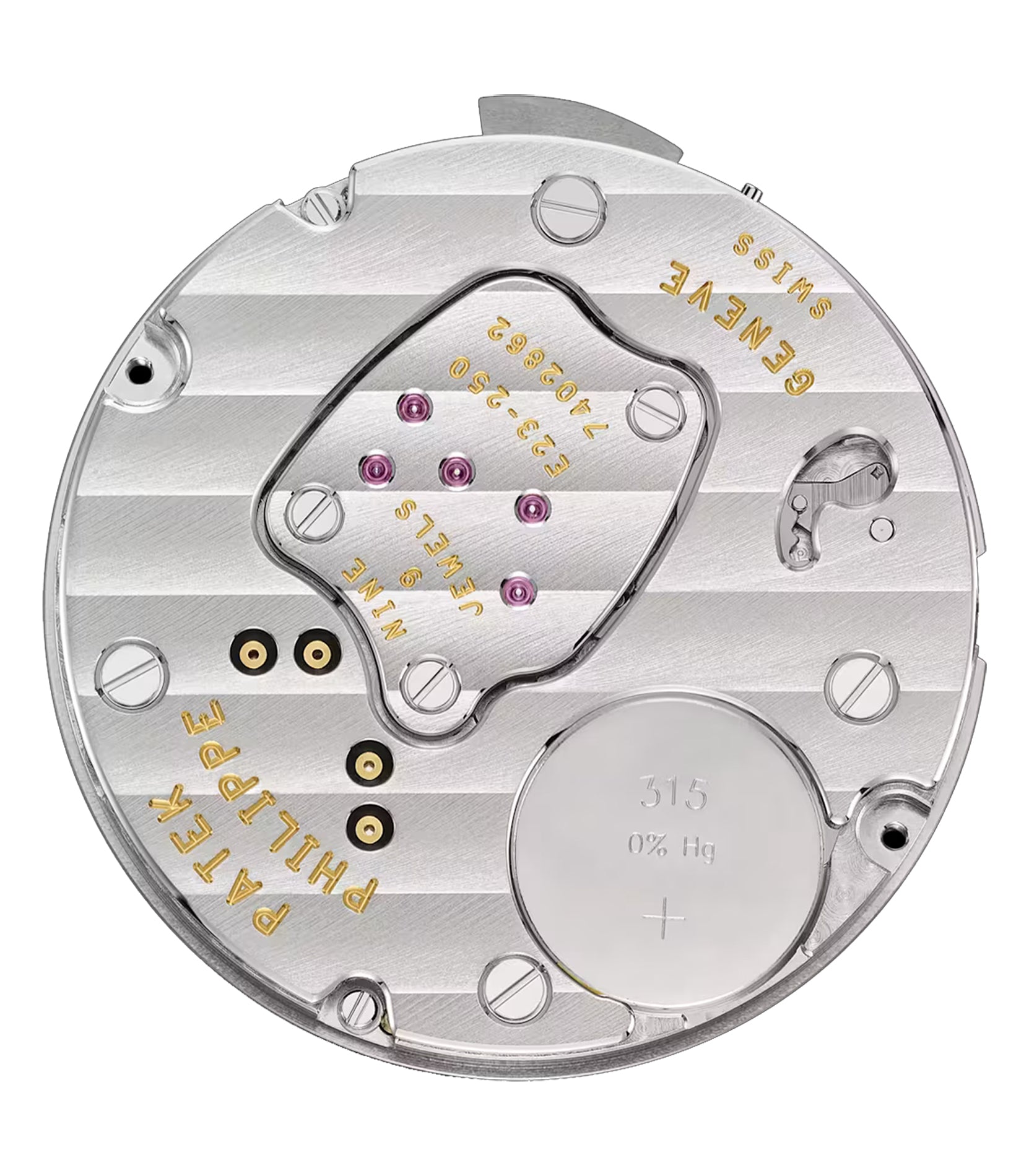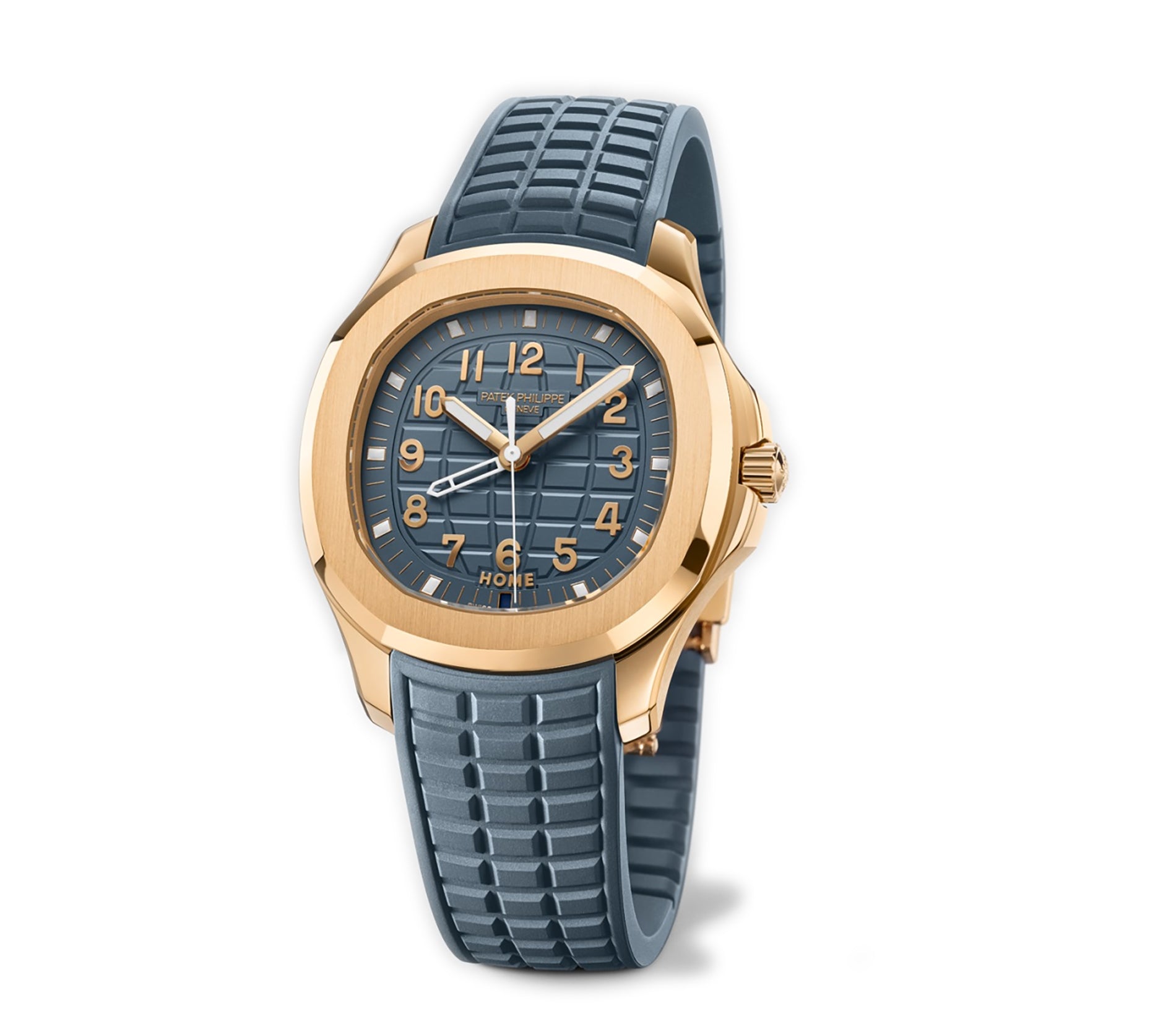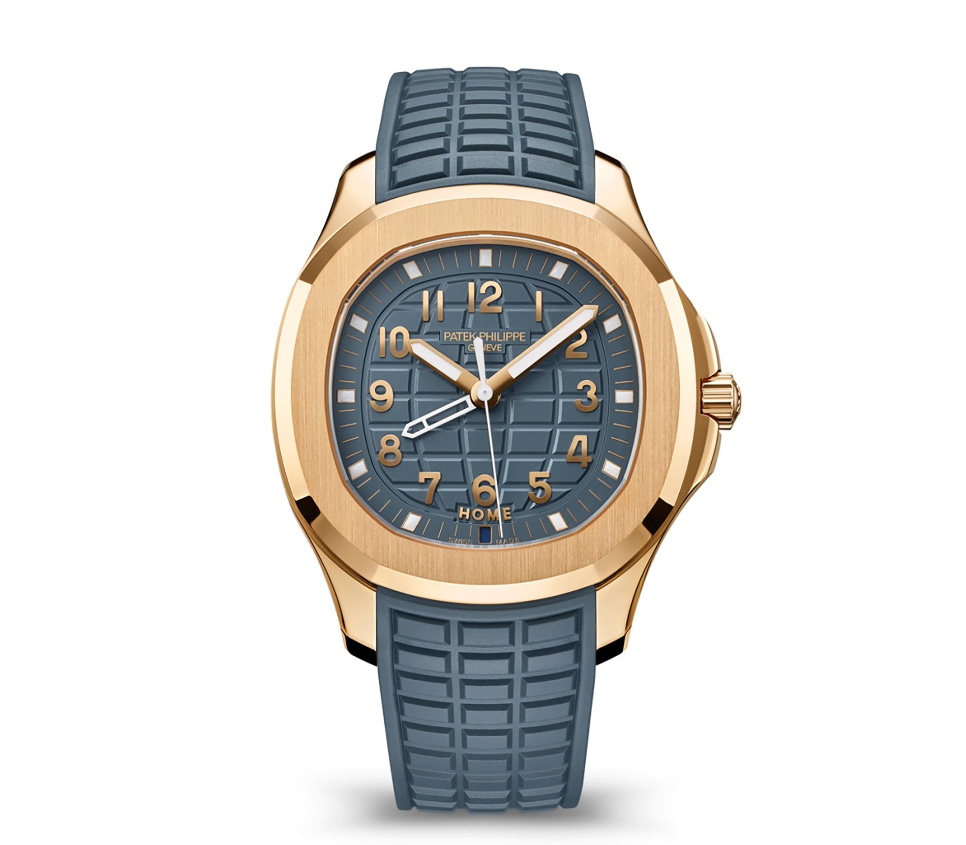 Functions are shown on a Opaline blue-grey dial with the aquanaut pattern, luminous hands and hour markers, and rose gold applied numerals. These functions include hours, minutes, seconds, local and home.