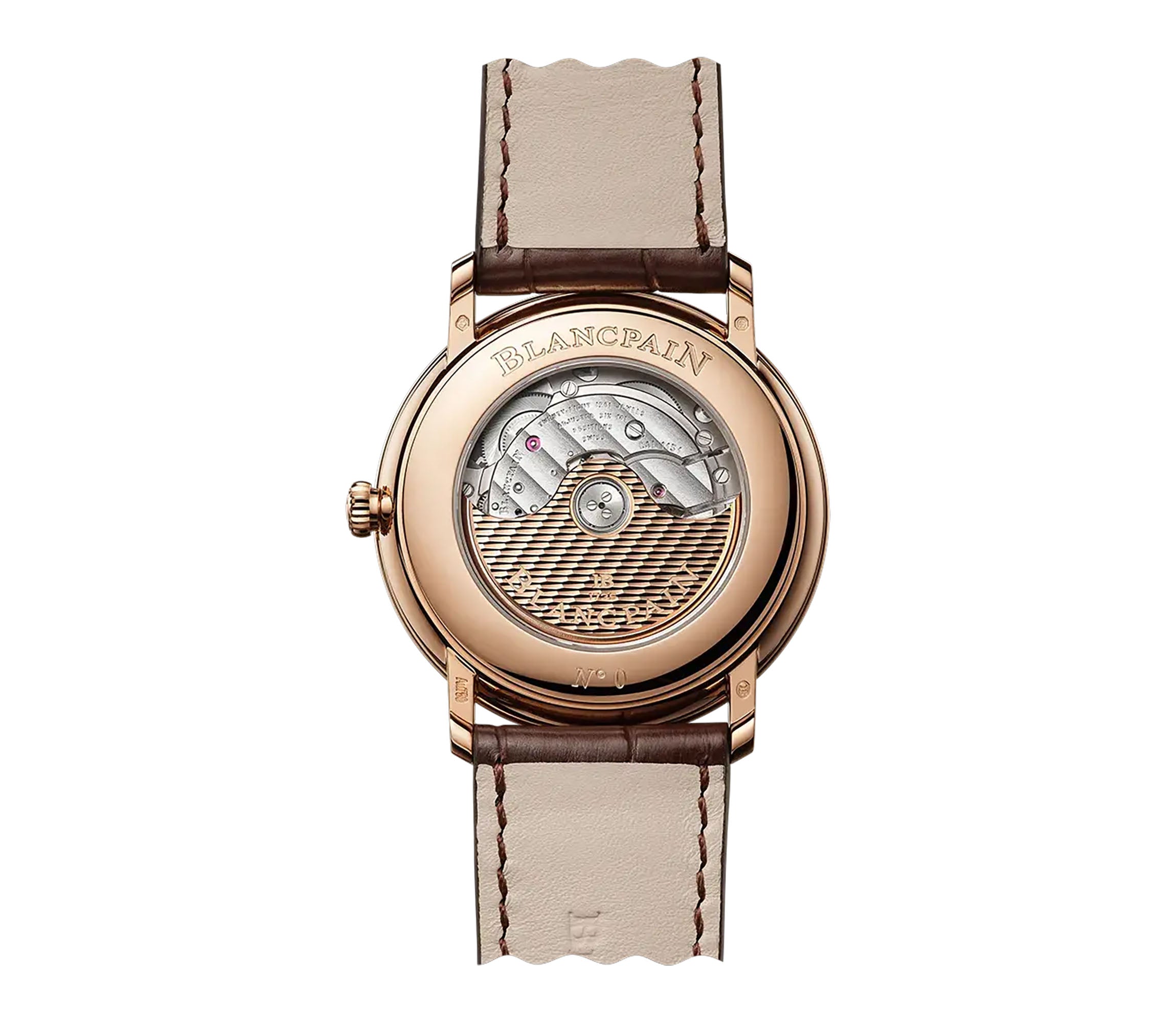 The case is made of a mirror finish 18k rose gold including the crown. Mounted atop the case is a mirror finish 18k rose gold bezel. Paired with the watch is a brown leather strap with an 18k rose gold folding clasp.