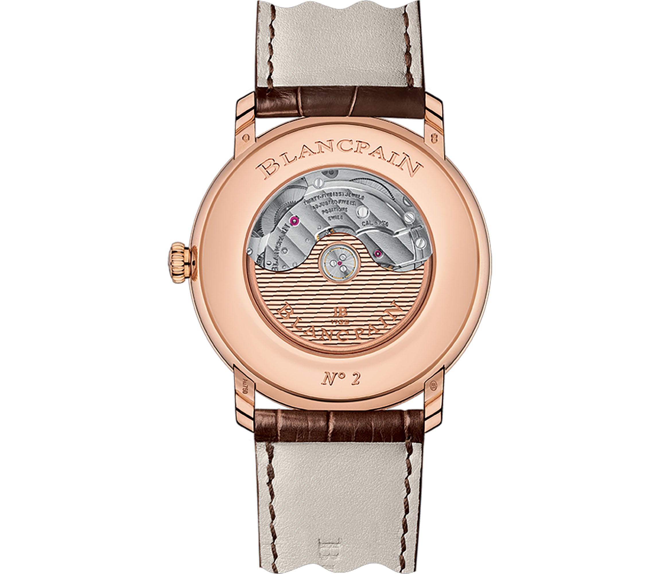 The case is made of a mirror finish 18k rose gold including the crown. Mounted atop the case is a mirror finish 18k rose gold bezel. Paired with the watch is a brown leather strap with an 18k rose gold folding clasp.