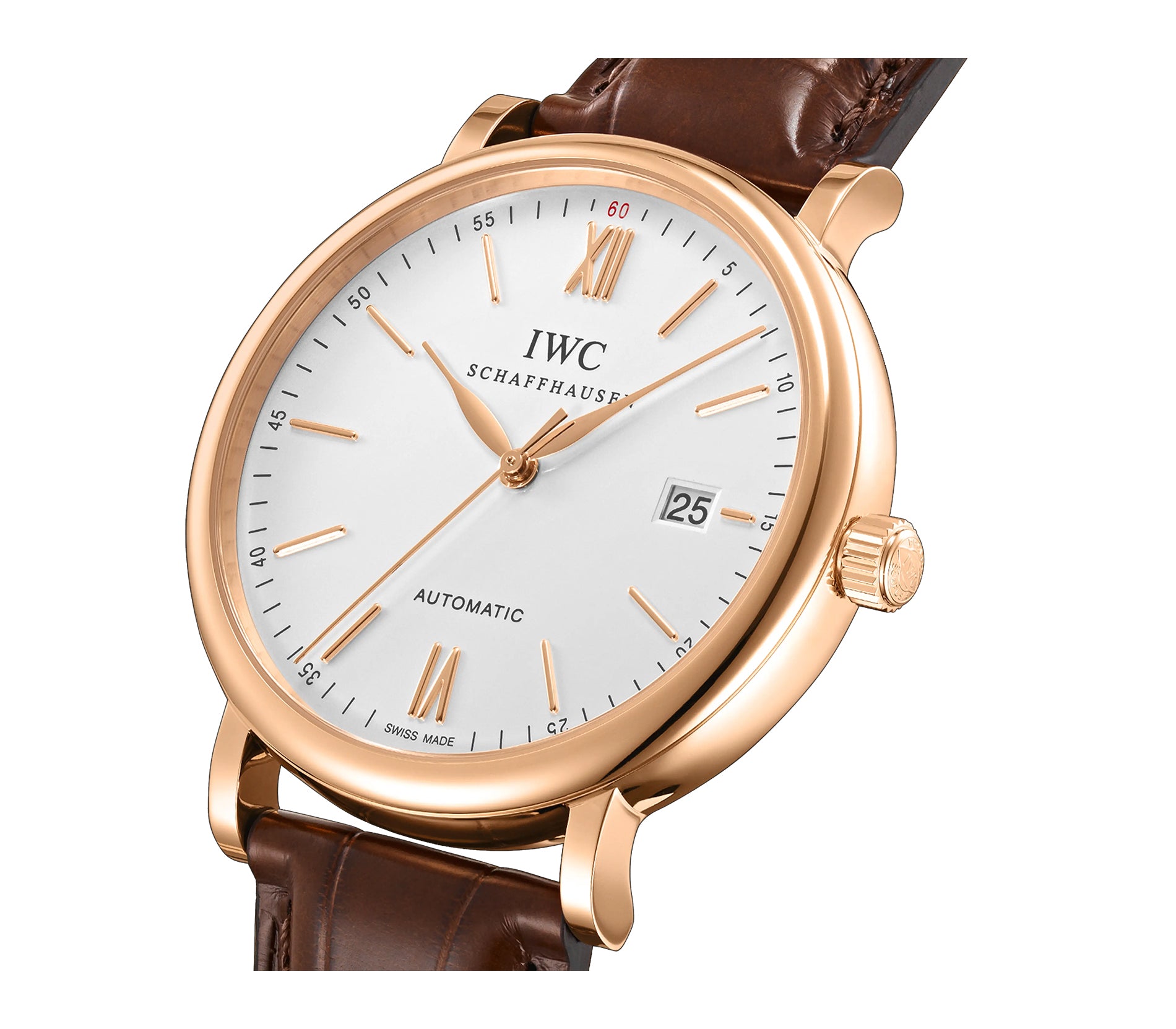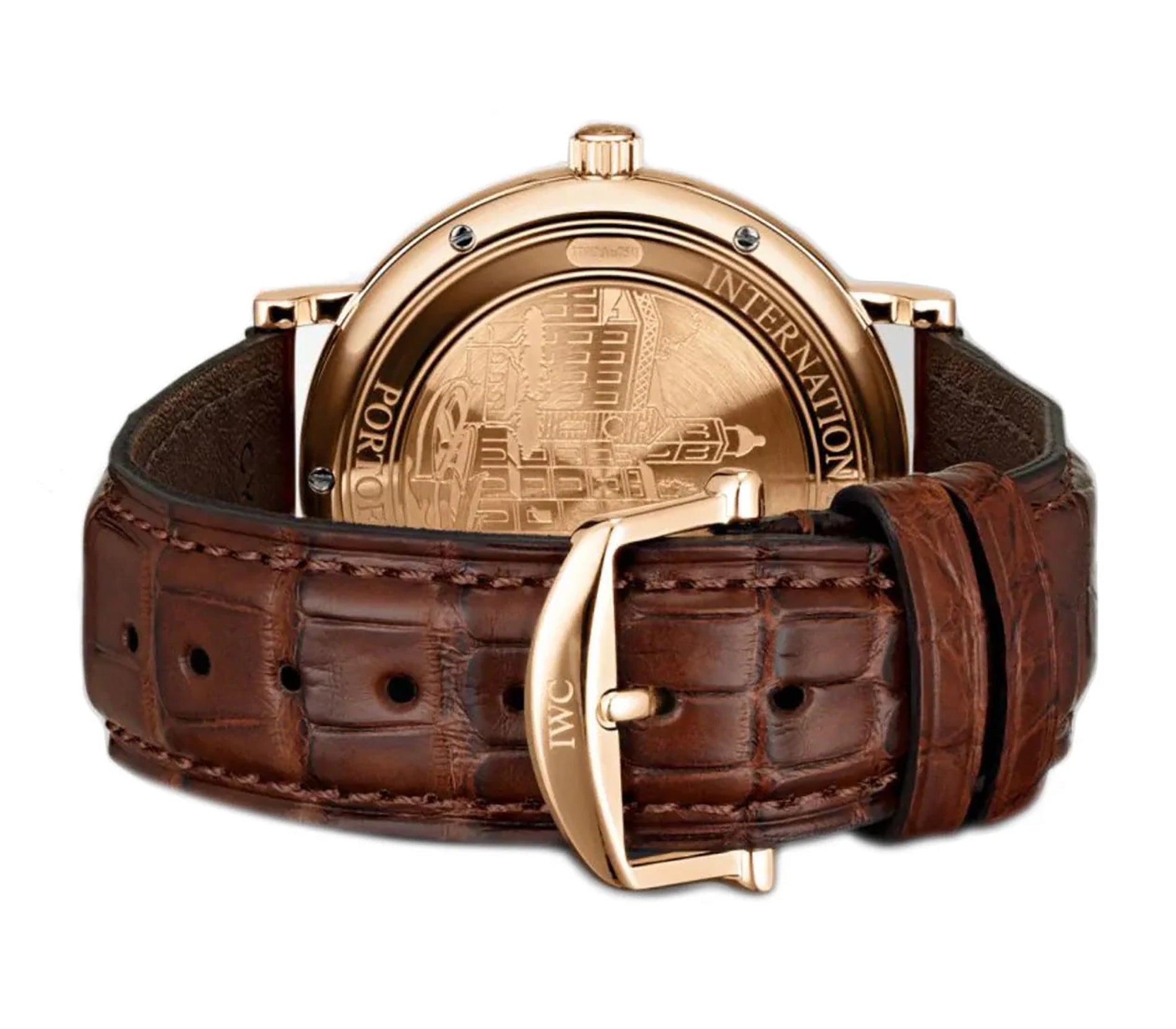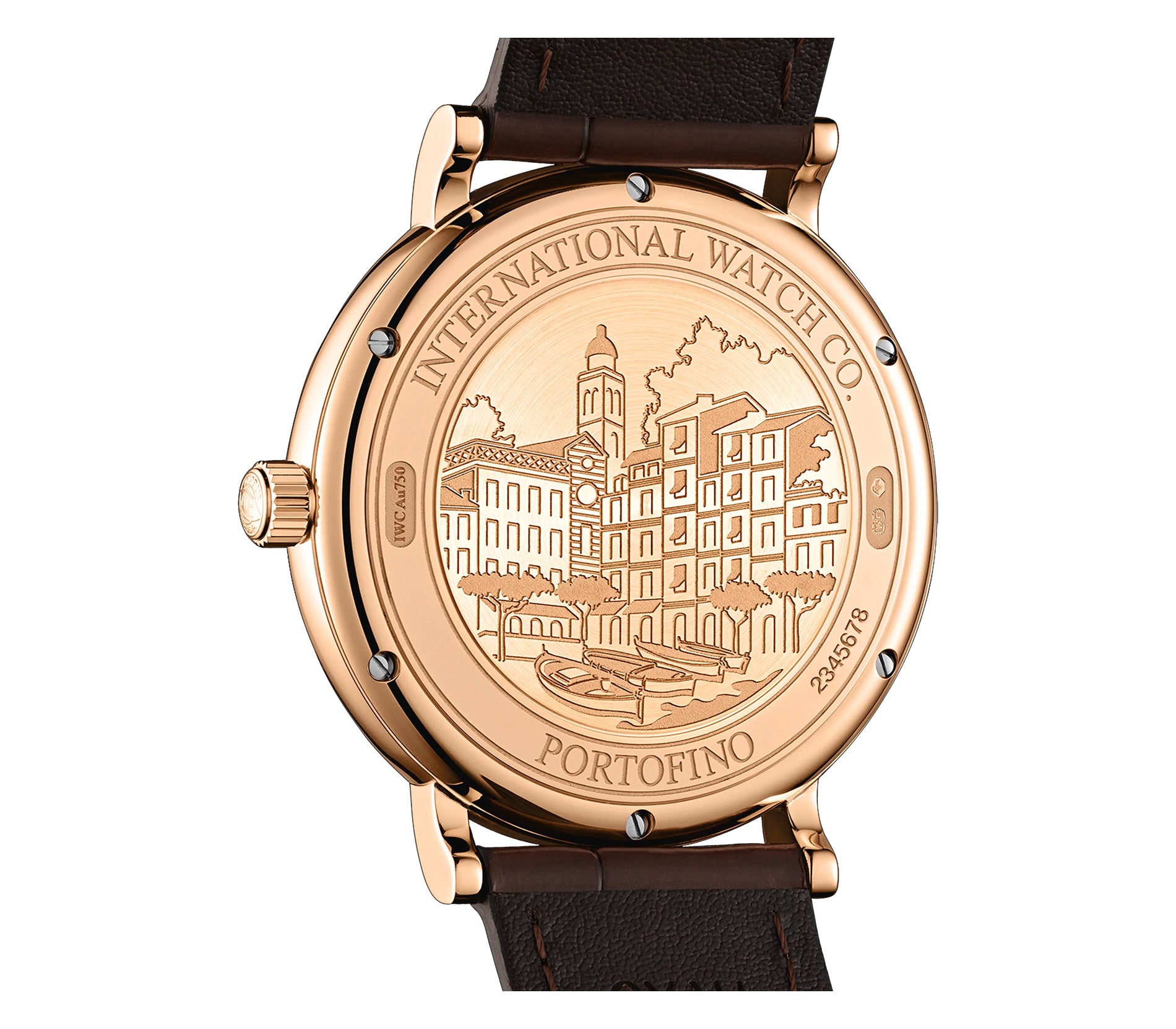 Case is made of mirror finished 18k rose gold as is the fixed bezel mounted atop. Back of the watch shows engraving of the view of the harbour at Portofino. Mounted atop is a dark brown alligator strap with an IWC 18k rose gold tank buckle.