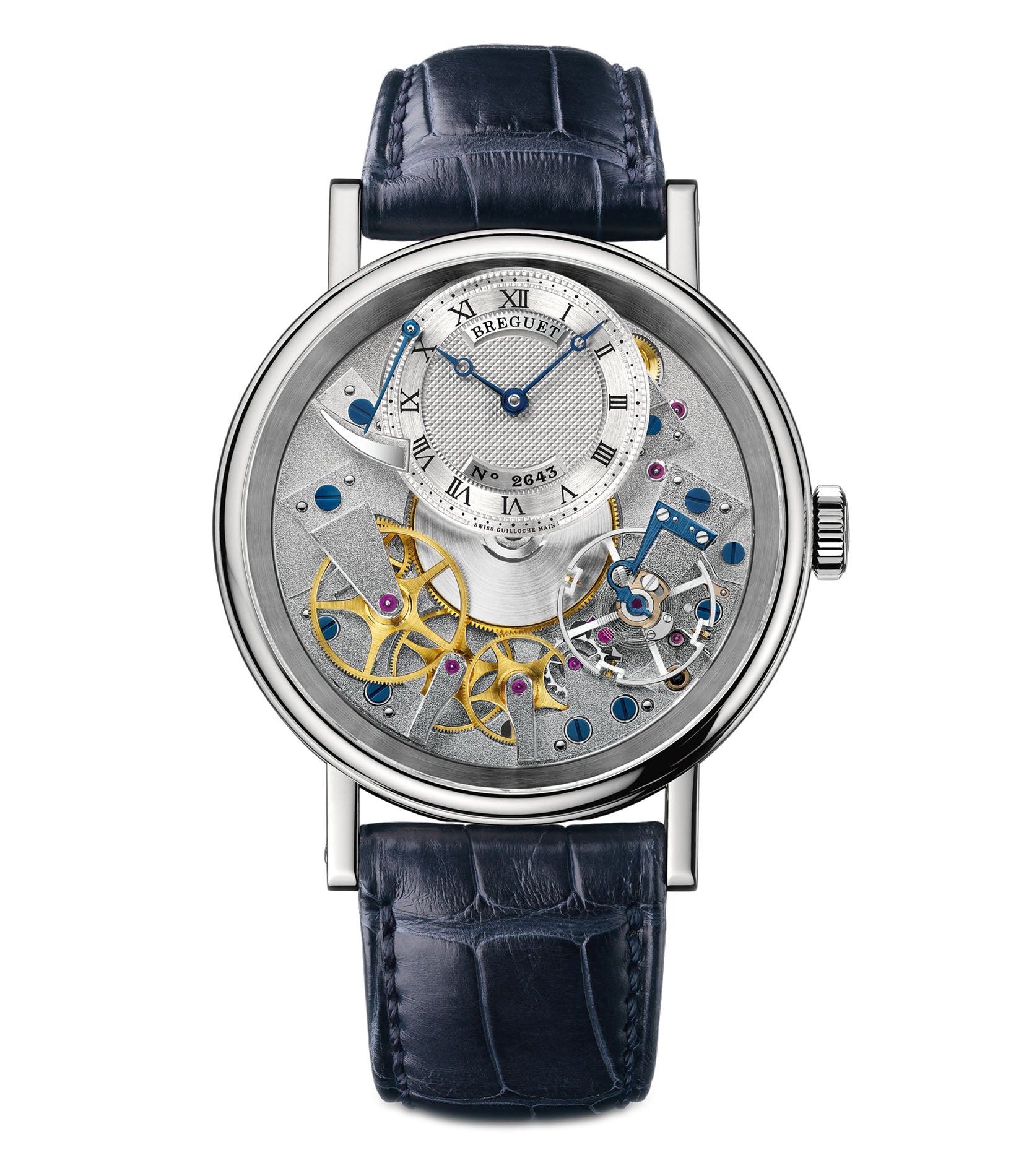 These functions are shown on a silver guilloche dial with blue hands and the visible inner workings of the watch. These functions include hours, minutes, and power reserve.