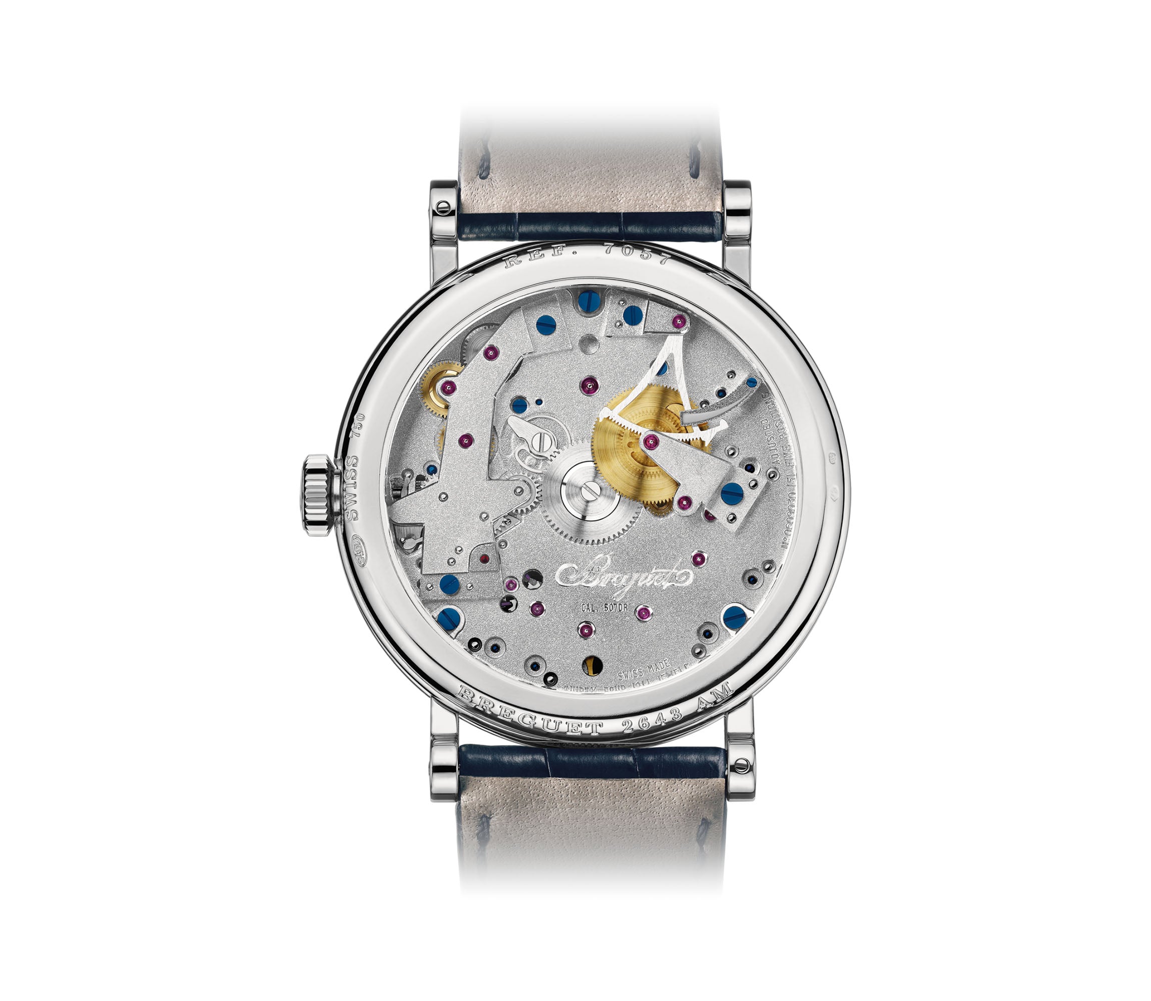 The case is made of an mirror finish 18k white gold including the crown. Mounted atop the case is a mirror finish 18k white gold bezel. The watch is paired with a navy blue leather strap with an 18k white gold buckle.
