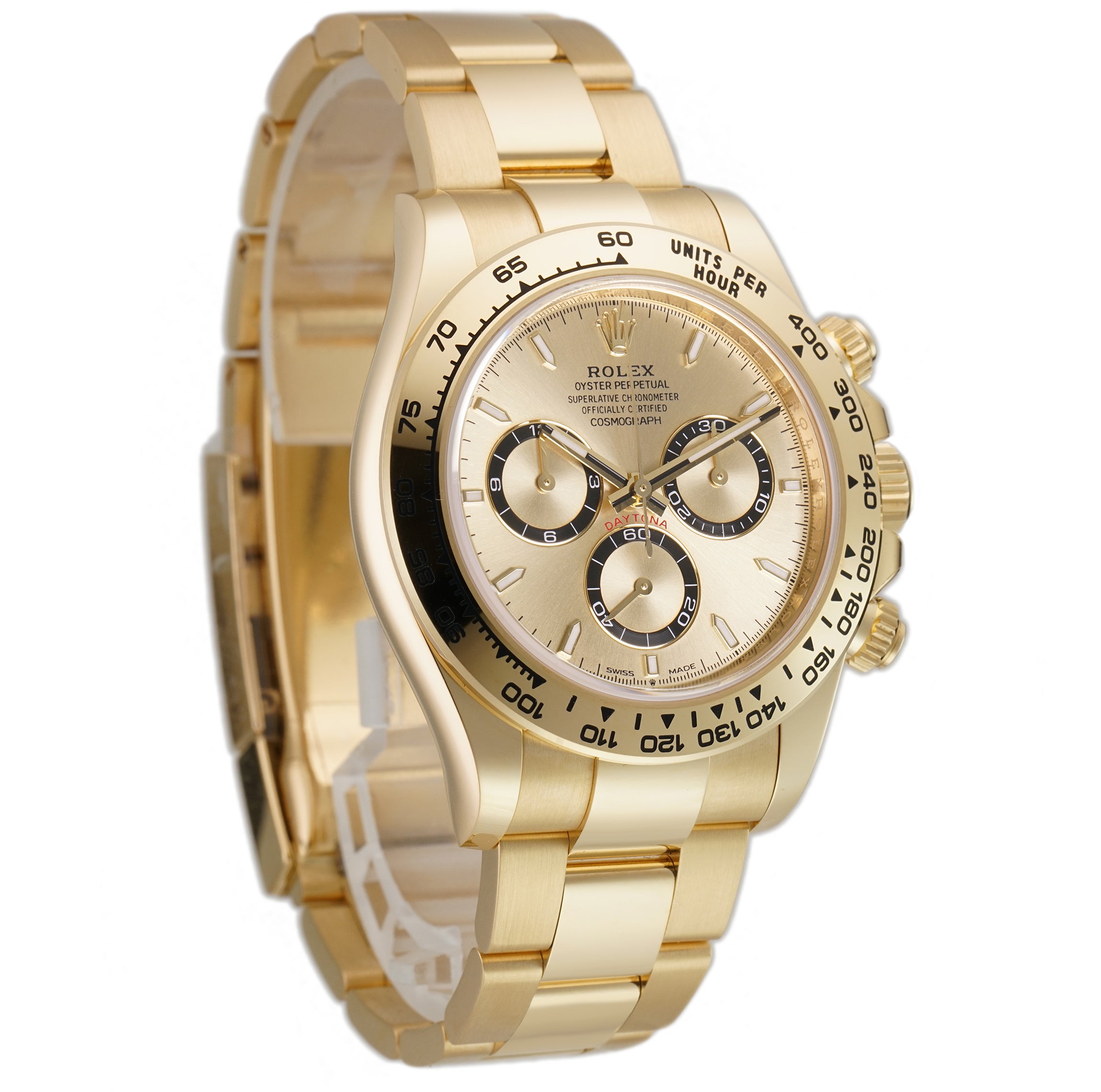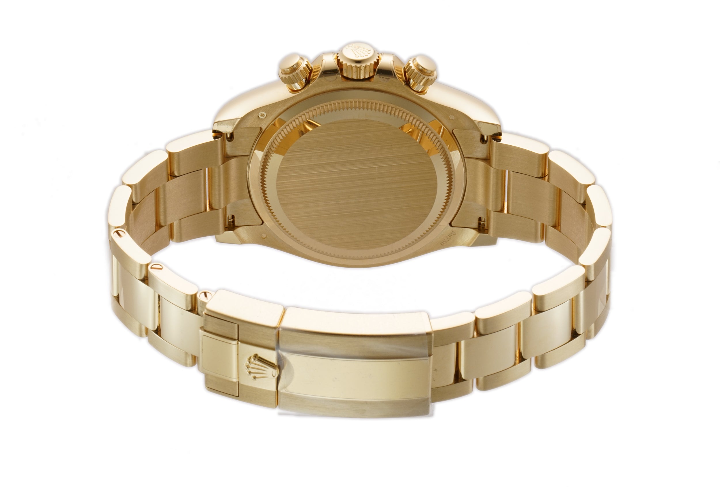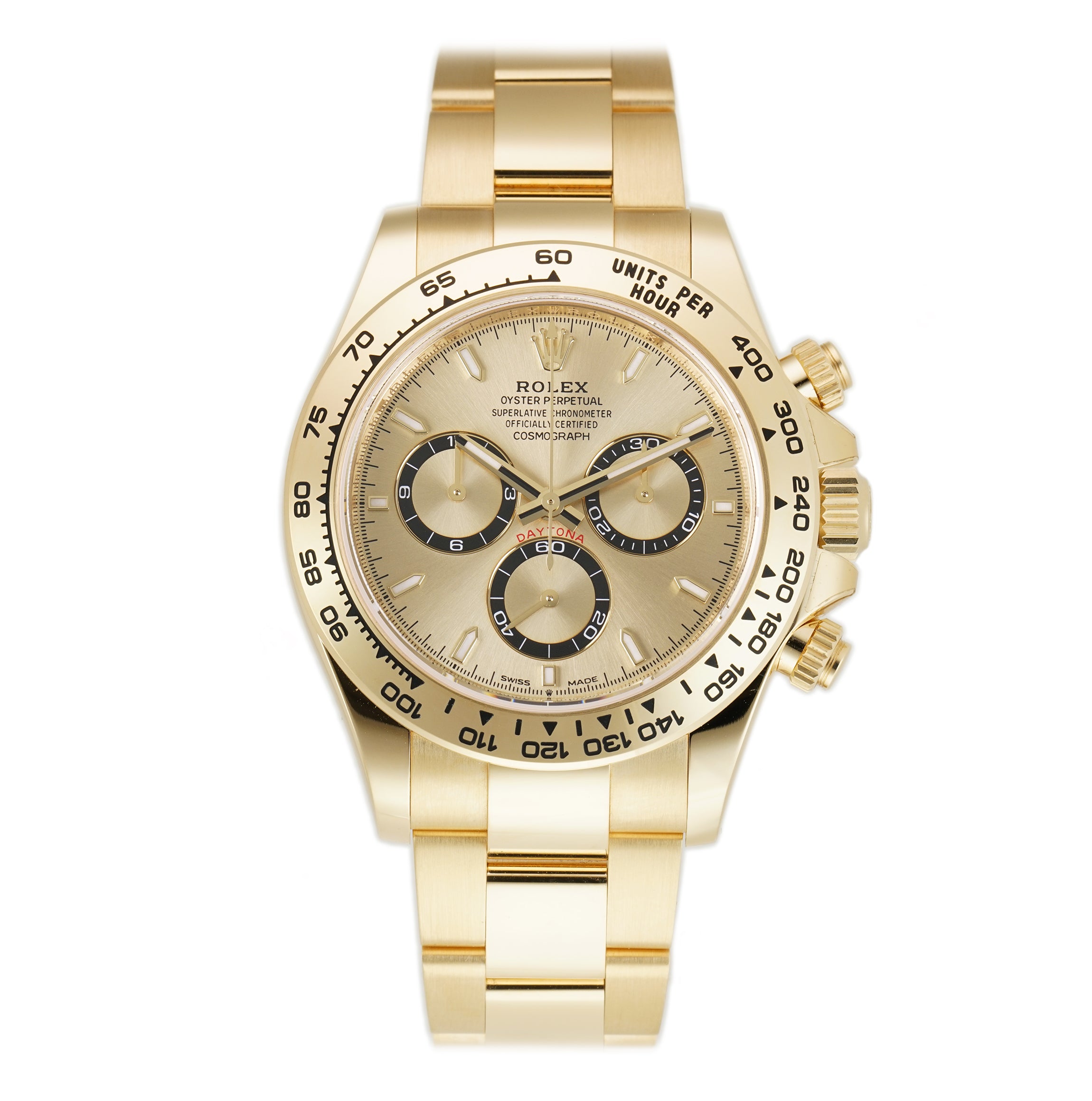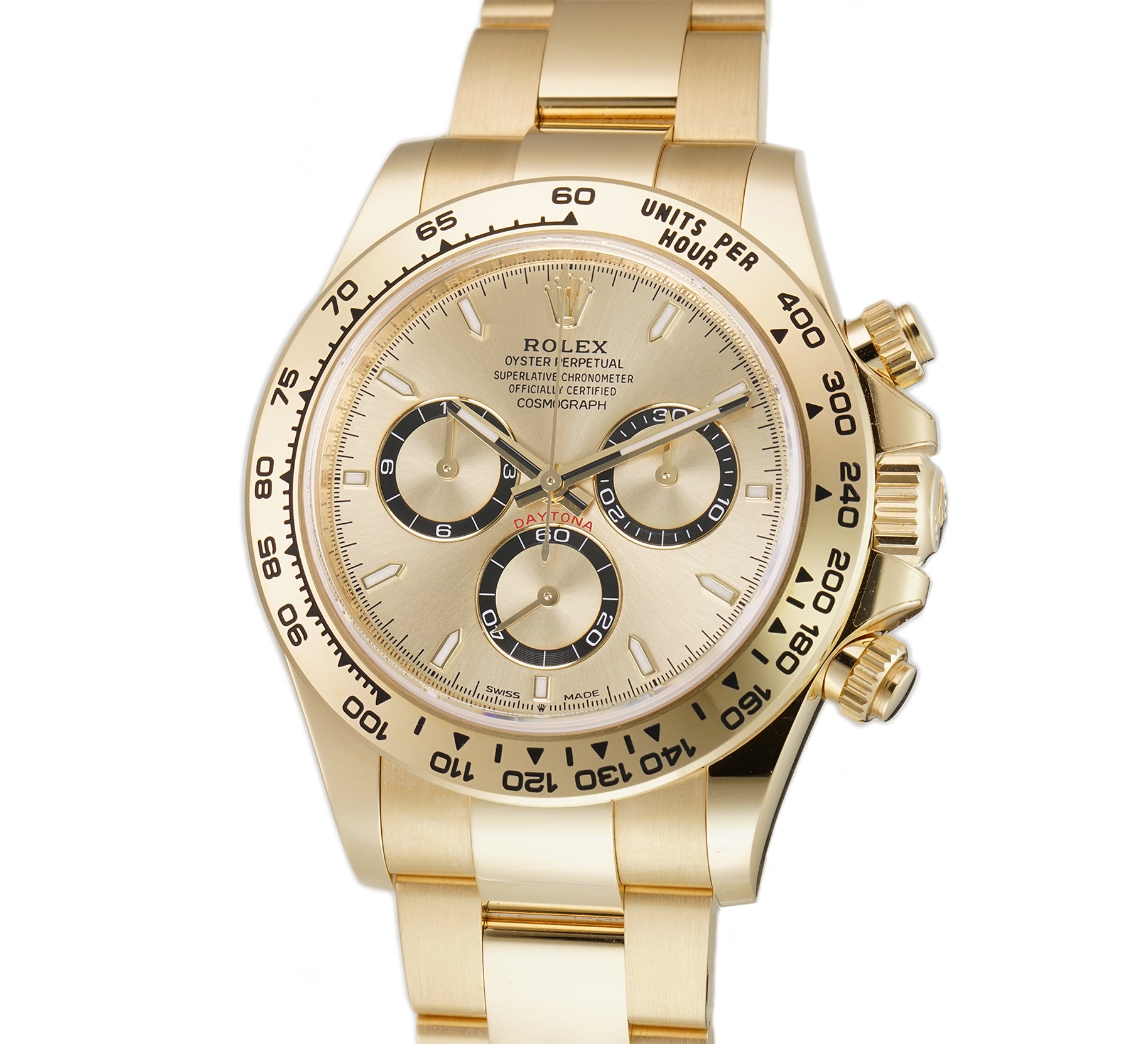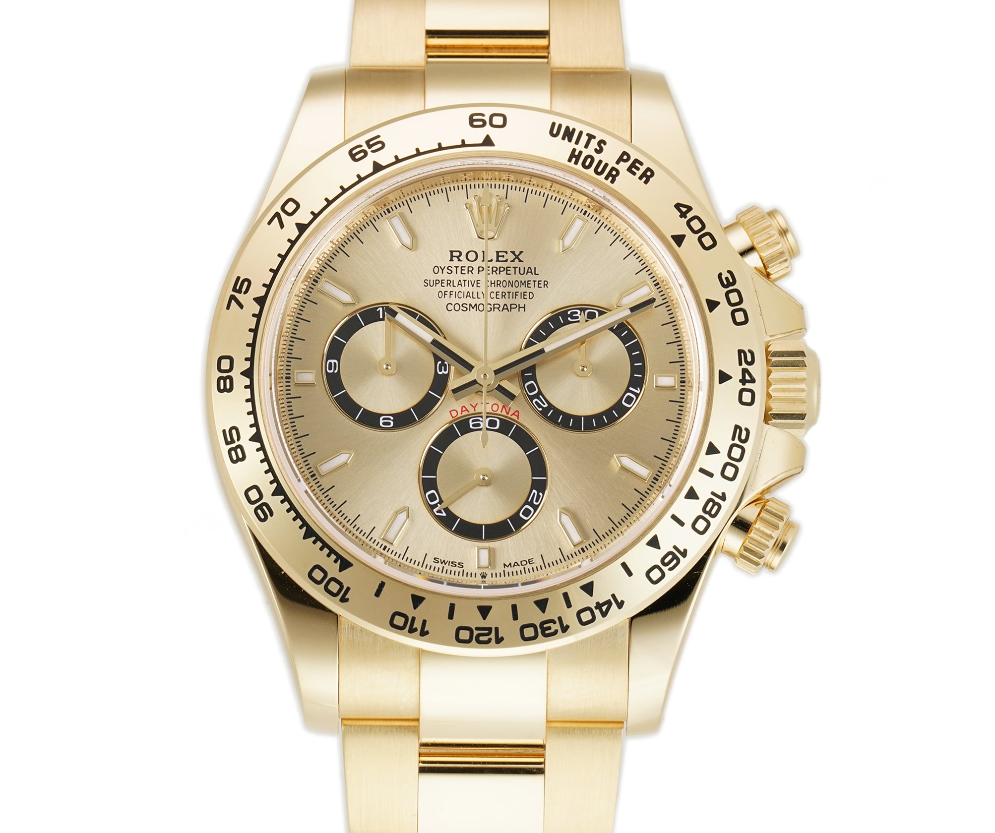 The case is made of a mirror-like finished 18k yellow gold as is the tachymeter-scaled bezel mounted atop. As for the 18k yellow gold oyster bracelet, it features brush-finished outer links as well as high-polish finished center links down the middle.