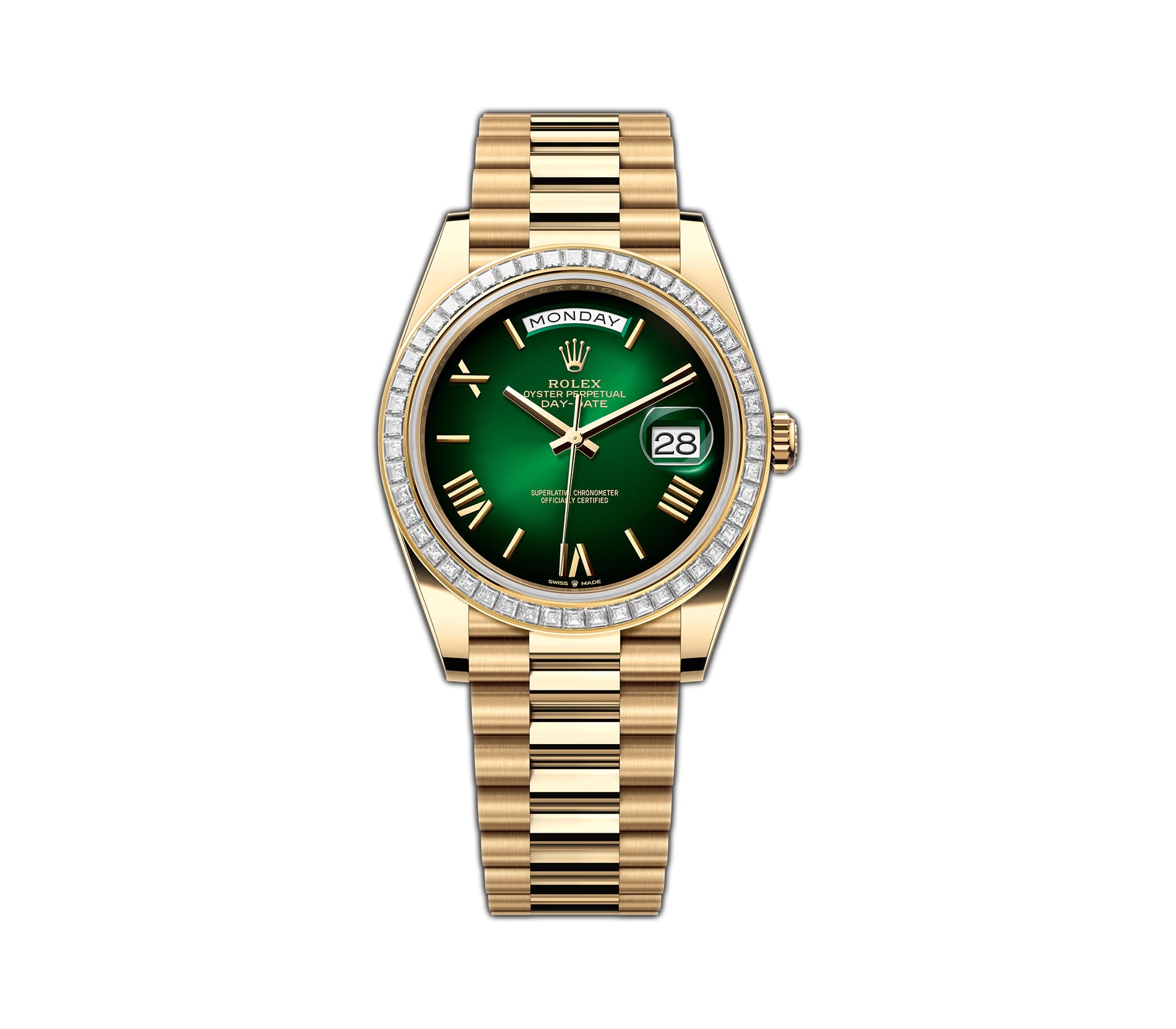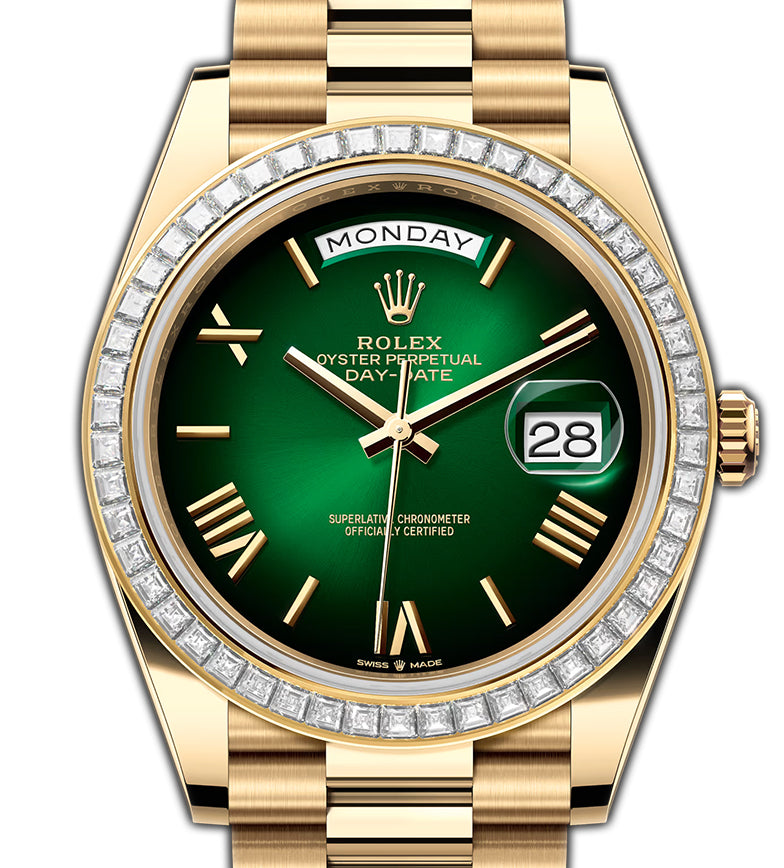 40mm 18k Yellow Gold President Baguette Diamond Bezel Green Roman Ombre