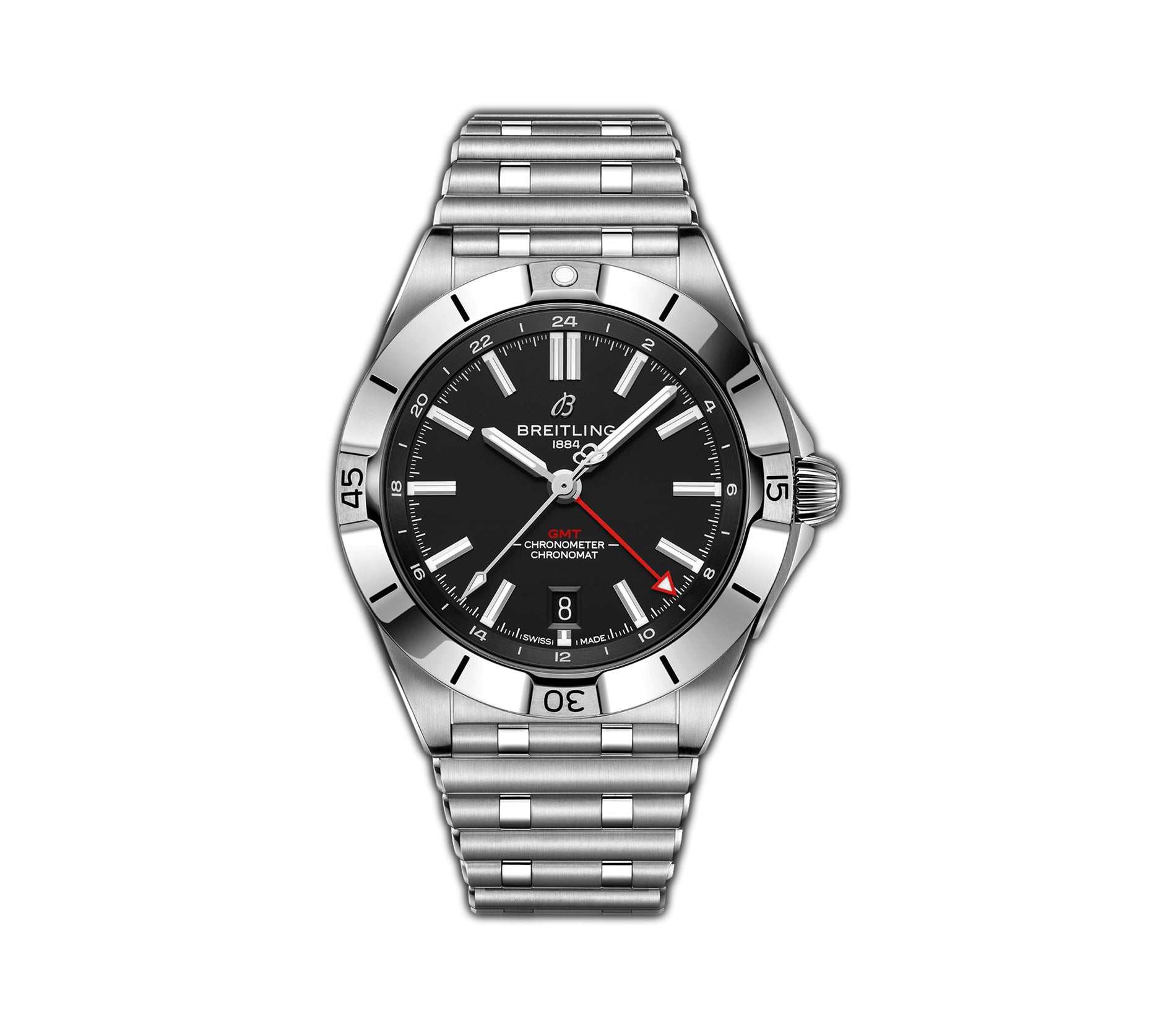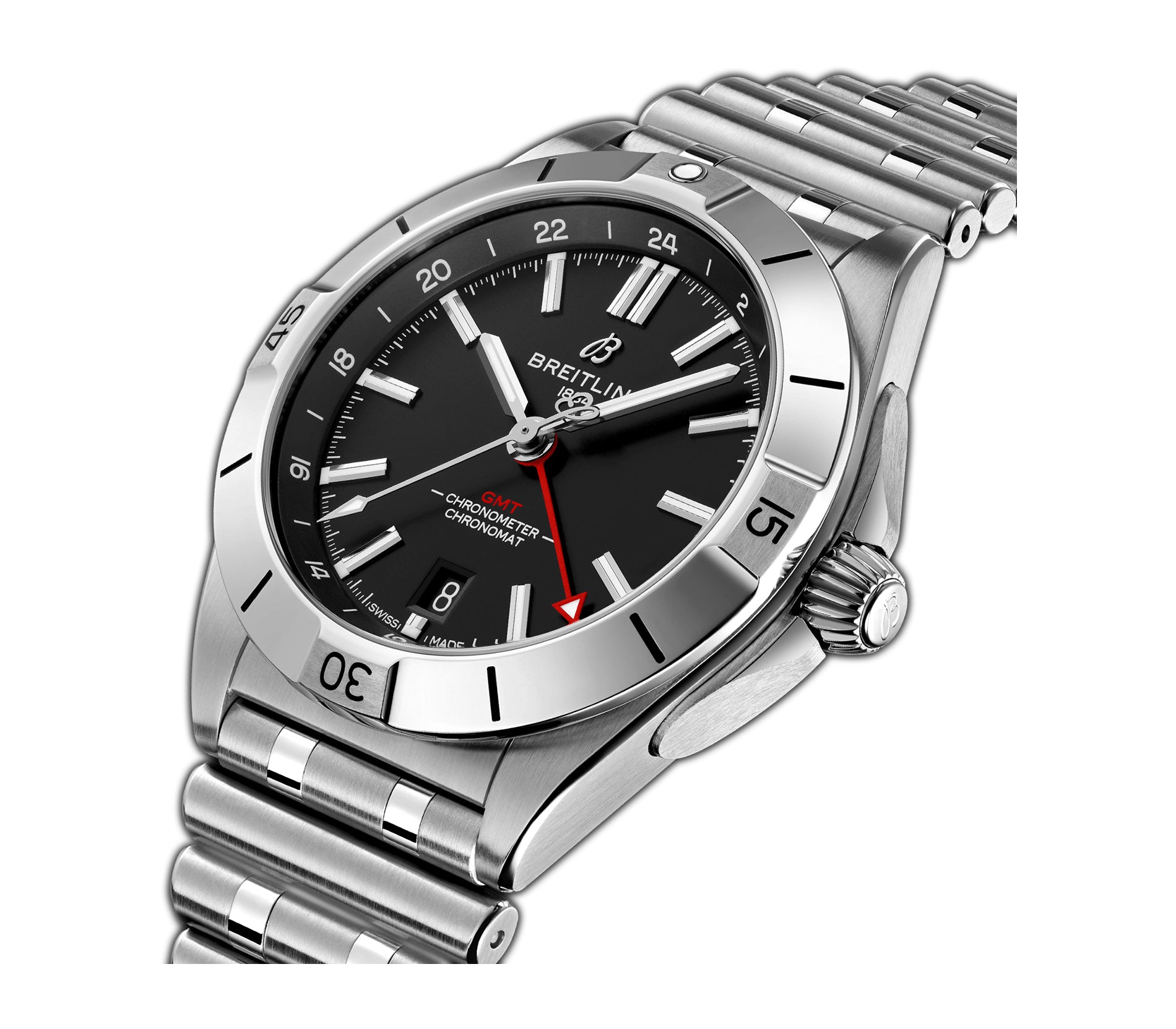 Functions are shown on a black dial with luminous hands and hour markers. These functions include hours, minutes, seconds, GMT and date.