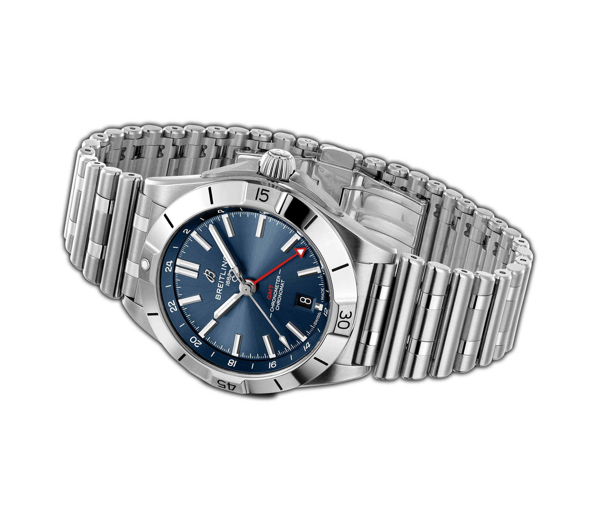 Functions are shown on a blue dial with luminous hands and hours markers. These functions include hours, minutes, sub-seconds, gmt and date.