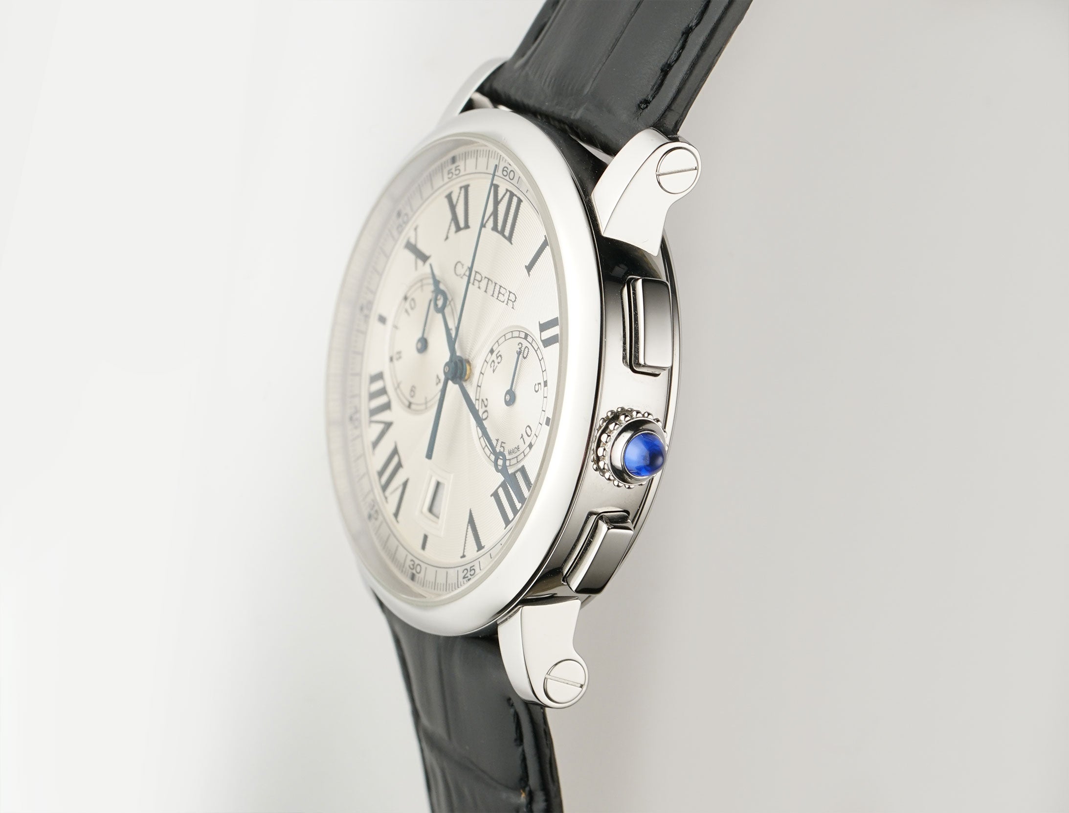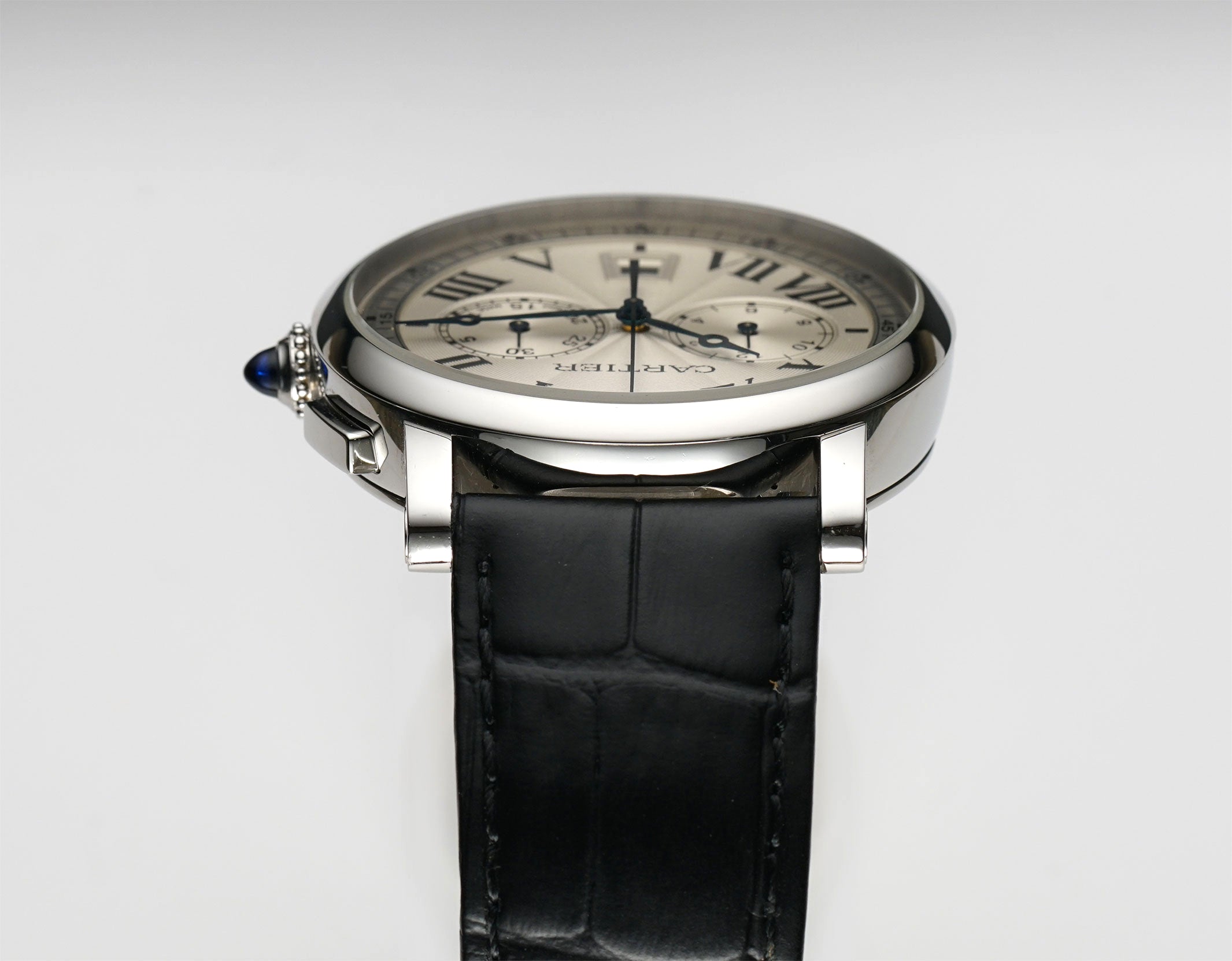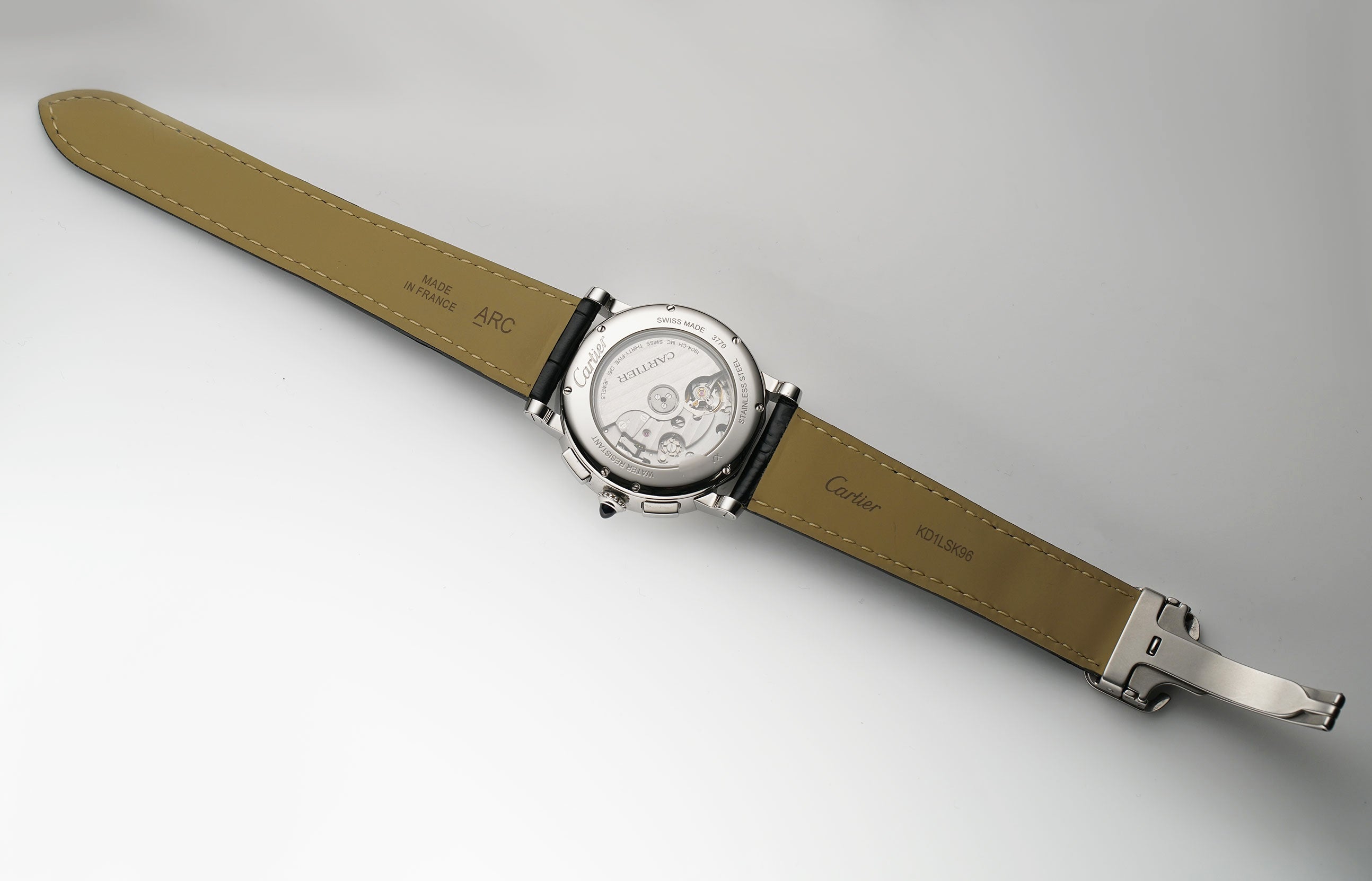 The case and bezel are made of stainless steel all of which displays a mirror finish. It features a stainless steel fluted crown that is equipped with a synthetic sapphire cabochon. Currently mounted on the watch is a Cartier black leather strap (unworn condition) and that is paired with a Cartier stainless steel deployment clasp.