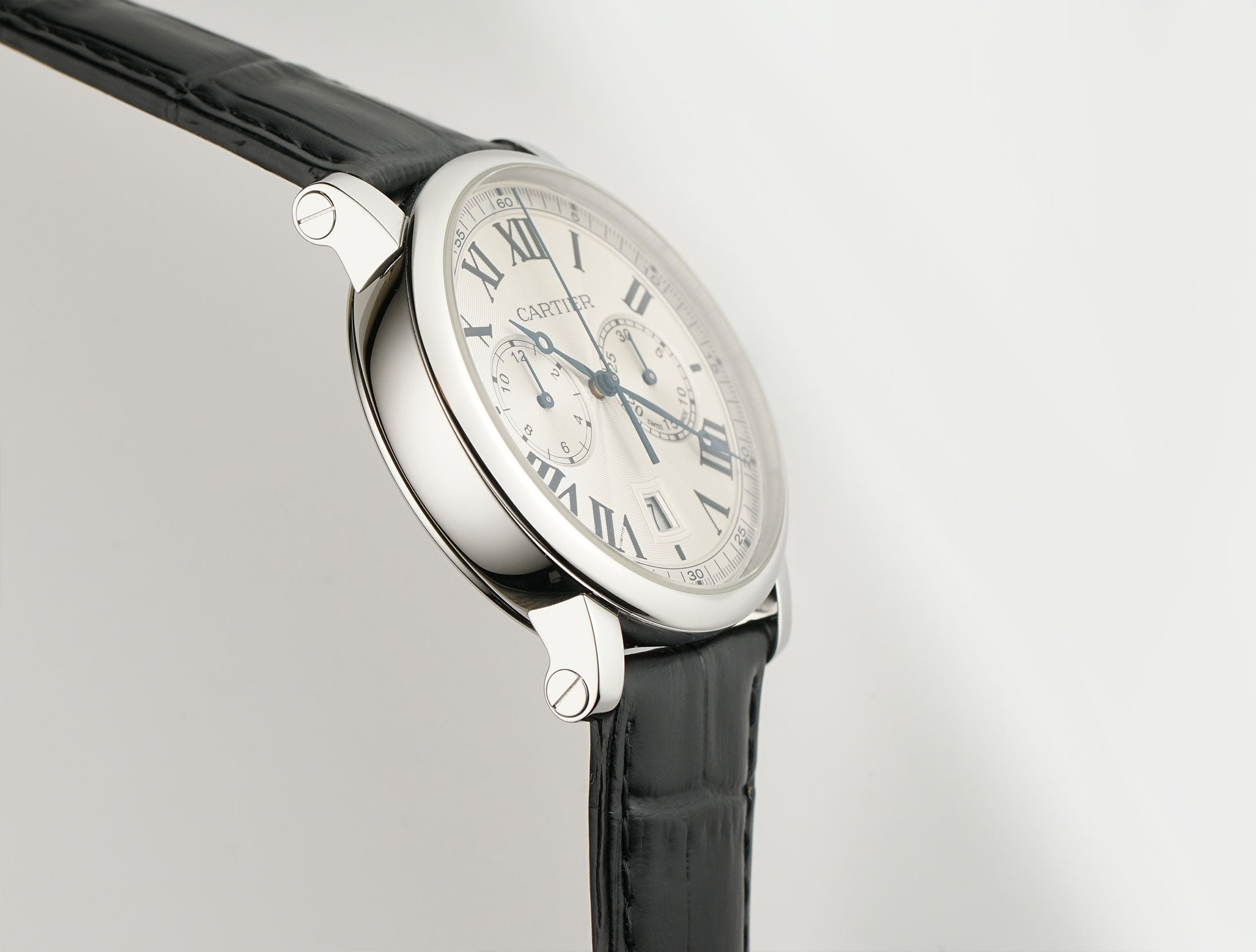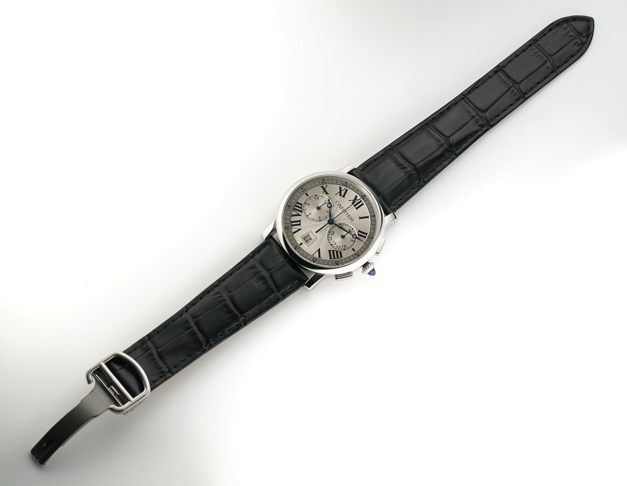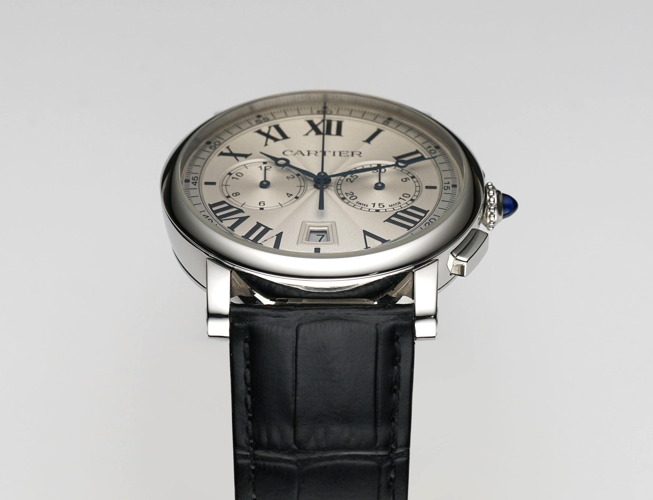 The case and bezel are made of stainless steel all of which displays a mirror finish. It features a stainless steel fluted crown that is equipped with a synthetic sapphire cabochon. Currently mounted on the watch is a Cartier black leather strap (unworn condition) and that is paired with a Cartier stainless steel deployment clasp.