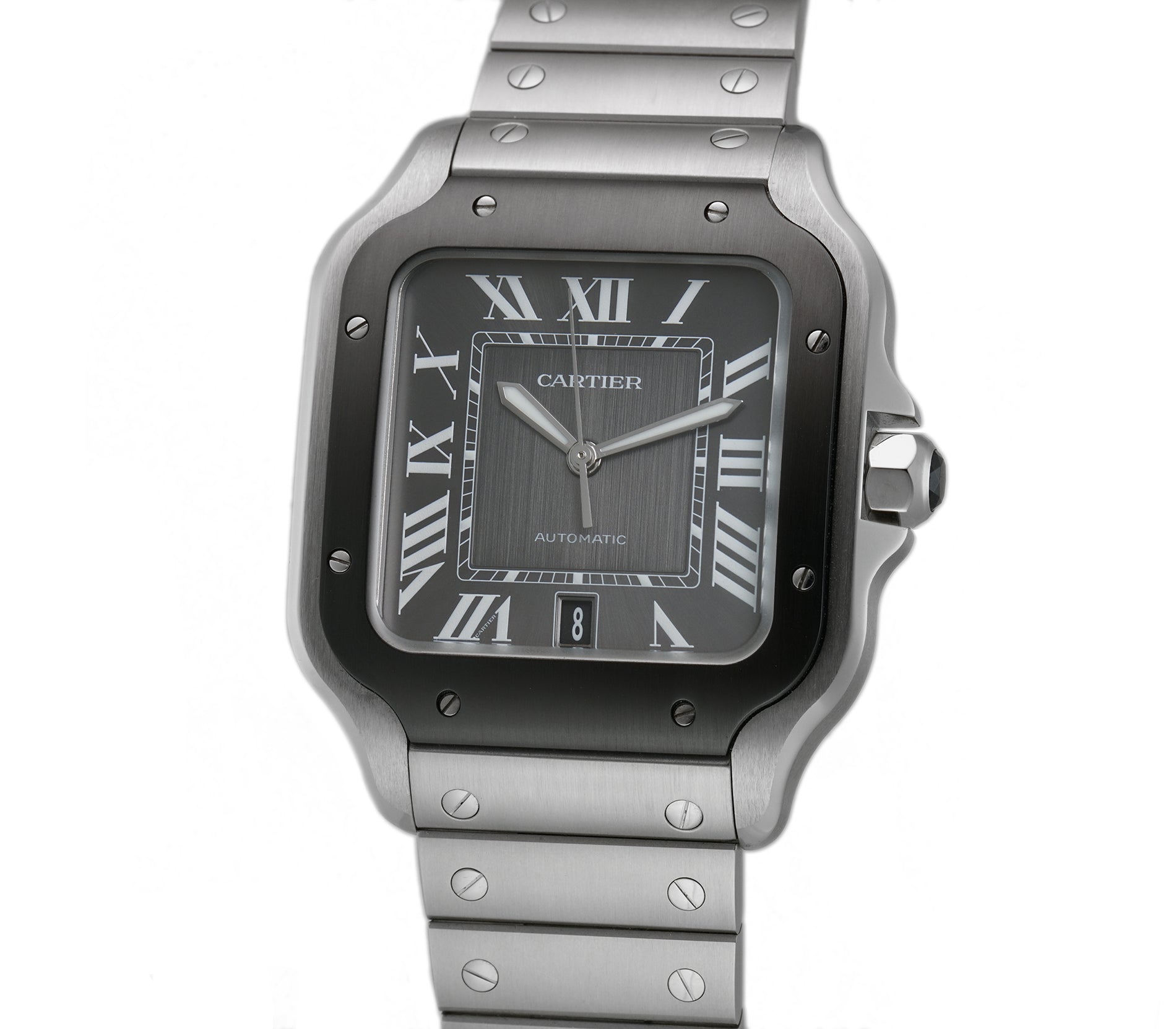 Functions are displayed on a grey dial accompanied by luminescent filled hands and white roman numeral hour markers.