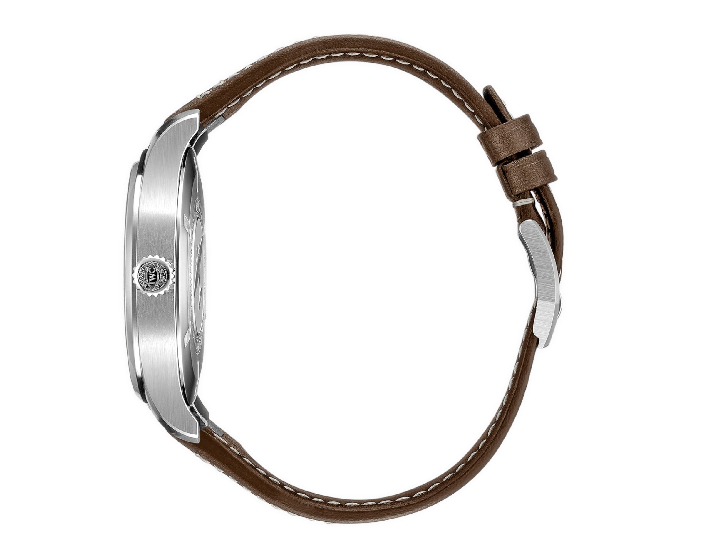 Case is made of stainless steel, most of which is brush-finished, with the exception of the bevels as well as the inner bezel lip which are mirror finish.. The strap mounted on the watch is made of leather strap.