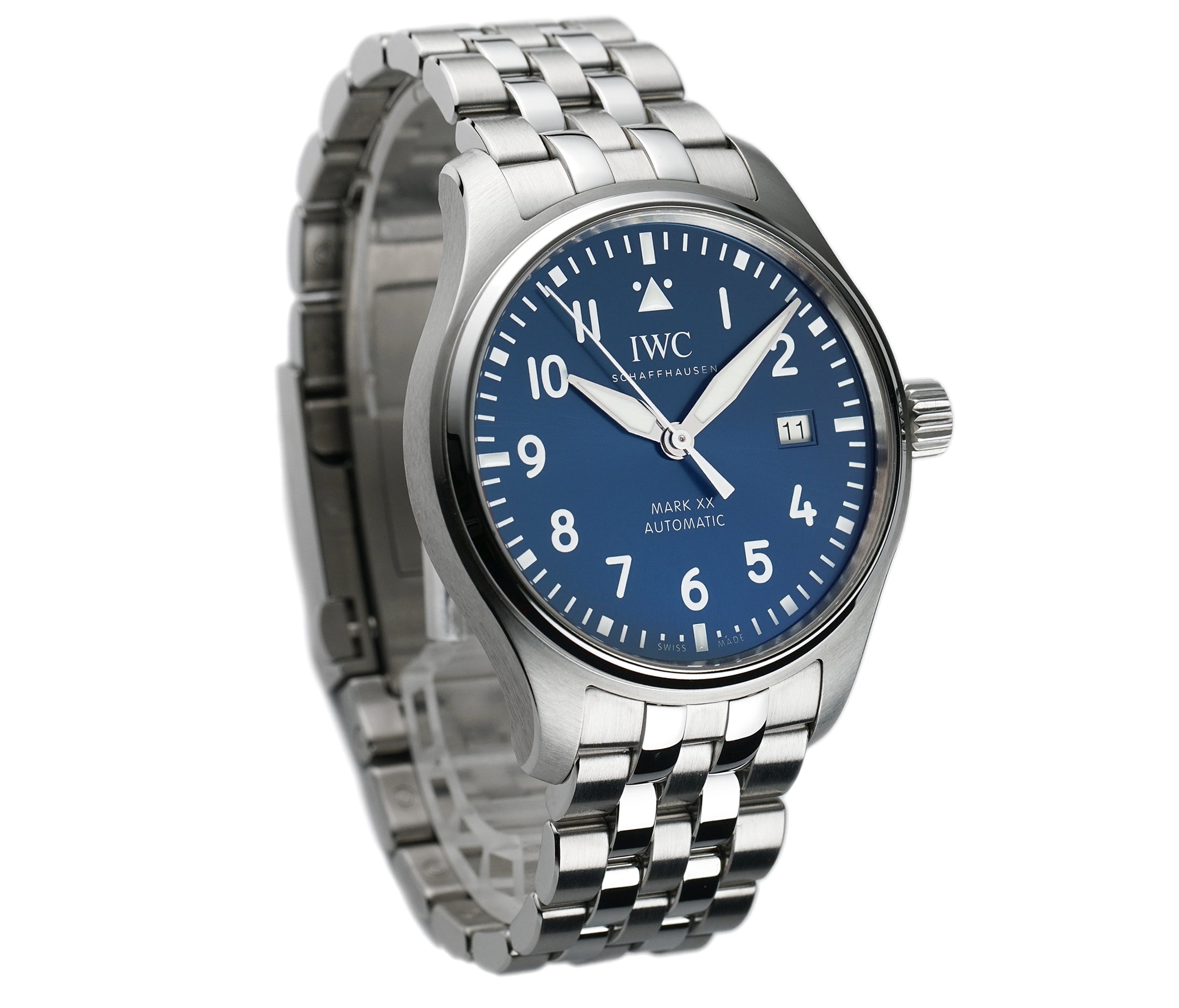 Time and date are displayed on a blue dial that is accompanied by luminescent filled hands and Arabic numeral hour markers. Featured on the dial is a date aperture at 3 o'clock.