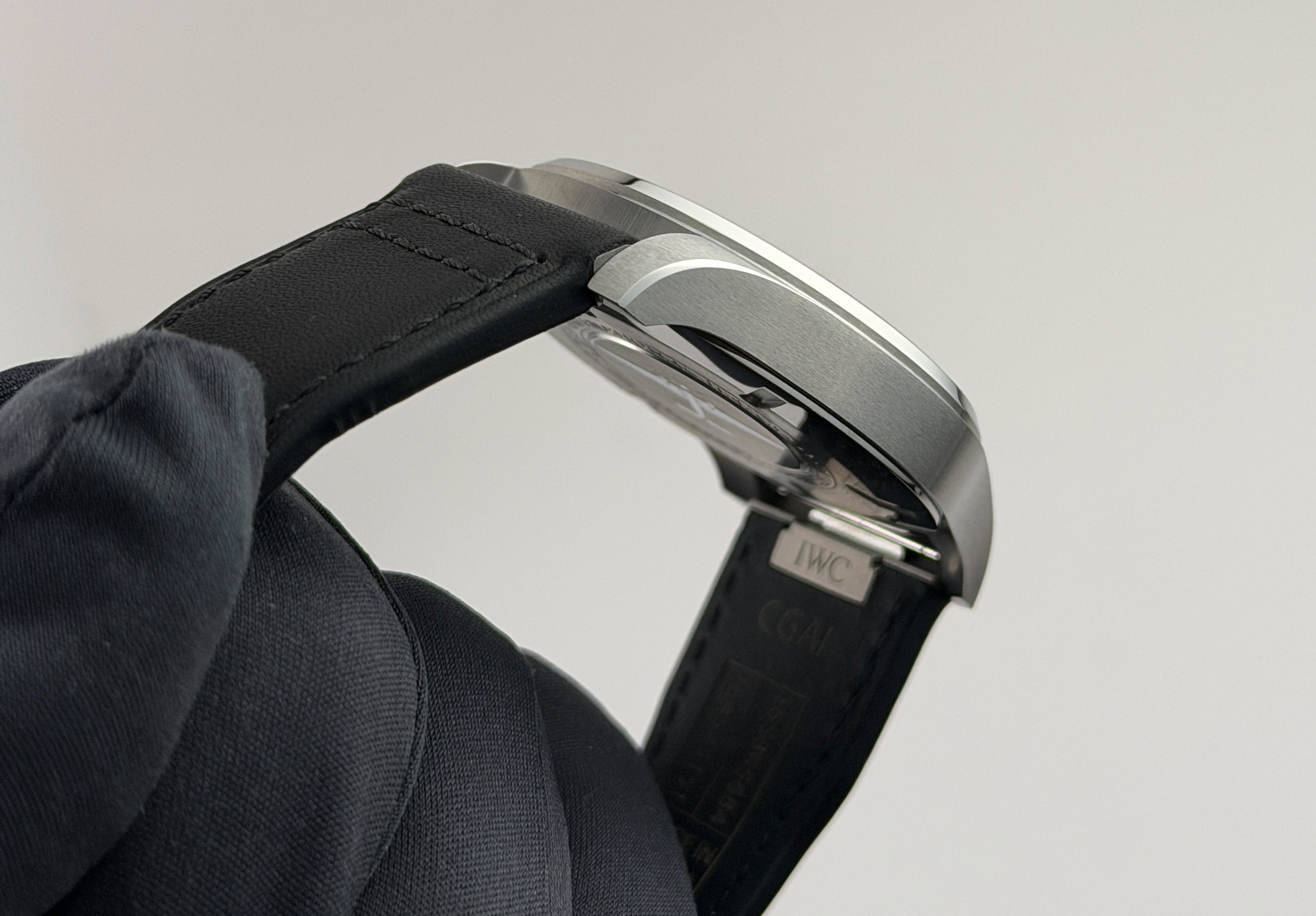 The case is made of stainless steel, most of which is satin-finished, with the exception of the bevels as well as the inner bezel lip which have a mirror finish. Mounted on the watch is a black leather strap with steel tang buckle.