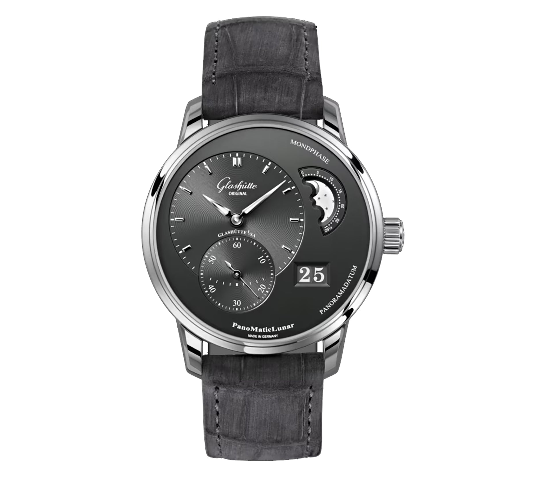 Functions are shown on a grey dial with luminous hands and hour markers. These functions include hours, minutes, sub-seconds, date, and moonphase display.