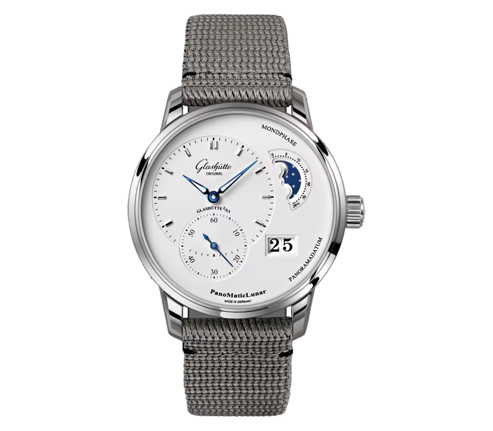 Functions are shown on a silver dial with luminous hands and hour markers. These functions include hours, minutes, sub-seconds, date, and moonphase display.