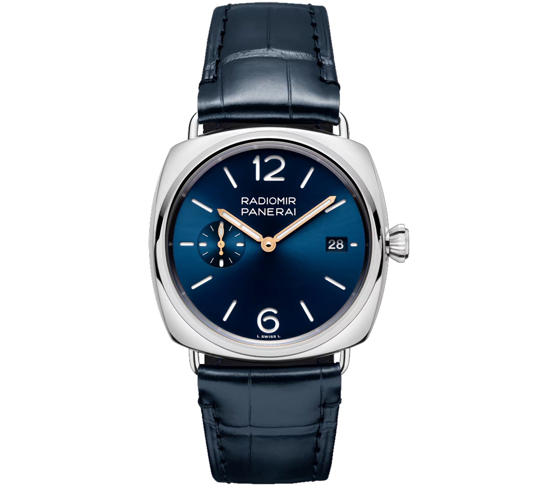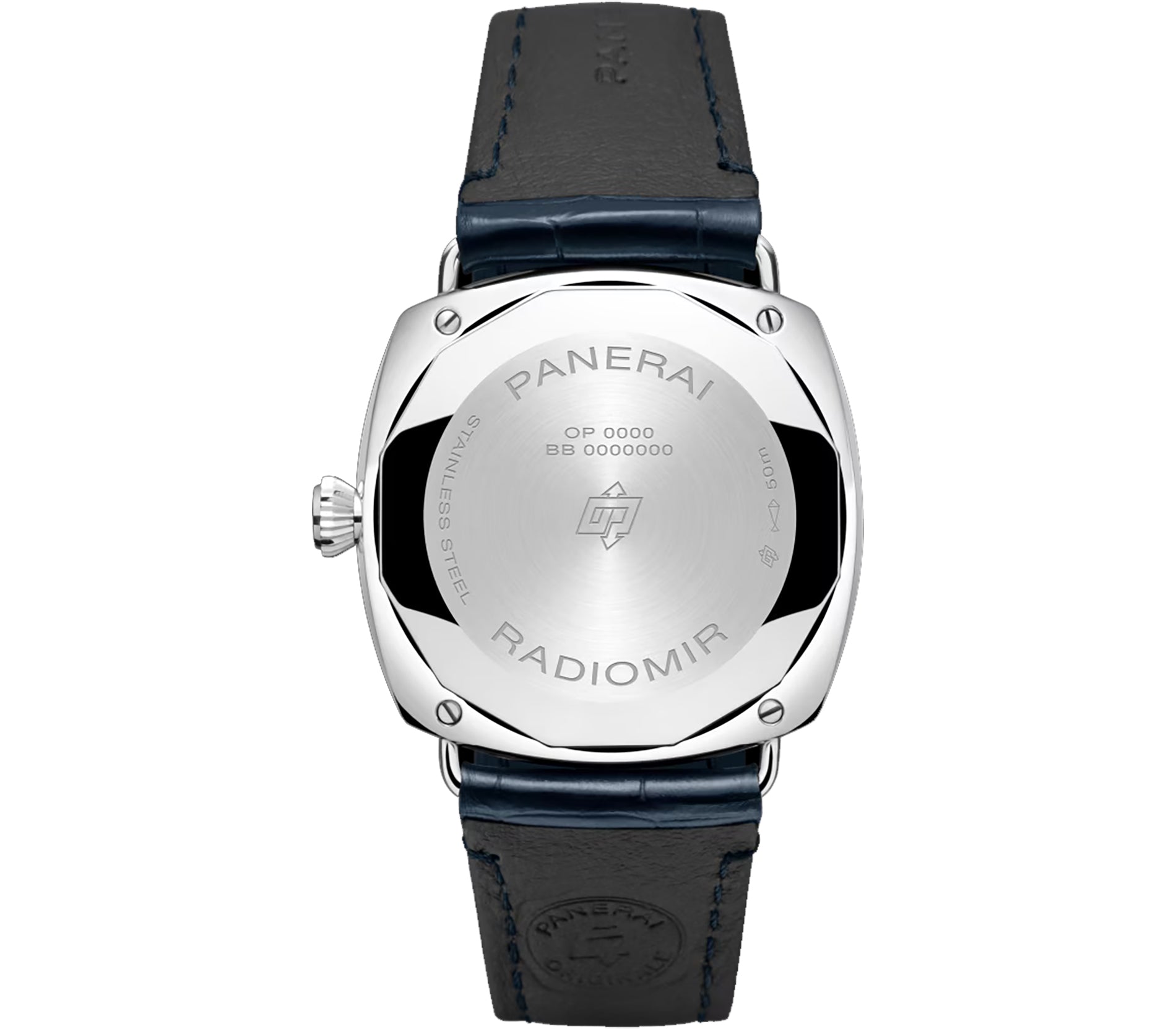 The case is made of a mirror finish including the crown. Mounted atop the case is a mirror finish stainless steel smooth bezel. Paired with the watch is a blue leather strap and a stainless steel buckle.