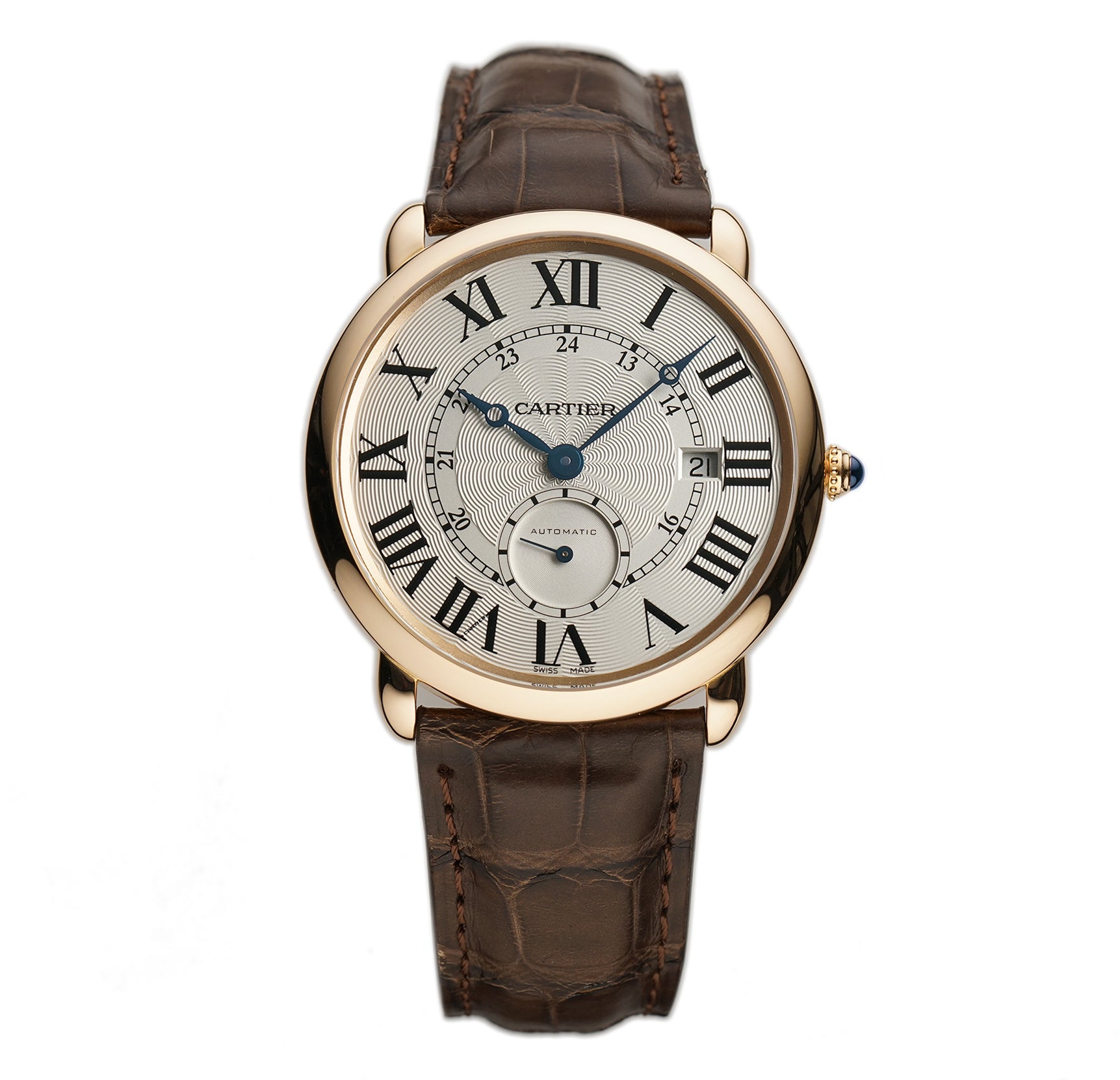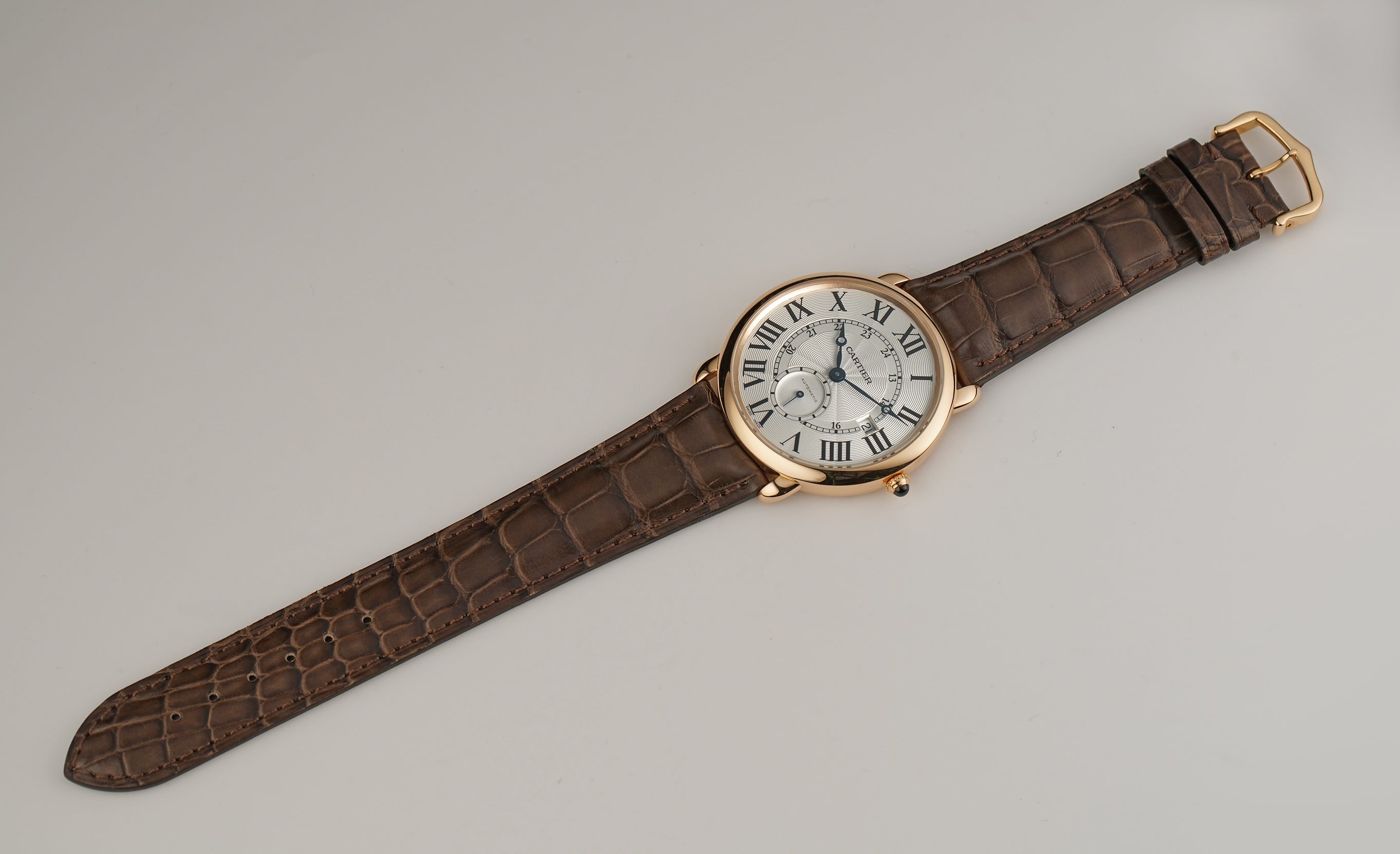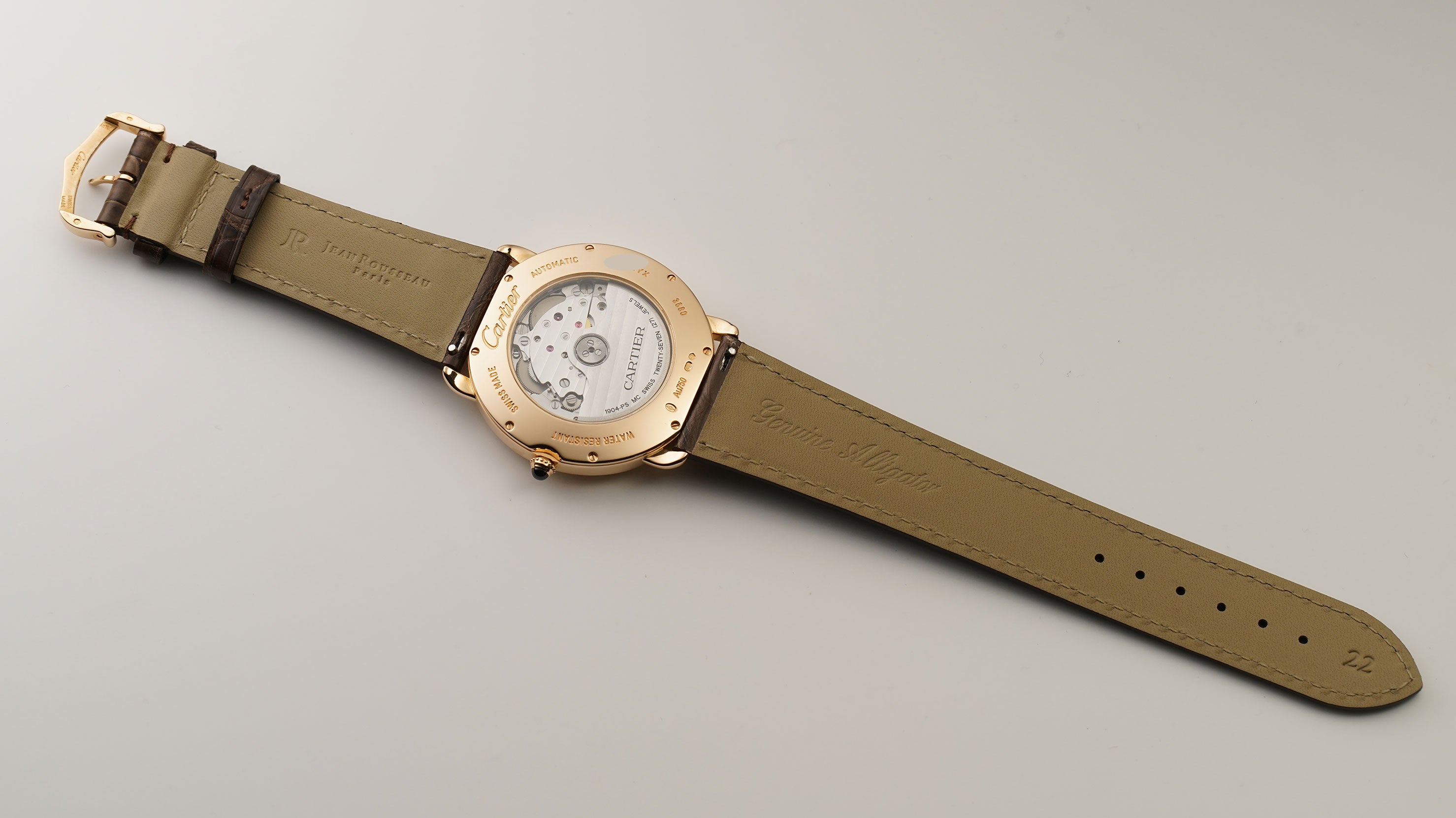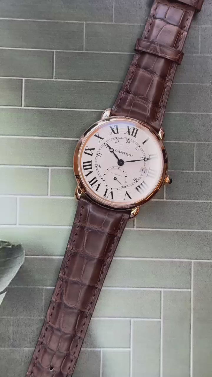 The case is made of 18k rose gold, displaying a mirror finish. It is presented on an unworn Jean Rousseau (high-quality Paris-made) strap. The strap is paired with a Cartier 18k rose gold tang buckle.