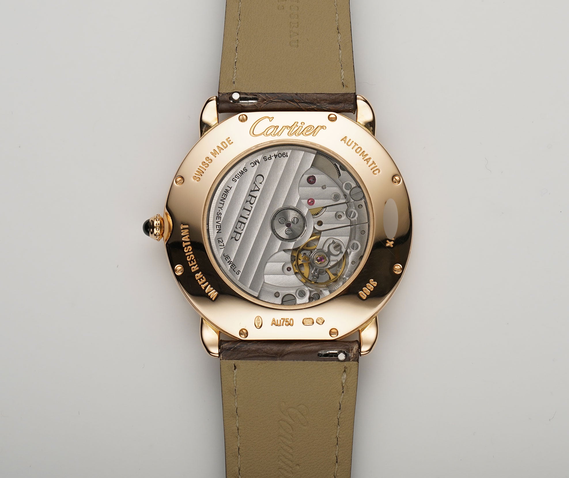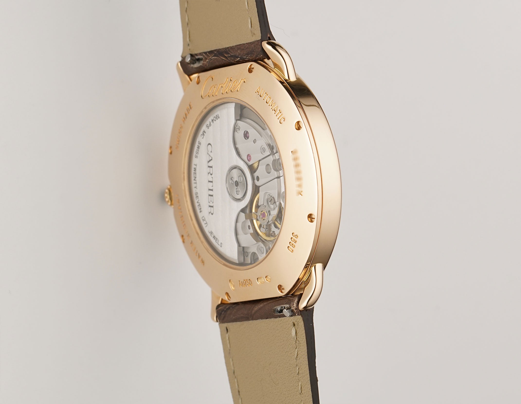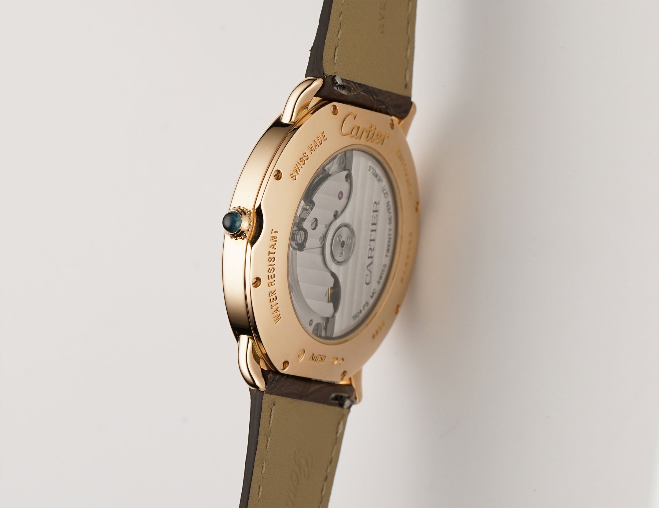 The case is made of 18k rose gold, displaying a mirror finish. It is presented on an unworn Jean Rousseau (high-quality Paris-made) strap. The strap is paired with a Cartier 18k rose gold tang buckle.