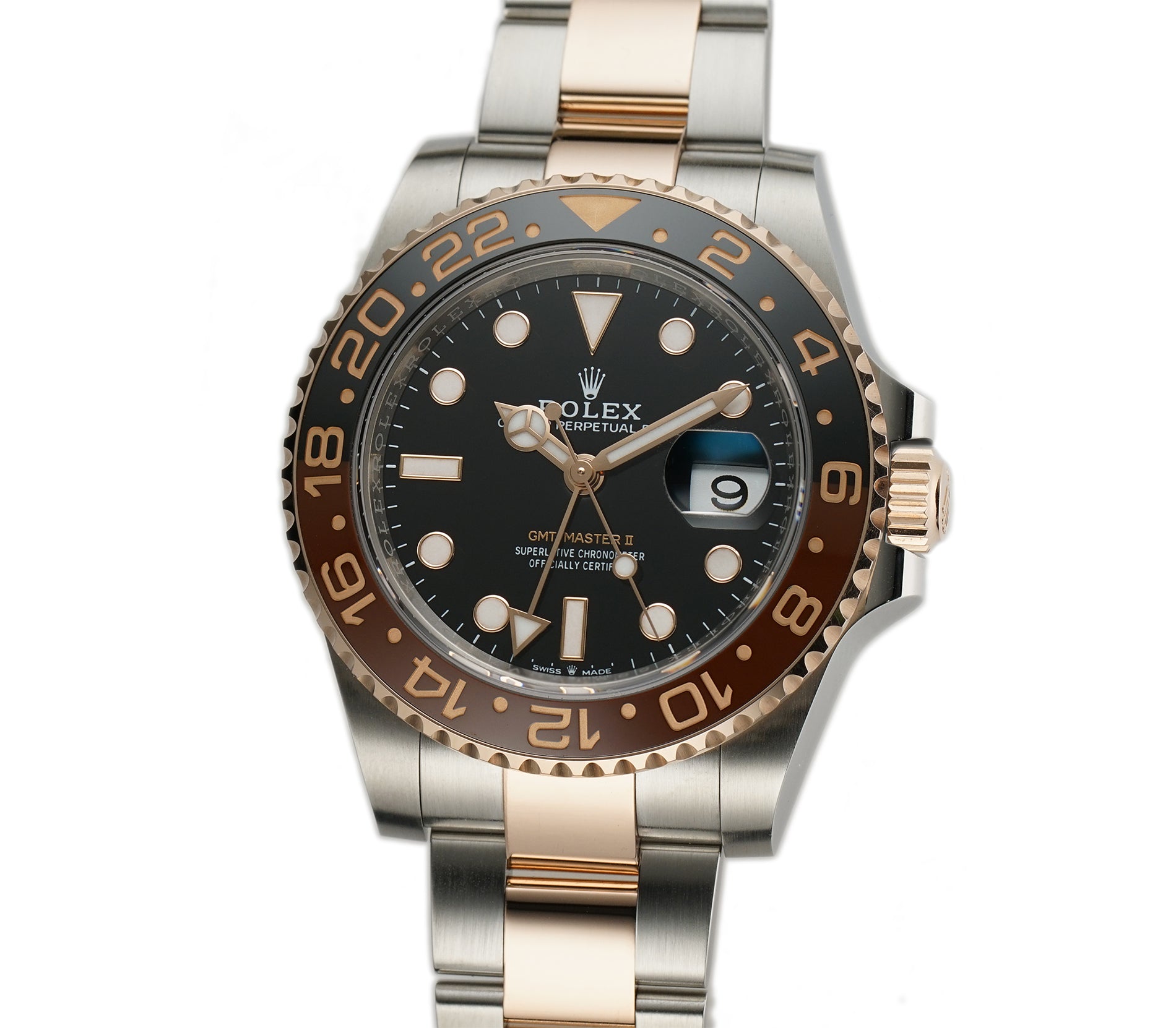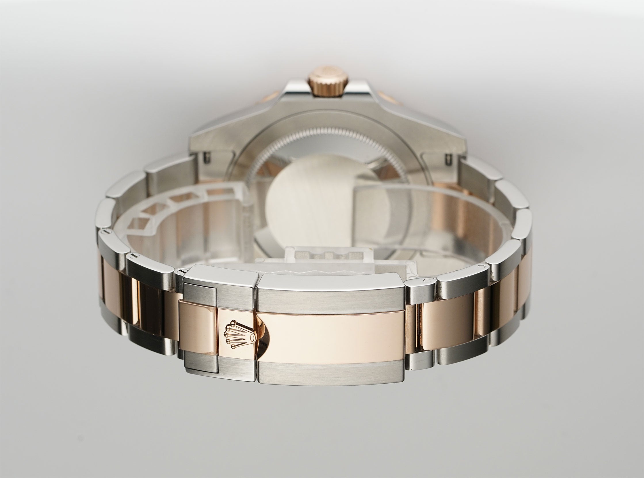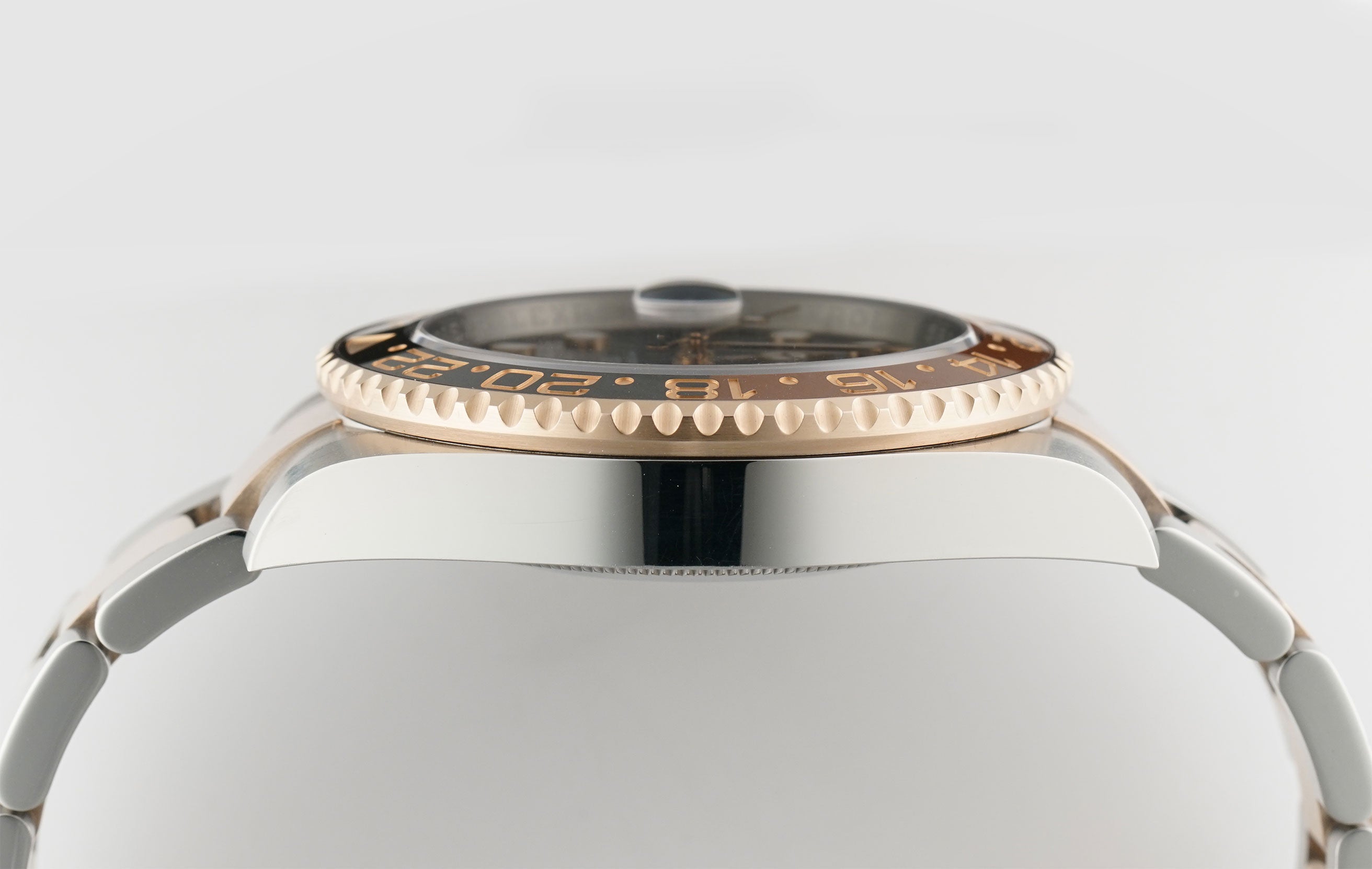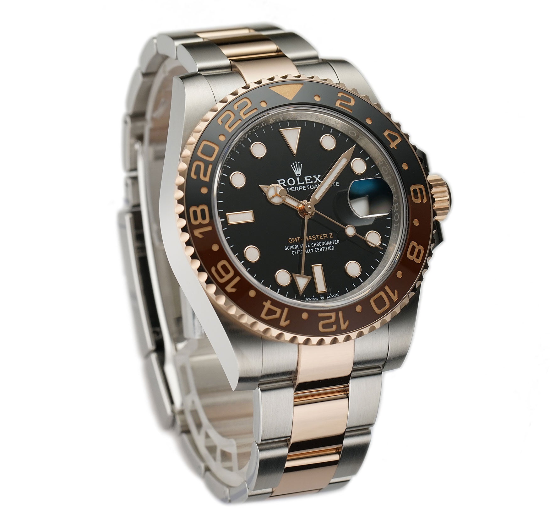 The case of this 126711CHNR is made of mirror-finished stainless steel sides and satin-finished stainless steel lugs. Mounted atop the case is an 18k rose gold bezel which is equipped with a brown and black ceramic bezel insert (Root Beer). The case has a stainless steel screw-down case back as well as an 18k rose gold screw-down crown. The oyster bracelet has mirror-finished 18k rose gold center links and satin-finished stainless steel outer links, fits an approximate 7 inch wrist.
