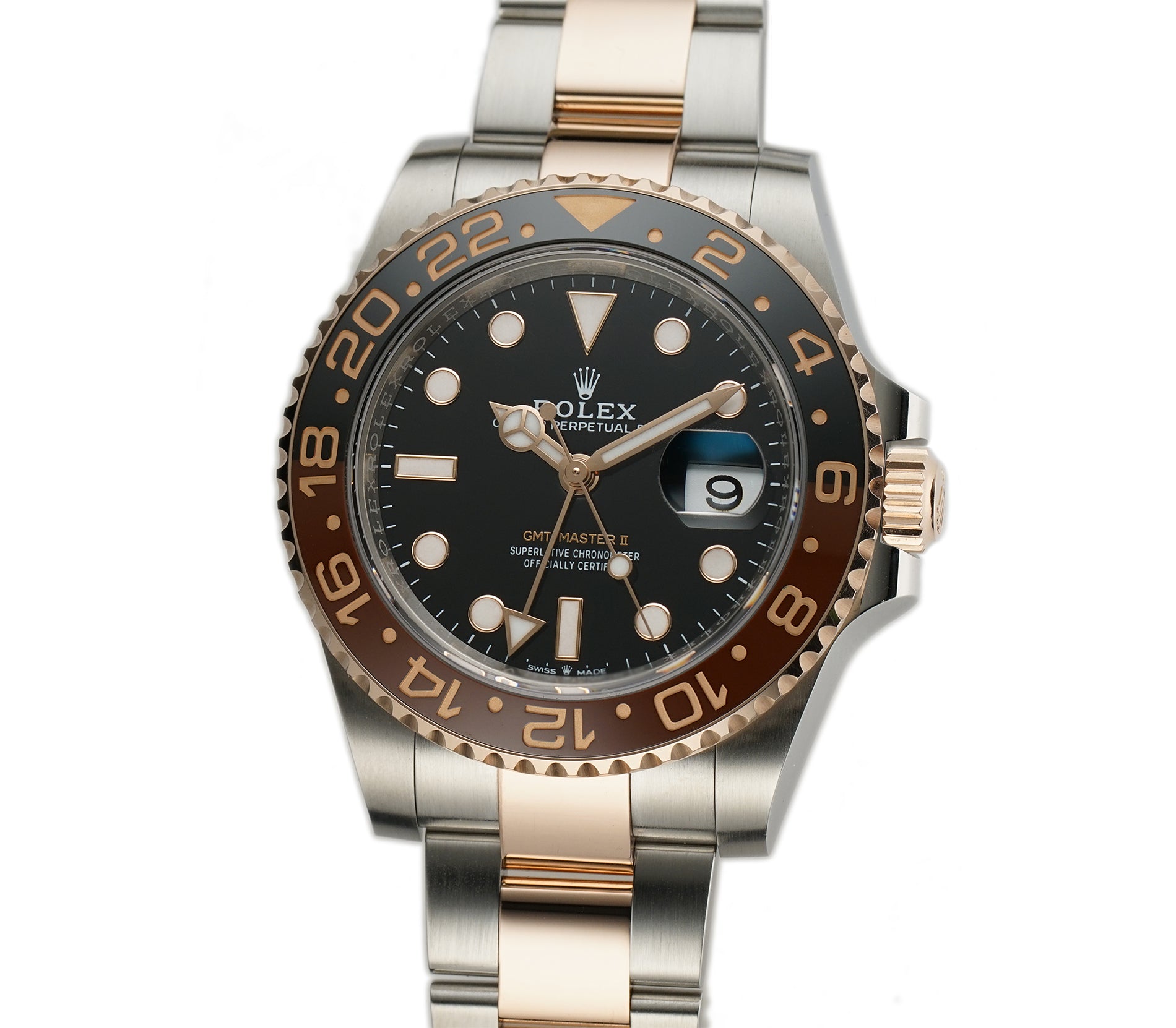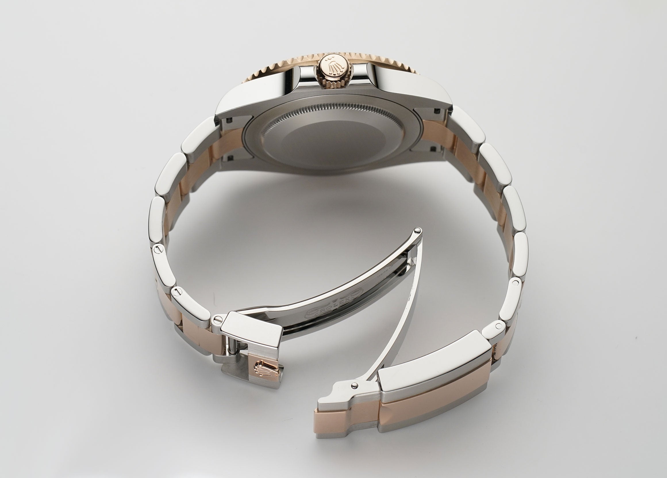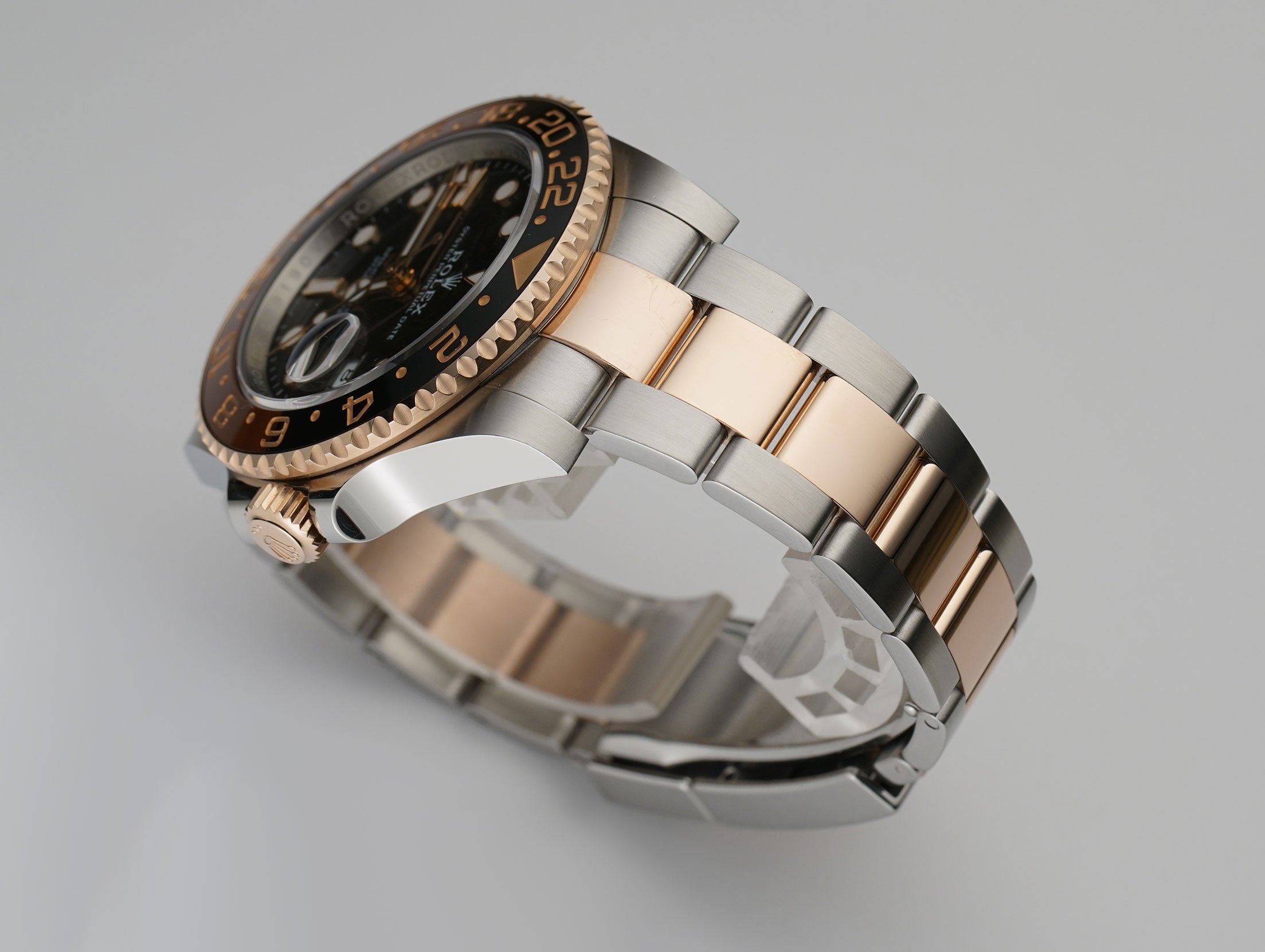 The case of this 126711CHNR is made of mirror-finished stainless steel sides and satin-finished stainless steel lugs. Mounted atop the case is an 18k rose gold bezel which is equipped with a brown and black ceramic bezel insert (Root Beer). The case has a stainless steel screw-down case back as well as an 18k rose gold screw-down crown. The oyster bracelet has mirror-finished 18k rose gold center links and satin-finished stainless steel outer links, fits an approximate 7 inch wrist.
