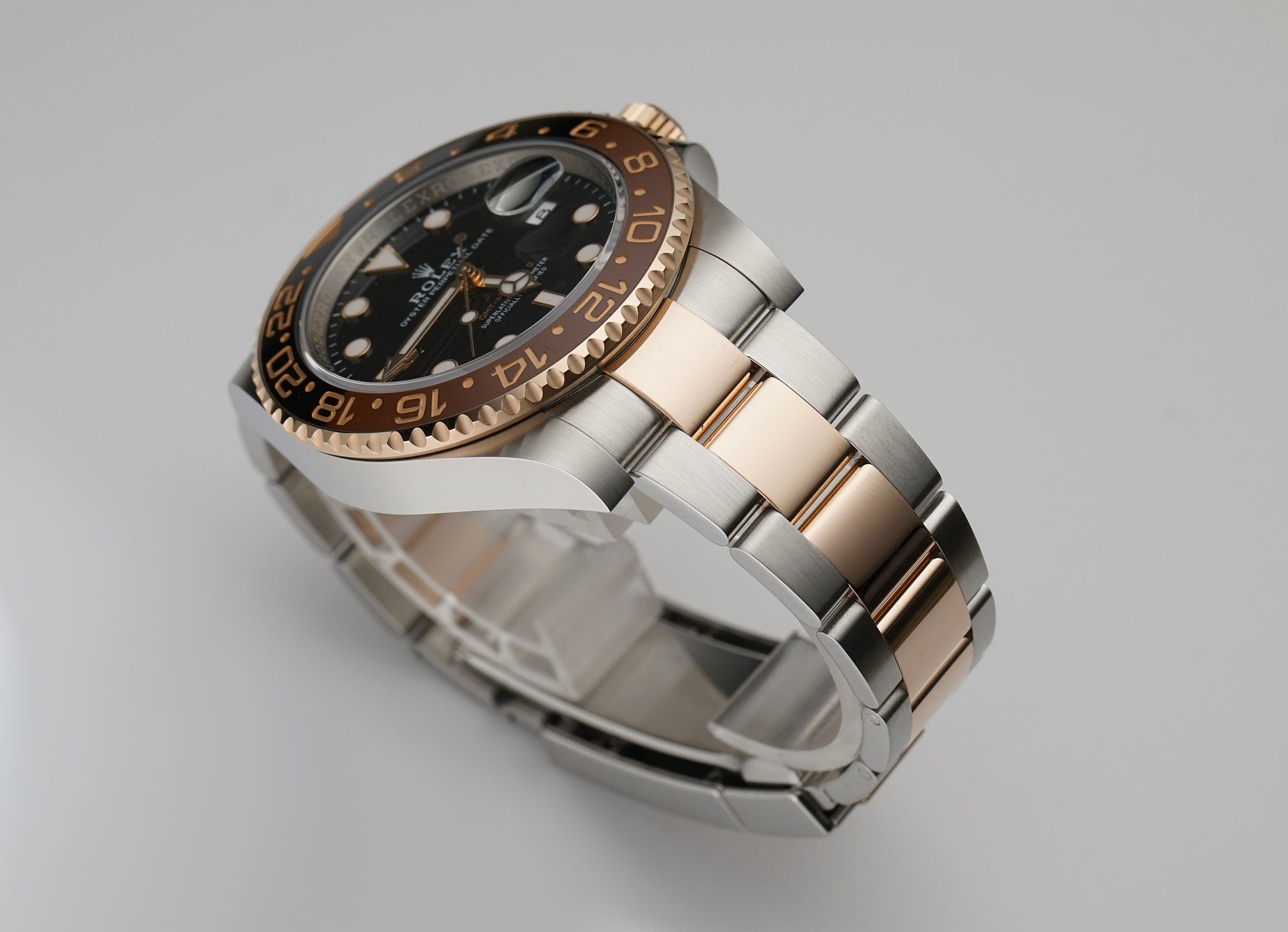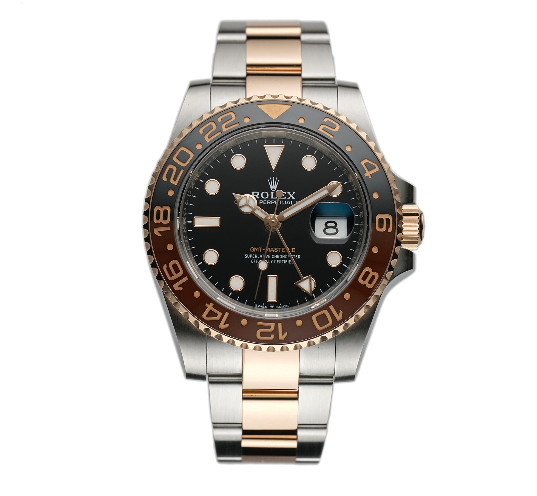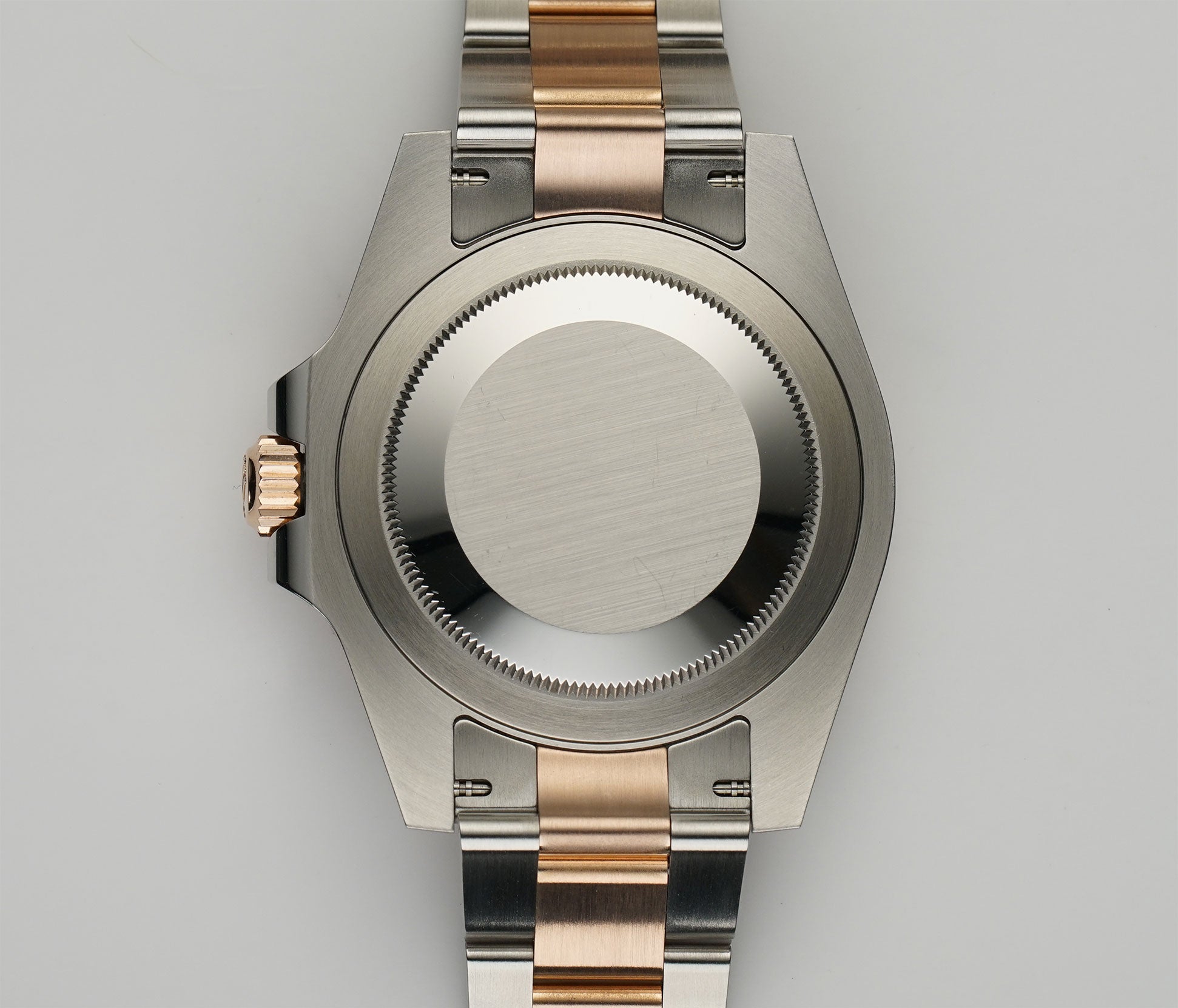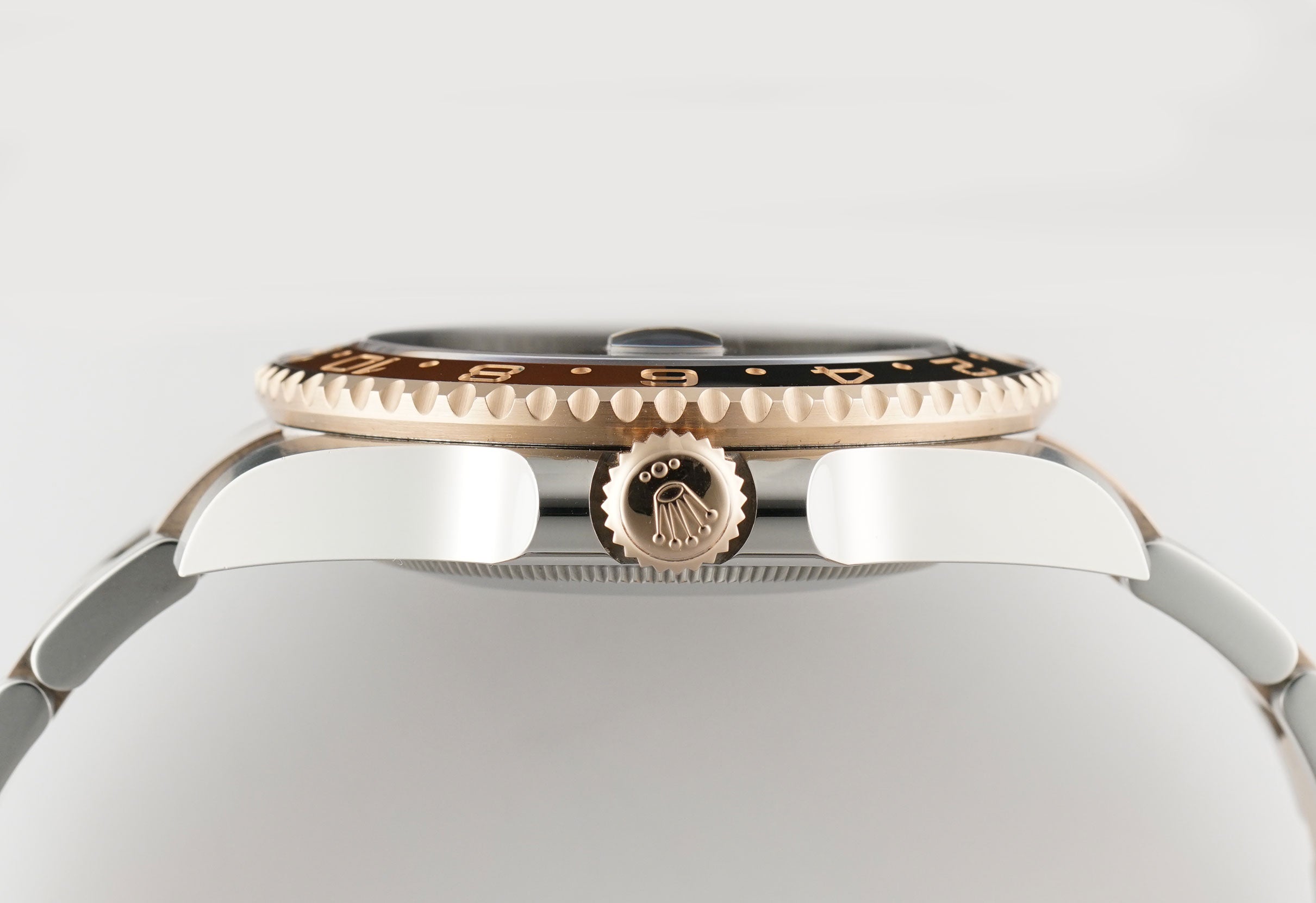 The case of this 126711CHNR is made of mirror-finished stainless steel sides and satin-finished stainless steel lugs. Mounted atop the case is an 18k rose gold bezel which is equipped with a brown and black ceramic bezel insert (Root Beer). The case has a stainless steel screw-down case back as well as an 18k rose gold screw-down crown. The oyster bracelet has mirror-finished 18k rose gold center links and satin-finished stainless steel outer links, fits an approximate 7 inch wrist.
