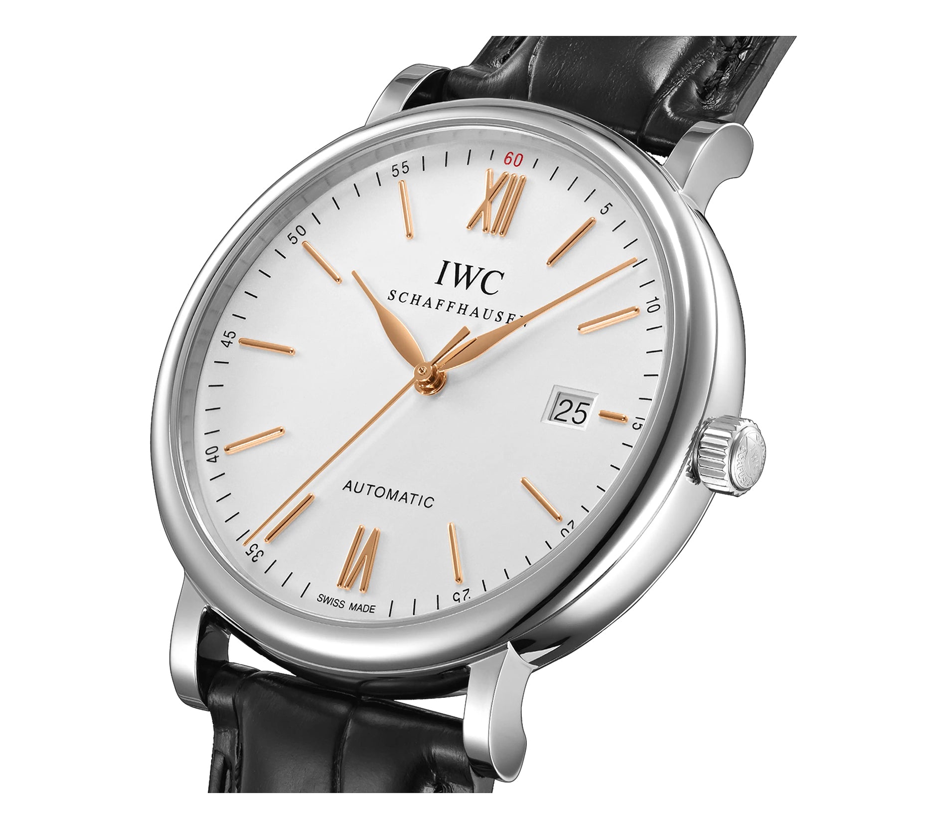 Time and date are displayed on a silver dial that is accompanied by gold applied hands and hour markers. Featured on the dial is a date aperture at 3 o'clock.