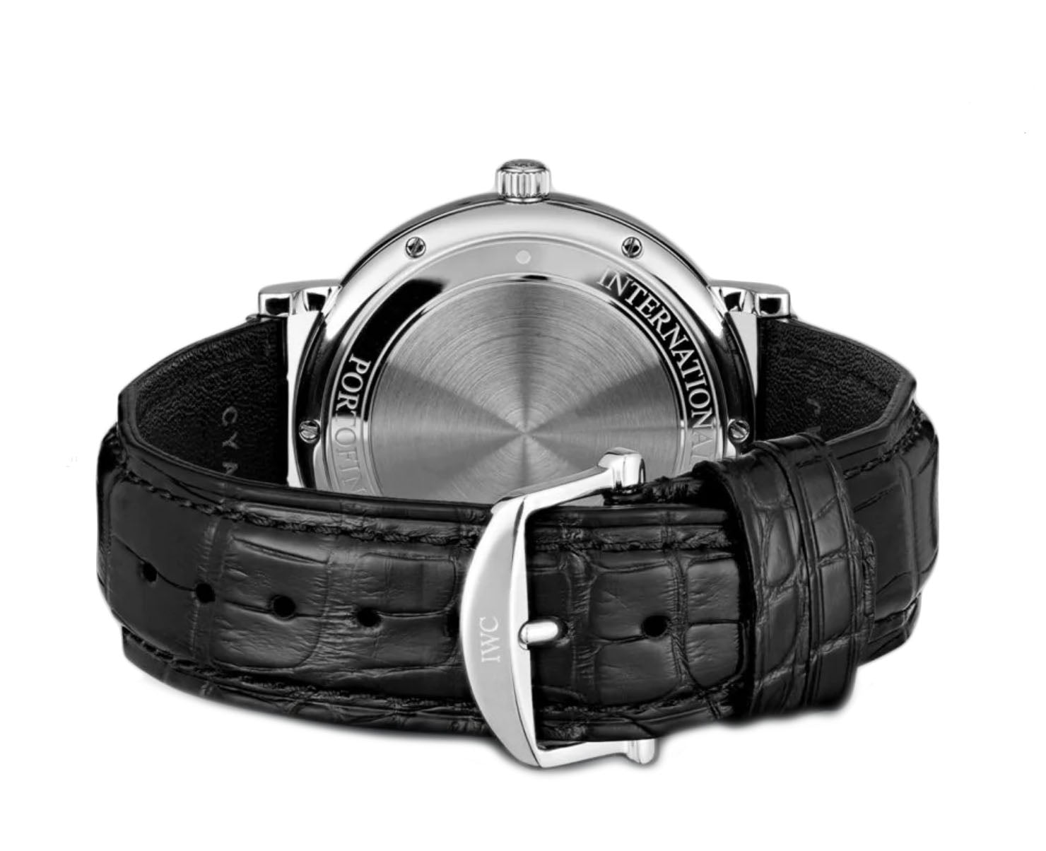Case is made of mirror finished stainless steel as is the fixed bezel mounted atop. Mounted atop is a black alligator leather strap with tank buckle.