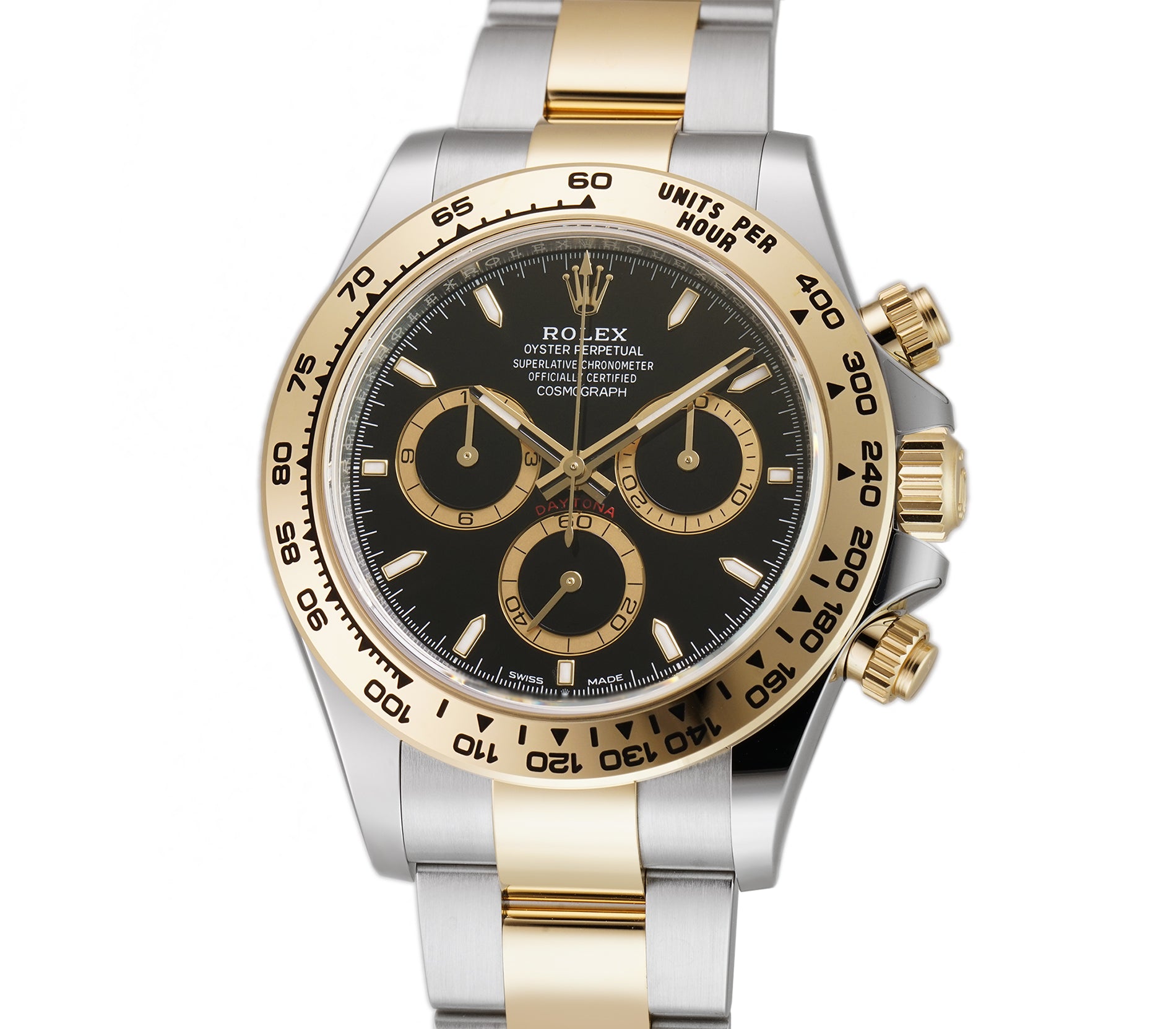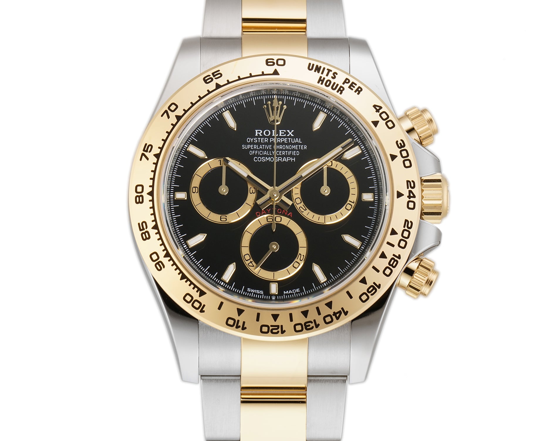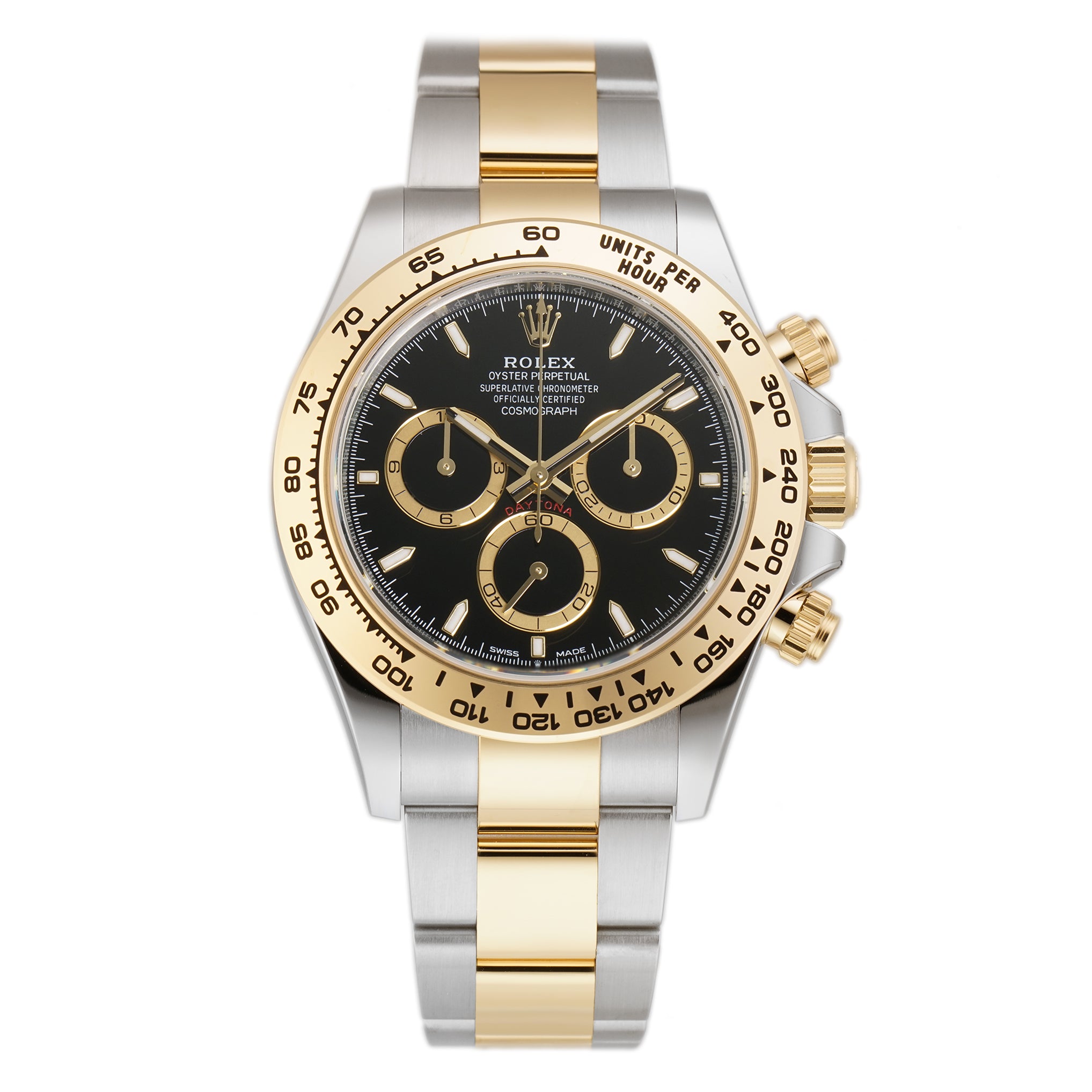 Case is made of high-polish finished yellow gold while the tachymeter-scaled bezel mounted atop is of yellow gold too. As for the oyster bracelet, it features brush-finished stainless steel outer links as well as high-polish finished yellow gold center links down the middle.