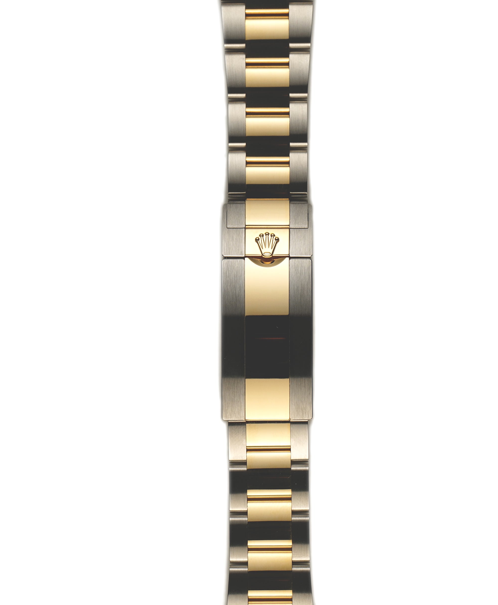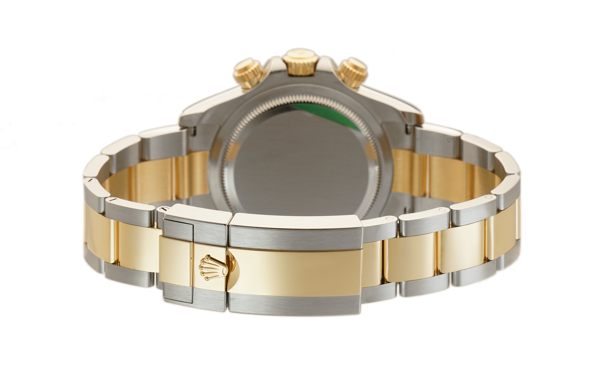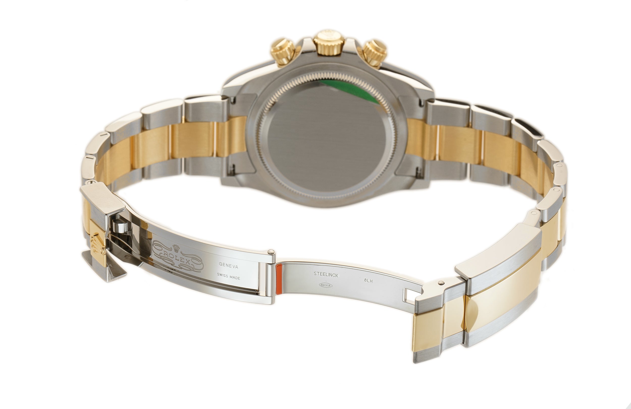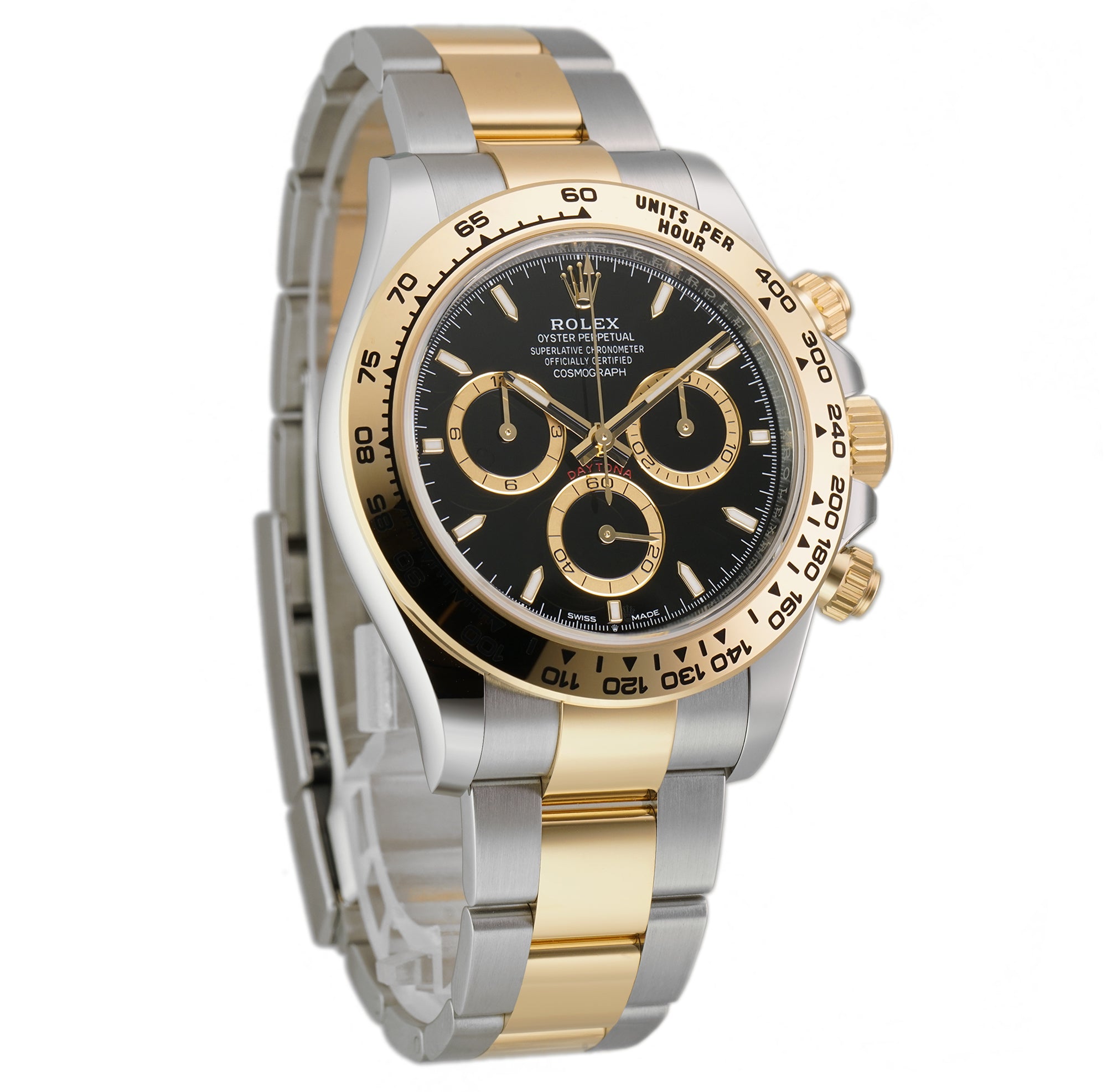 Case is made of high-polish finished yellow gold while the tachymeter-scaled bezel mounted atop is of yellow gold too. As for the oyster bracelet, it features brush-finished stainless steel outer links as well as high-polish finished yellow gold center links down the middle.