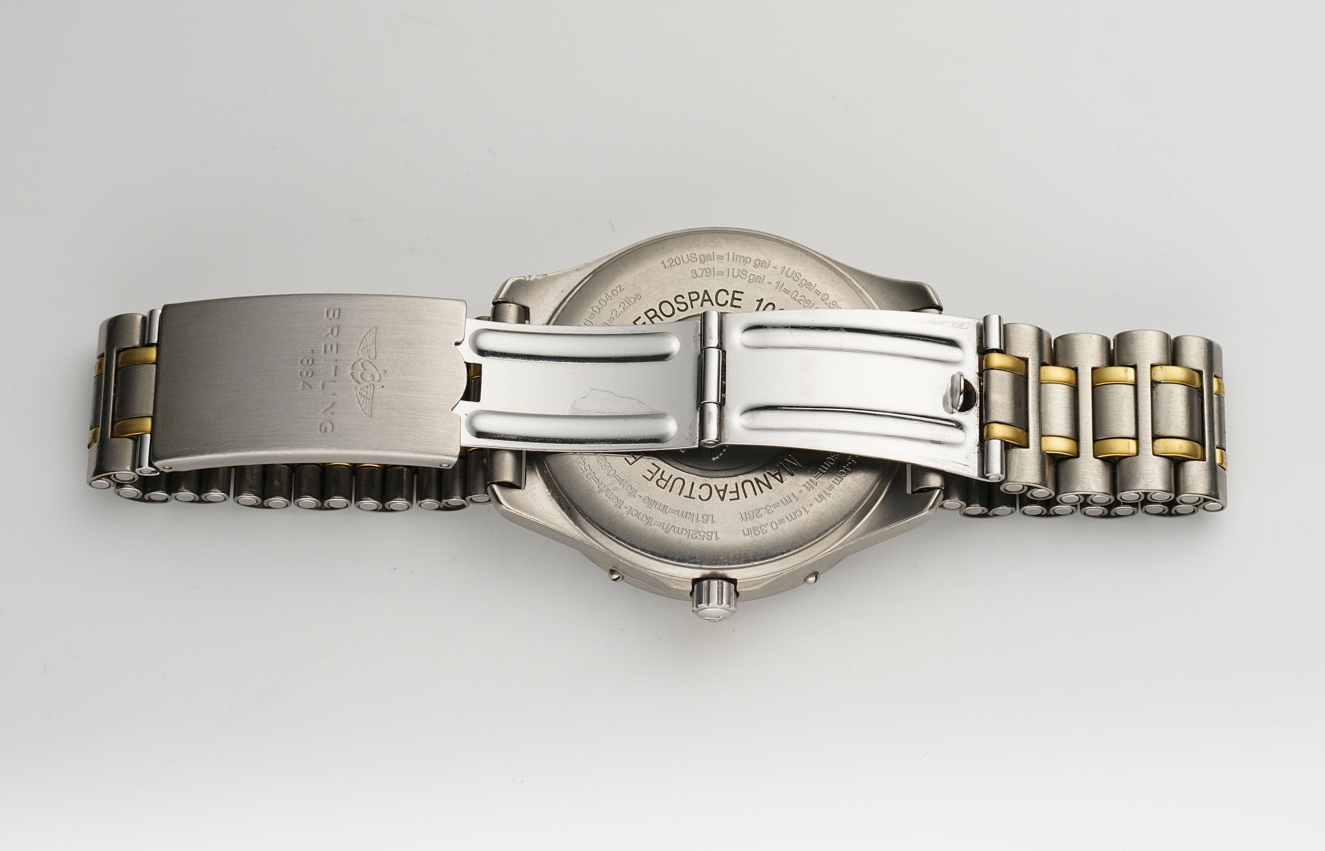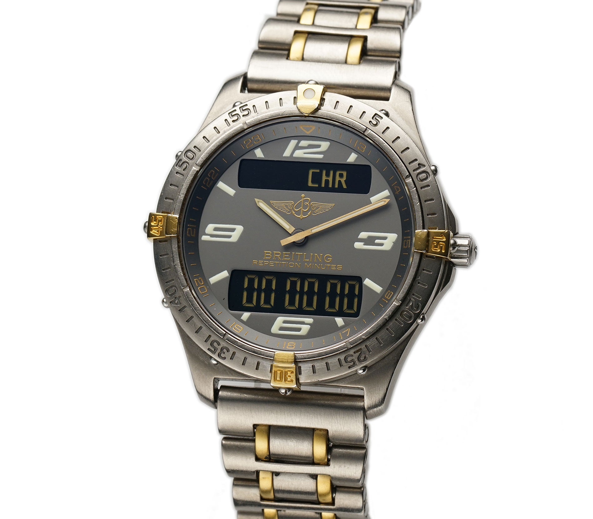 The case is made of a satin finished titanium as is the 60-minute scaled bezel, but the bezel is equipped with 18k yellow gold quarter hour riders. It is paired with a satin finished titanium Breitling bracelet that has 18k yellow gold elements down the middle. The bracelet fits up to an approximate 7 inch wrist comfortably.