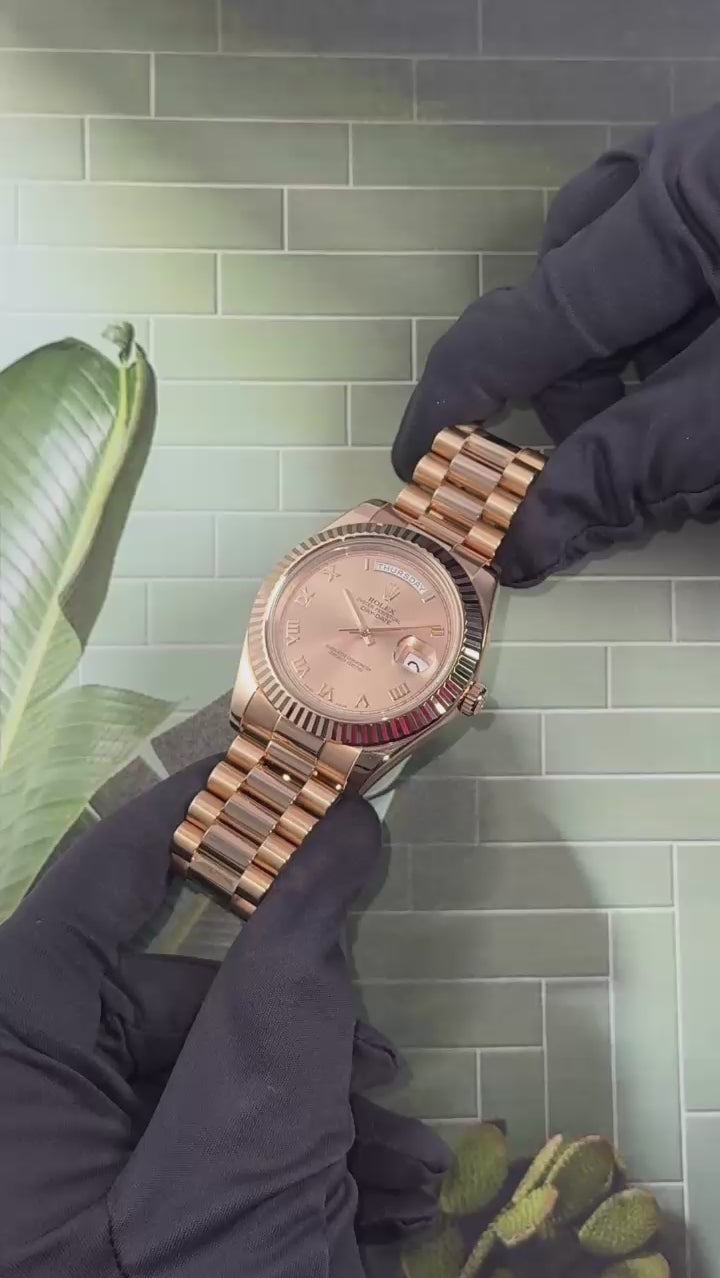 The case is made of mirror-finished 18k everose gold and equipped with a high-mirror-finished 18k everose gold fluted bezel. Both crown and case back are 18k everose gold as well as screw-down. The watch comes on a 18k everose gold presidential bracelet (full factory links, fit's up to 8 inch wrist), which features mirror-finished links down the middle and satin-finished links on the outskirts.