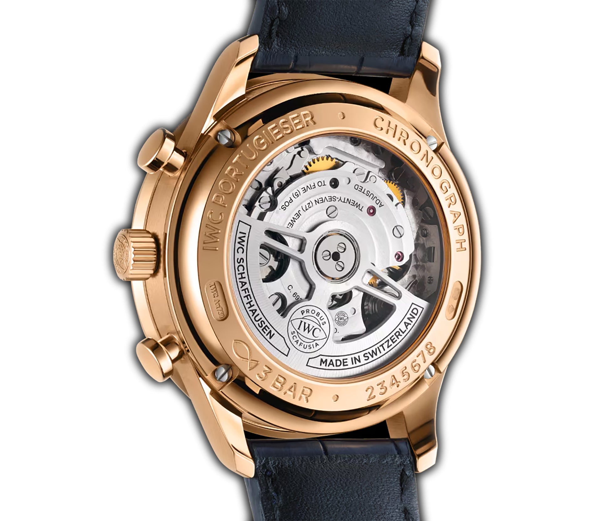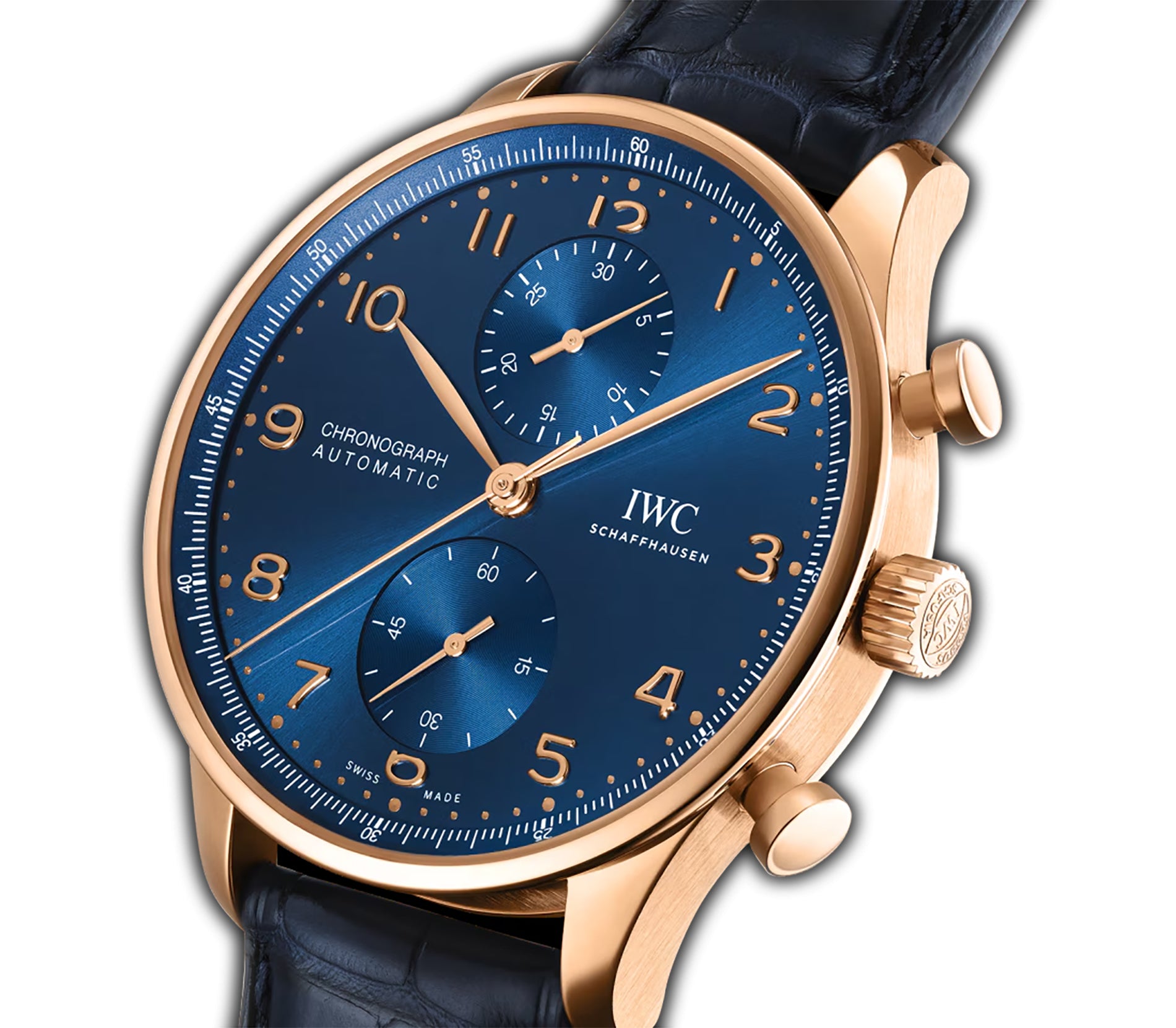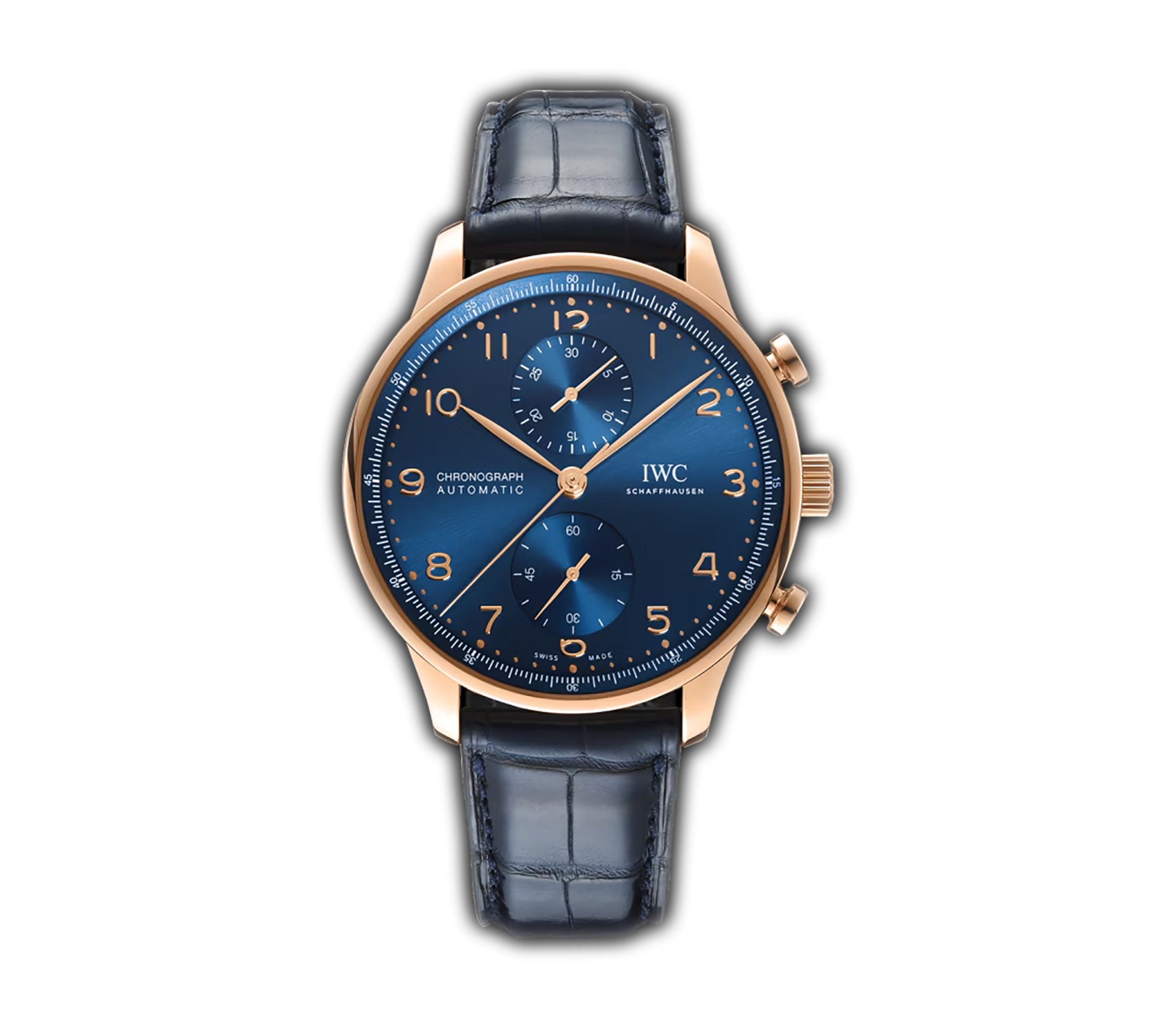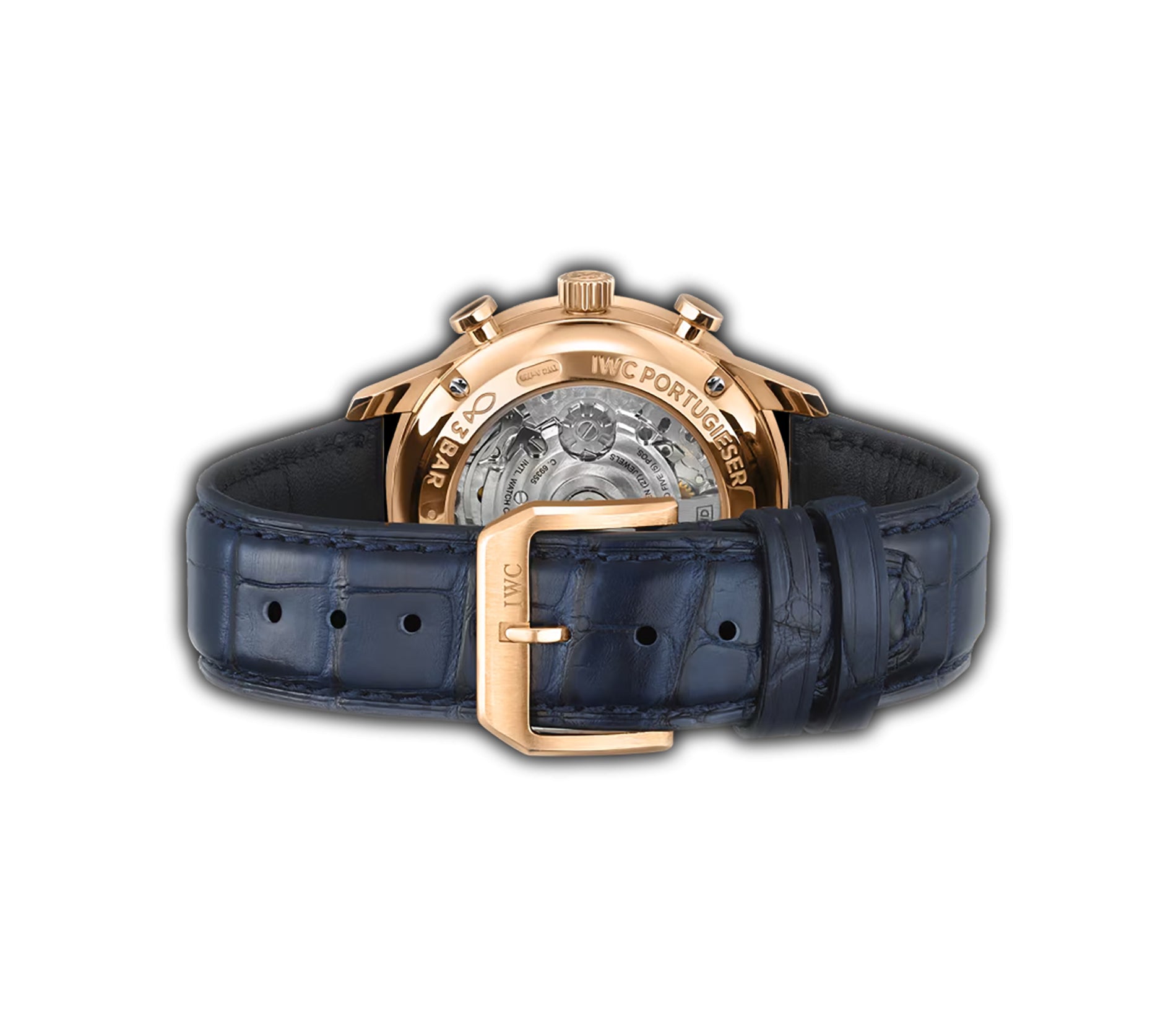 Case is made of a high polished finish 18k rose gold on the top of the lugs and crown and pushbuttons and a brushed finish on the sides of the case. This watch also features an exhibition case back from which all the complications can be seen. Mounted atop the case is a high polished finish 18k rose gold bezel. The watch is paired with a blue leather strap with an 18k rose gold brushed finish deployment buckle.
