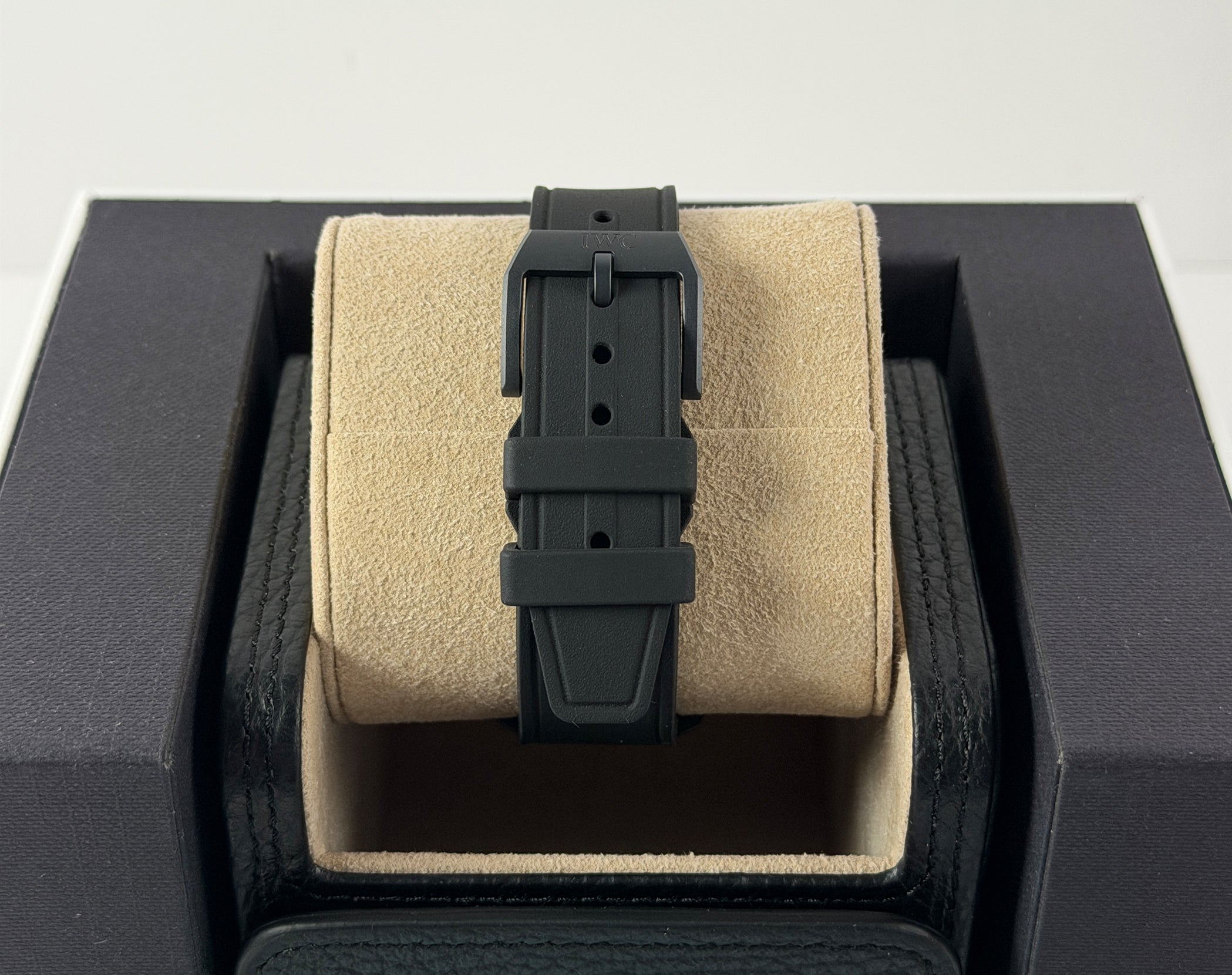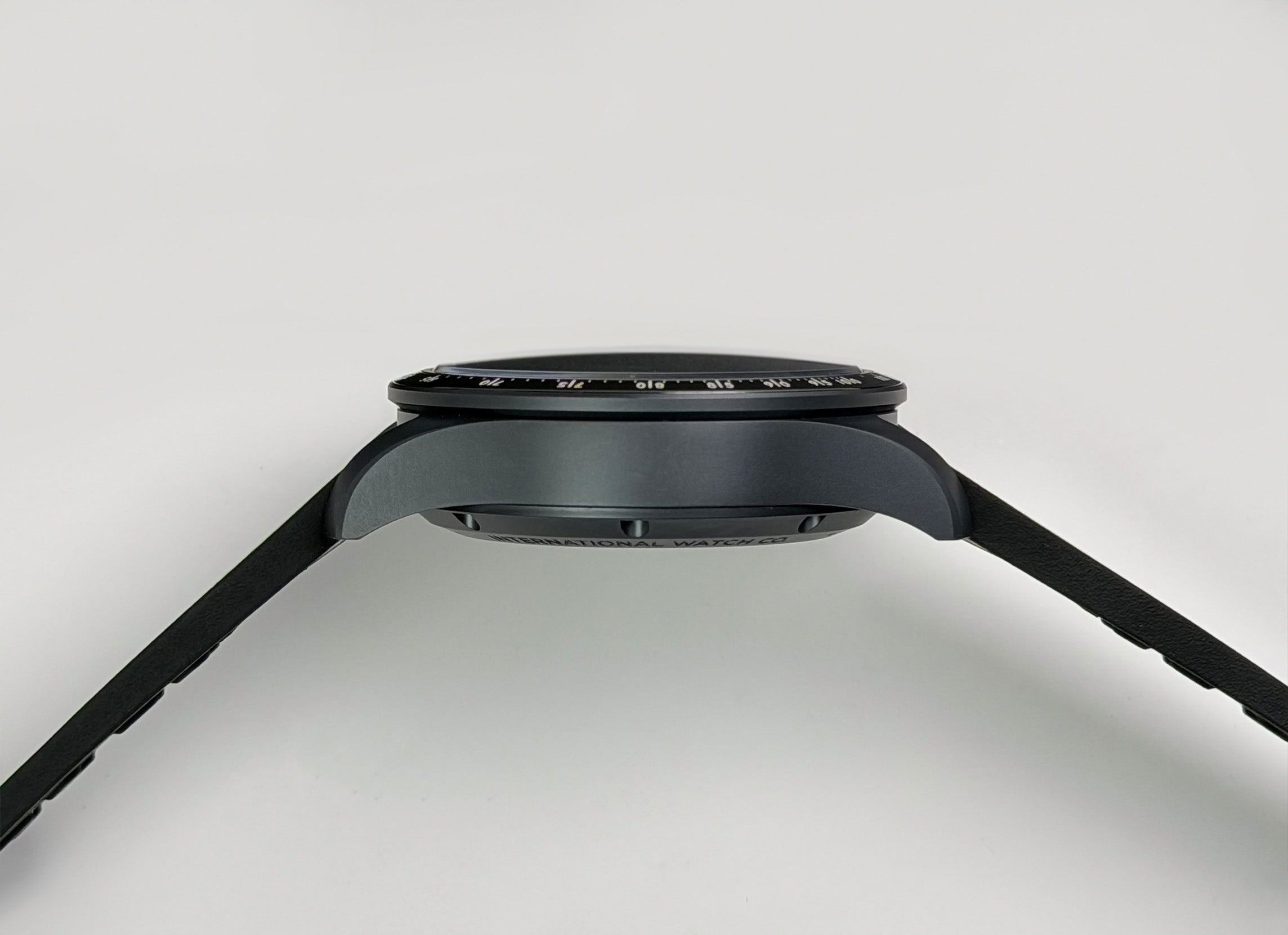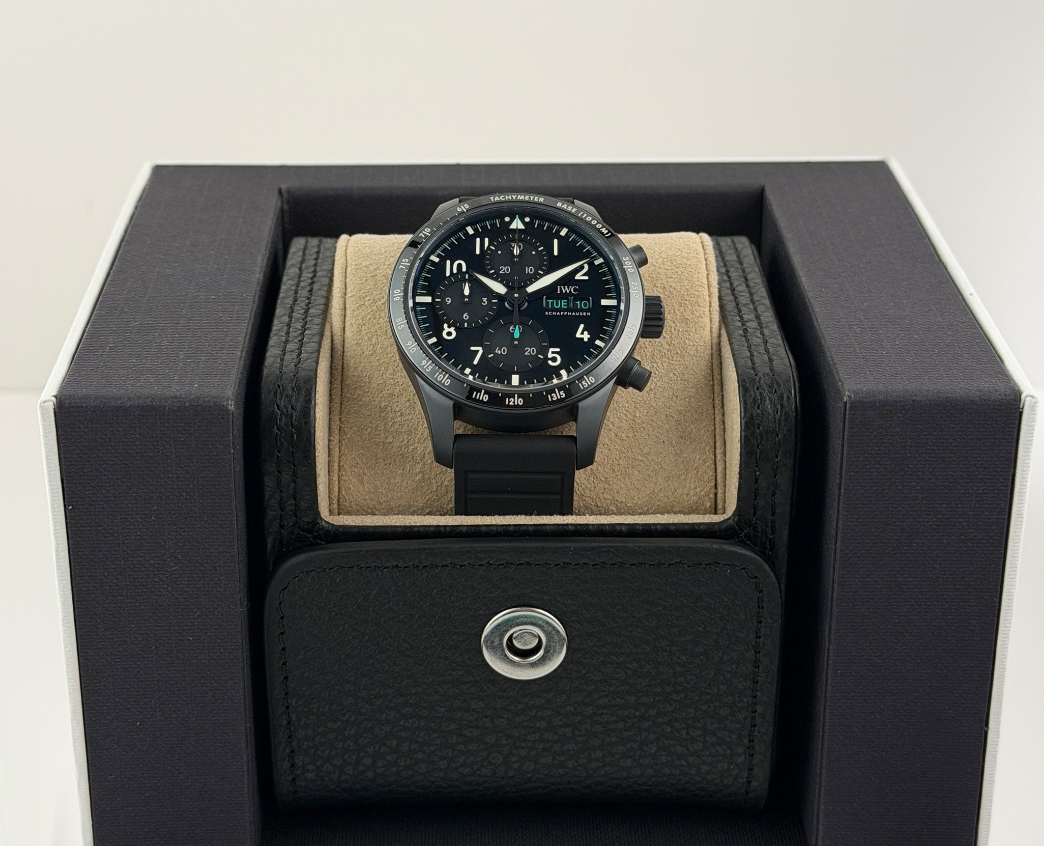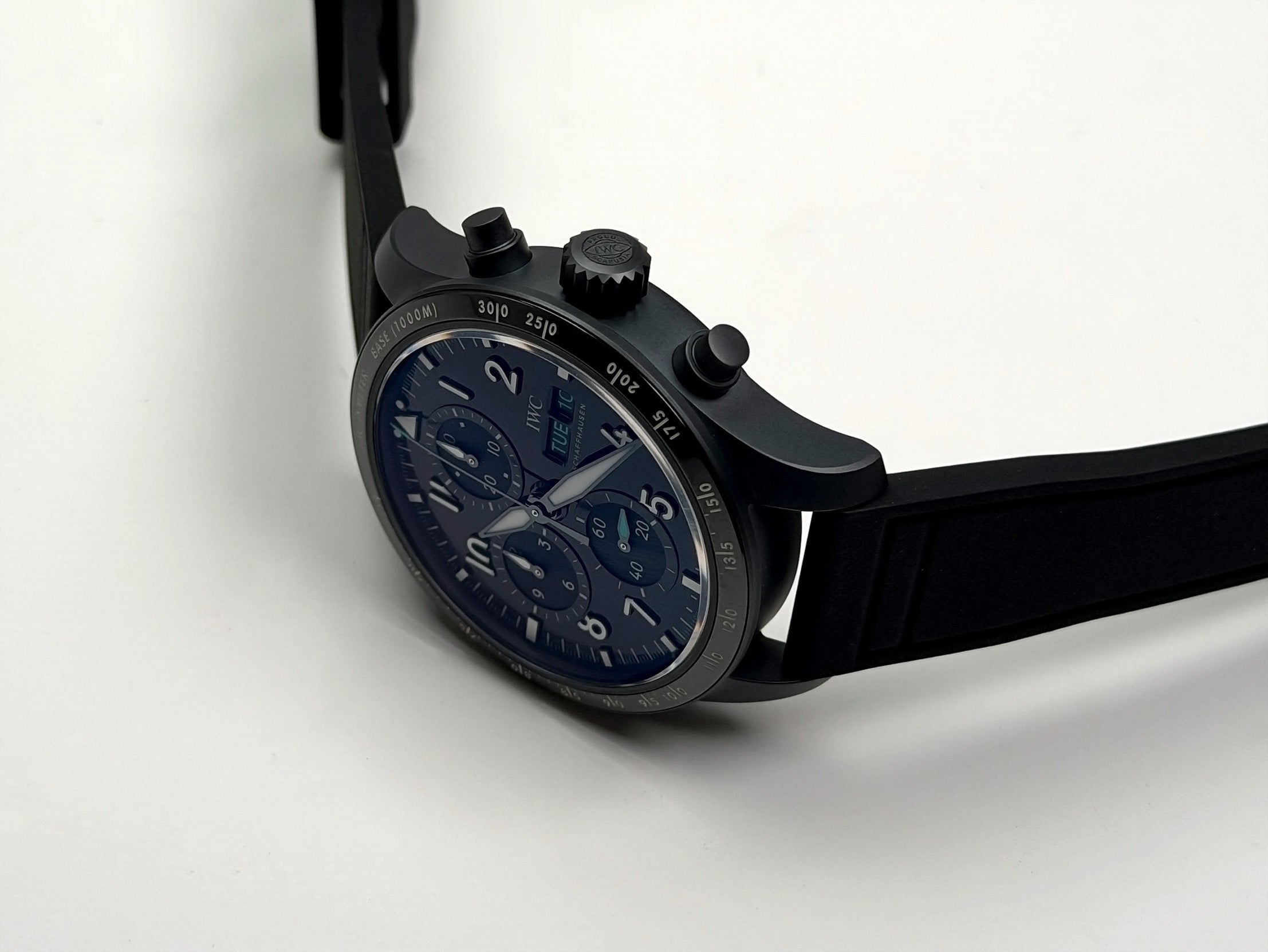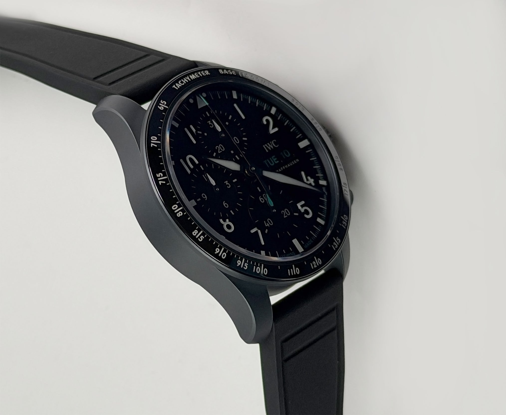 The case is made of ceratanium material (combination of ceramic and titanium) which is a lightweight and scratch resistant material by IWC. Mounted atop is a ceramic tachymeter scale bezel. It is paired with a black rubber strap with tang buckle.