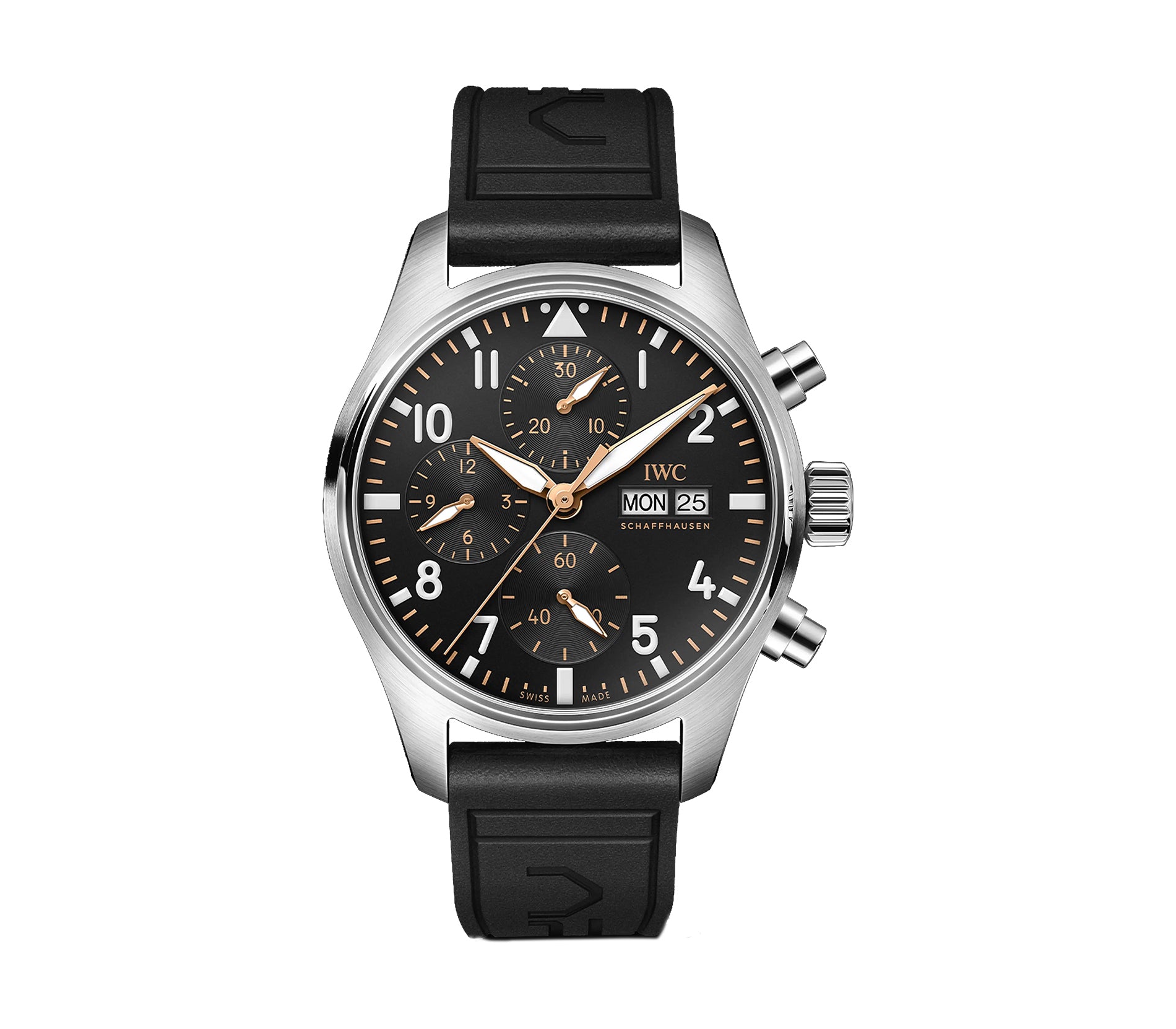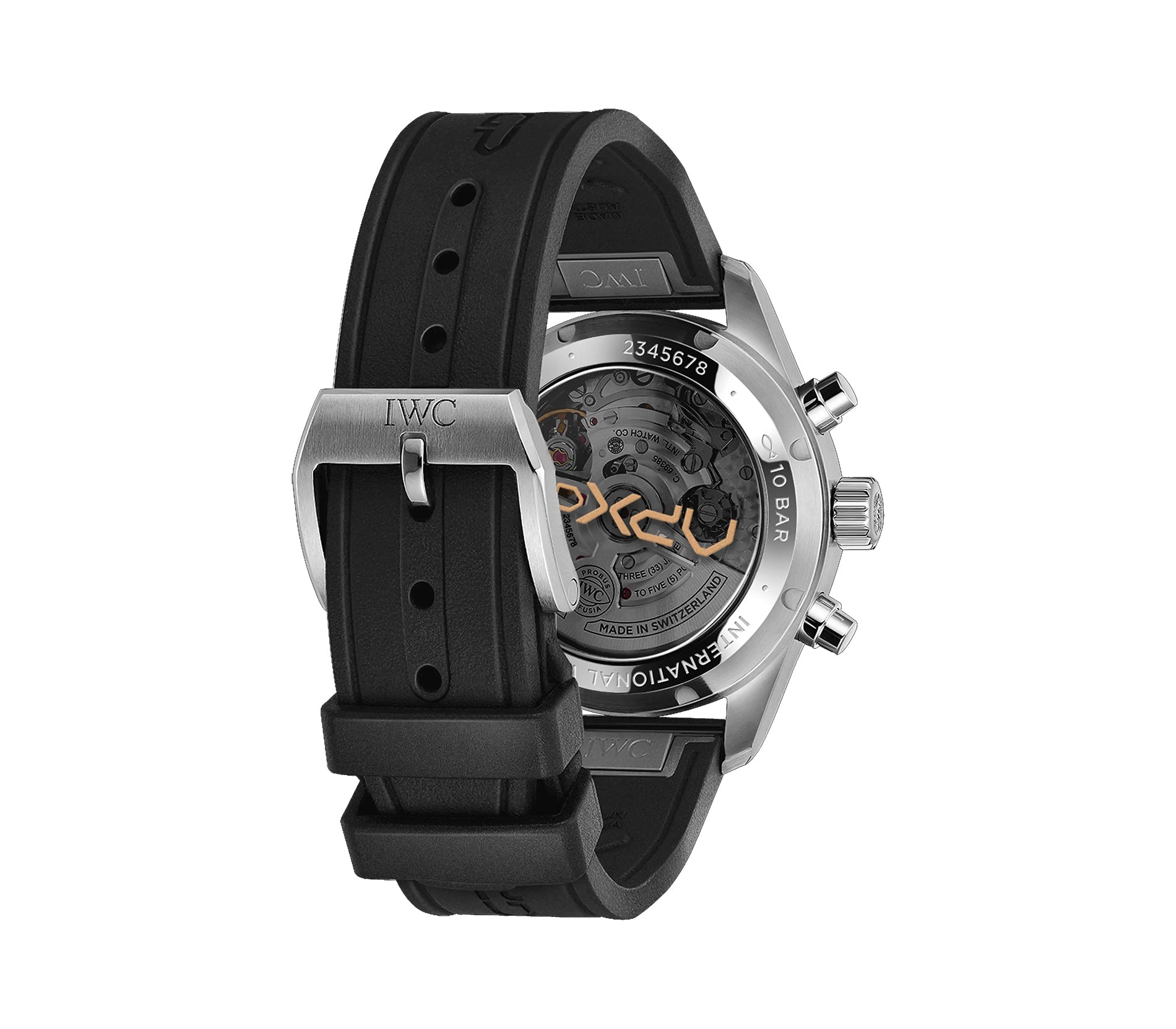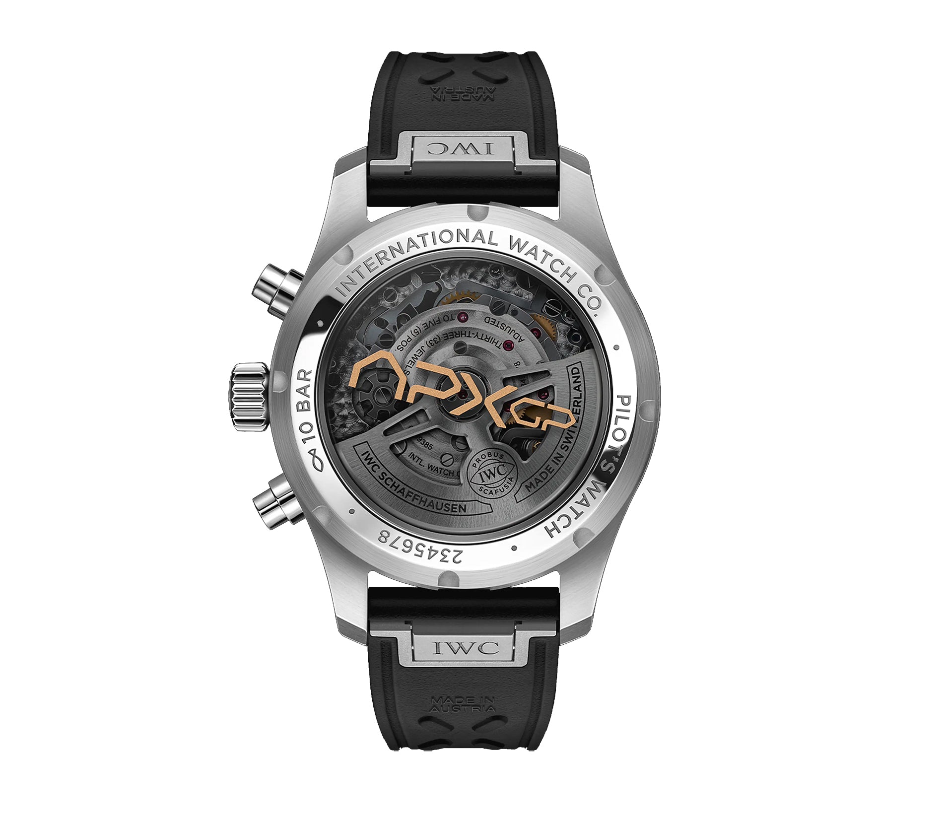 Case is made of mostly satin finished stainless steel with hints of mirror finished stainless steel here and there and is equipped with a see through sapphire glass back. Caseback has APXGP logo from the Movie F1. Mounted on the watch is an IWC black rubber strap with an IWC stainless steel tang buckle.